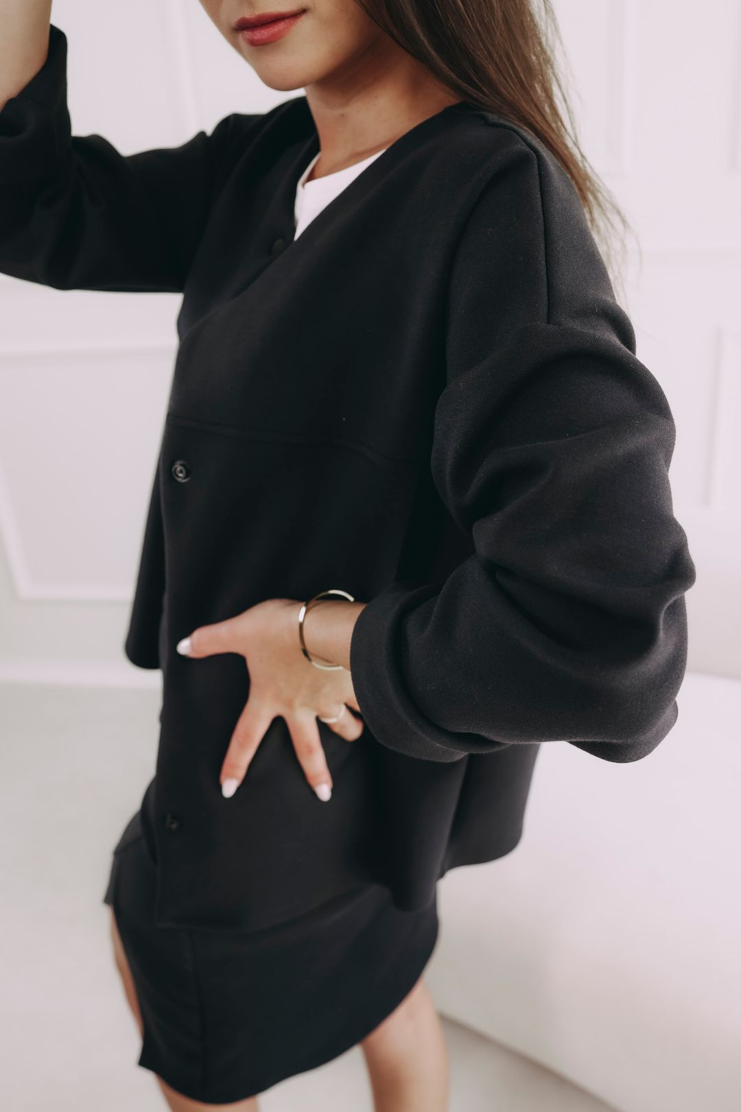 Oversized strih mu dáva uvoľnený charakter, no pritom si drží eleganciu, ktorá nepodlieha módnym trendom. Vyhrňovacie rukávy a pohodlný materiál pridávajú praktickosť, takže sa v ňom môžete cítiť slobodne aj vtedy, keď vyzeráte dokonale upravene. S týmto blejzrom sa nemusíte rozhodovať medzi štýlom a komfortom, pretože dostanete oboje naraz a ešte s ľahkým nadhľadom.