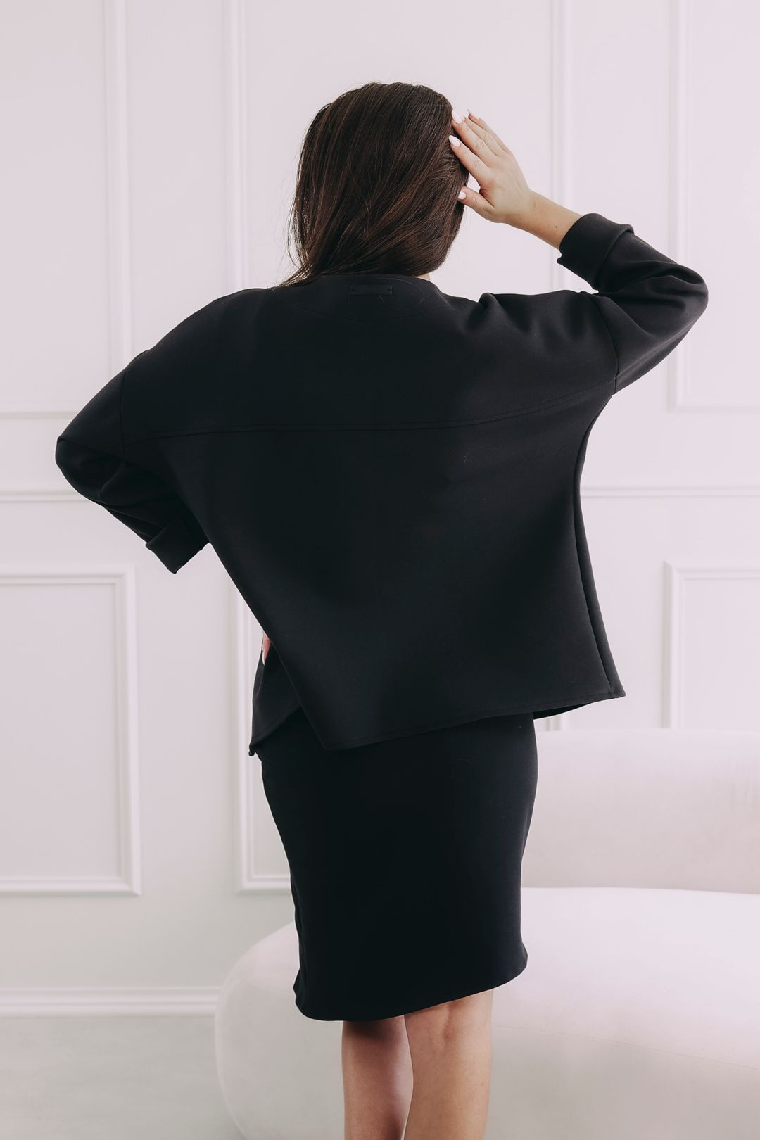 Určite! Materiál s vyššou gramážou z neho robí praktickú vrchnú vrstvu na jar a jeseň. V zime sa dá nosiť pod kabátom ako elegantný prvok, ktorý udrží outfit upravený aj v mrazivom počasí.