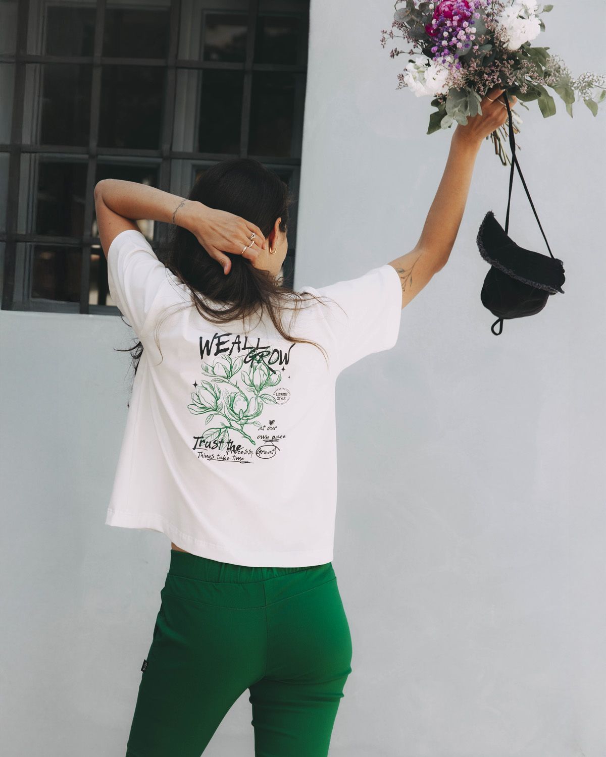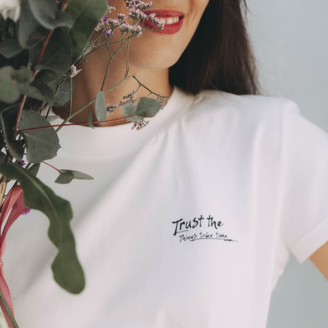 Zelené kvety a decentné pripomenutie, že „Things take time“ a „Trust the Process“, hovorí za vás. Žiadny tlak, žiadny zhon. Len pomalý rast, presne ako to potrebujete. Pretože každé obdobie má svoj význam – aj to, kedy nič nekvitne.