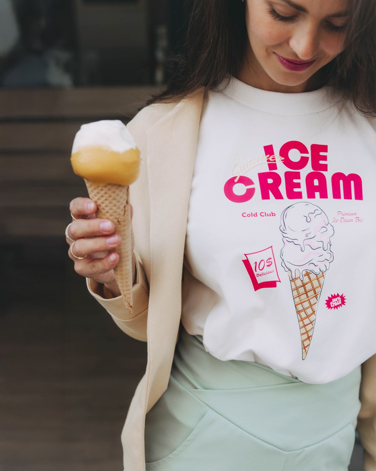 Mierne roztečená zmrzlina je jasným oznámením, že nie je potrebné byť za každú cenu perfektná. Trocha chaosu, trocha toho kvapkania, ale s gráciou. Na letné dni, kedy je všetko trochu „melted“, ale vy sa tým nenecháte rozhodiť.