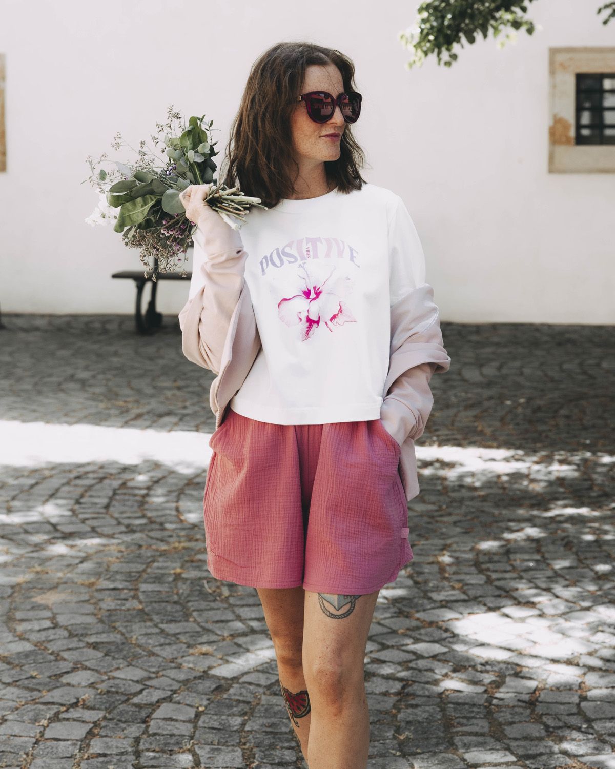 Outfit: tričko Mood White Positive Vibes, kraťasy Akosua Rose