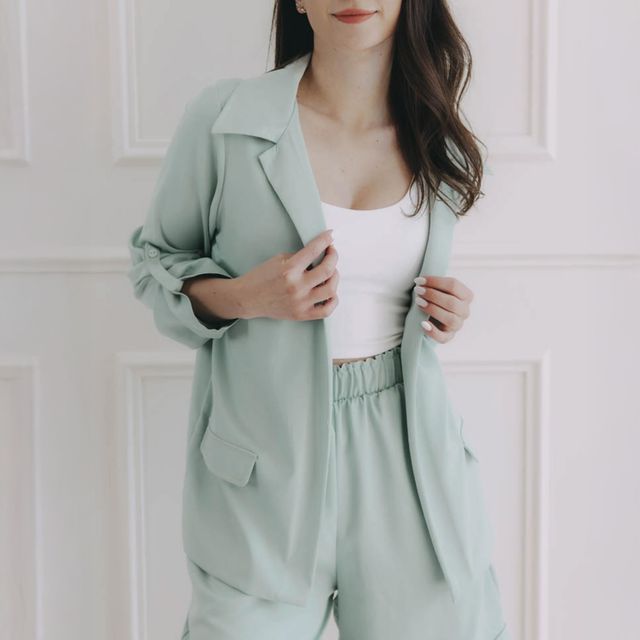 Outfit: tričko Mood White Matcha, sačko Chima Matcha, nohavice Zen Smaragd