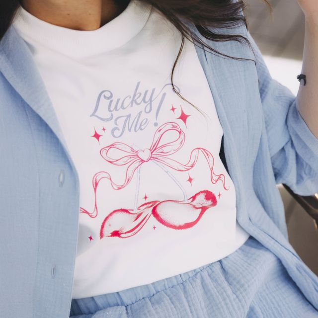 Dve čerešne, trocha retro estetiky a jeden sebavedomý výkrik „Lucky me!“ – ako pripomienka, že šťastie nie je žiadna náhoda. Niekedy je to jednoducho postoj. Alebo dobre zvolený outfit. Ten váš.