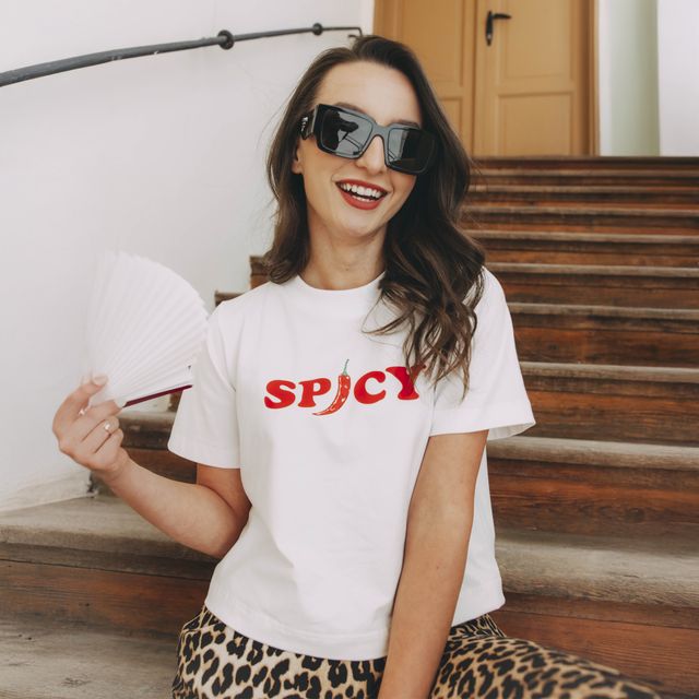 Výrazný nápis, v ktorom je paprička miesto „i“, vám z trička urobí statement. Spicy nie je len chuť. Je to vibe. Pre všetkých, ktorí vedia byť šťavnato drzí a nikdy nevypadnú z role. Kto majú oheň vo vnútri, ale úsmev ich zdobí navonok.