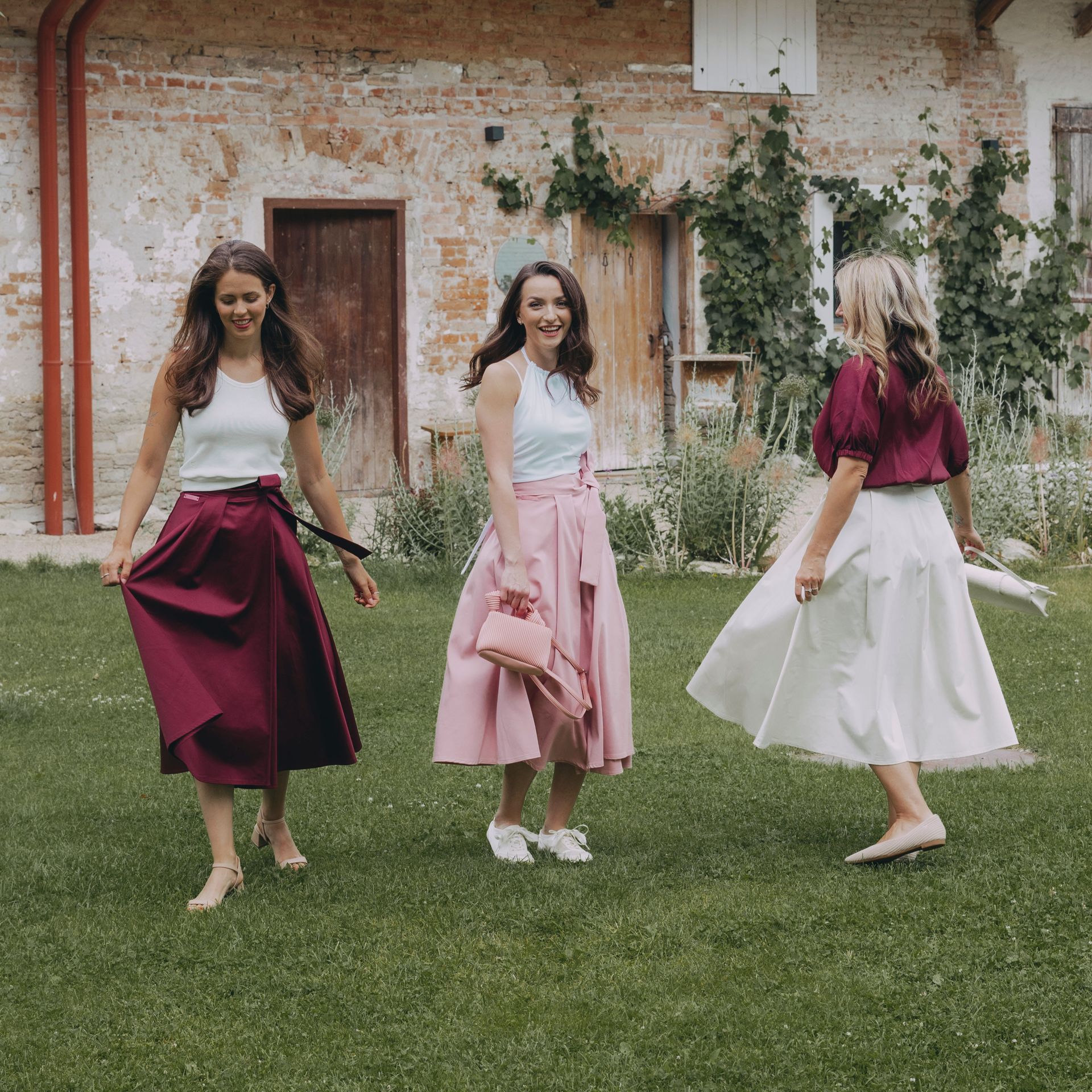My máme radi napríklad maslový odtieň, ktorý si skvele rozumie s vínovým topom Geeti – tento look zvládne svadbu, ale pokojne aj vernisáž. Alebo bordó variant sukne, ktorá vyzerá skvele s jednoduchým tielkom Muru – bielym, hladkým, ale vôbec nie nudným. A pre tie, ktoré túžia po troche nehy, je tu odtieň Mawe old pink – v kombinácii s topom Adenike vzniká outfit, ktorý hovorí: Som v pohode a jasné, že mám štýl.