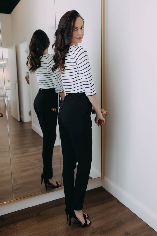 Na Ivči môžete vidieť nohavice Malika vo verzii Black i Denim a dlhoročné stálice Reece vo verzii New Black s vyšším pásom. Padlo vám očko aj na hravú cropnutú krásku? Je to košeľa Walid Ecru.