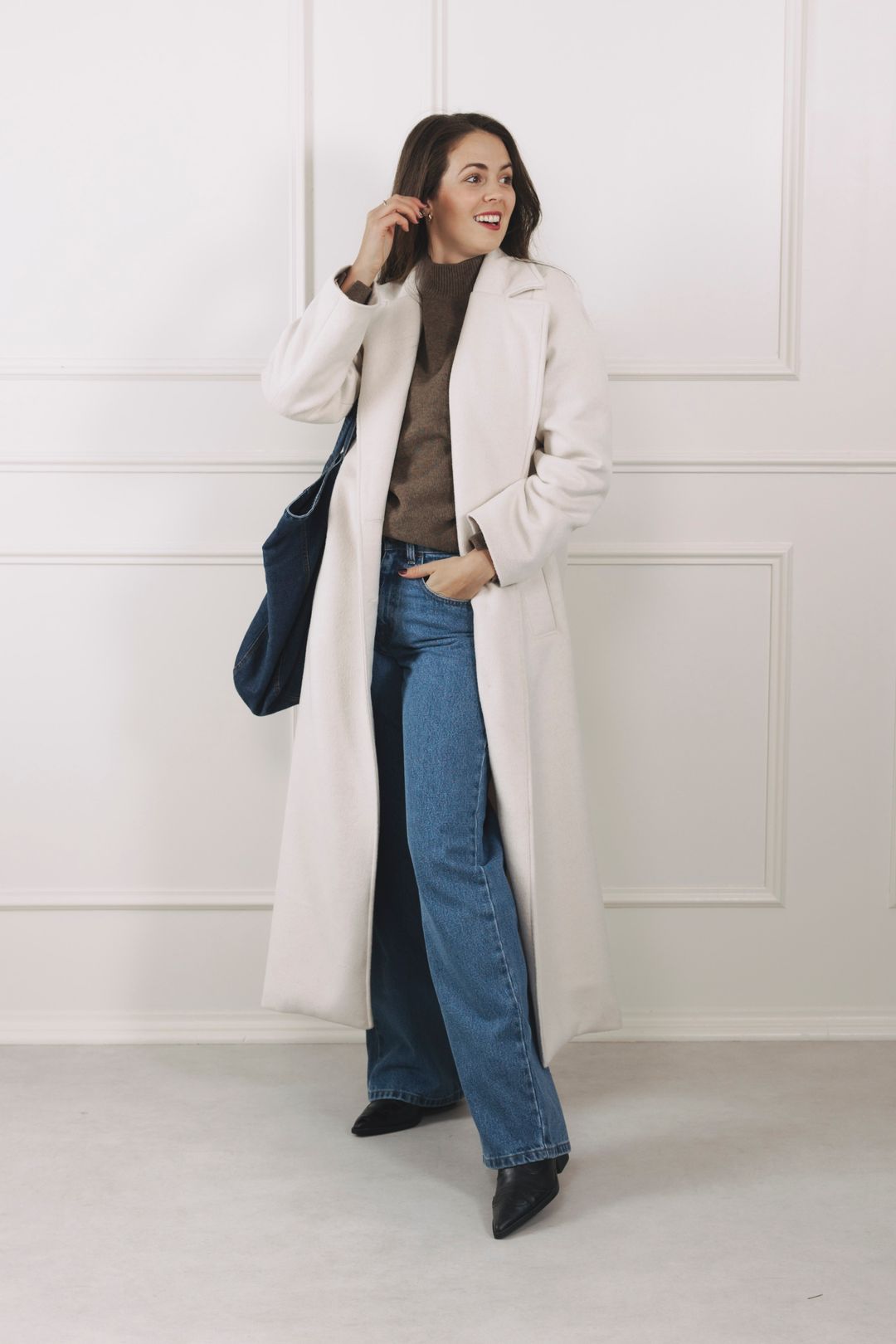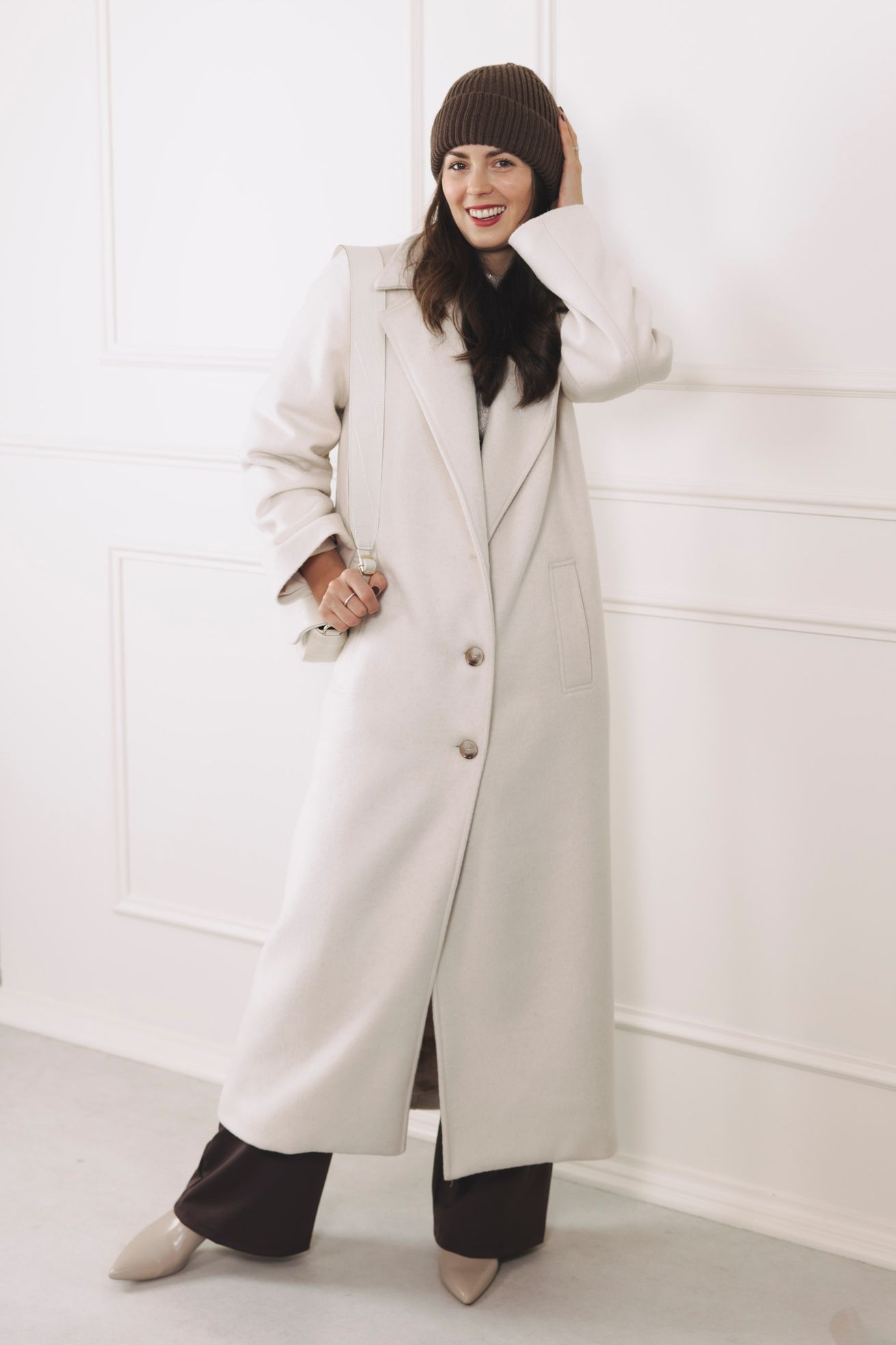 Dlhý krémový kabát Amisi s podielom vlny vás premení na ženu s dokonalým štýlom, nech sa prechádzate po elegantných parížskych uliciach alebo len mierite do práce.