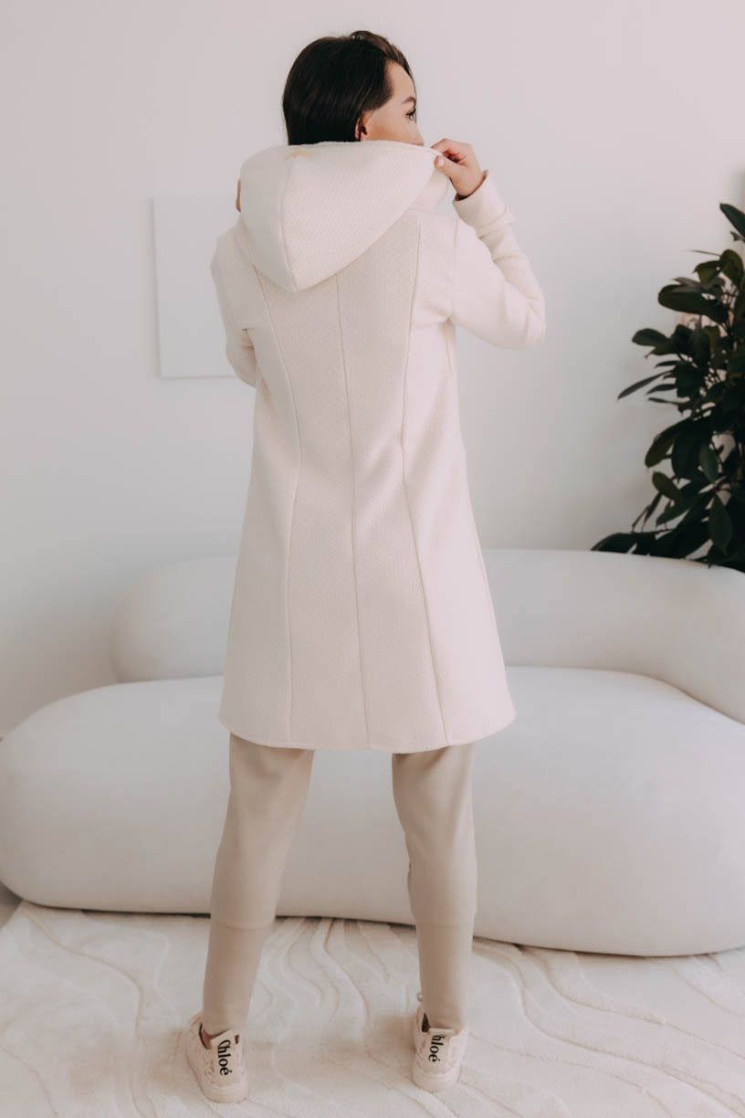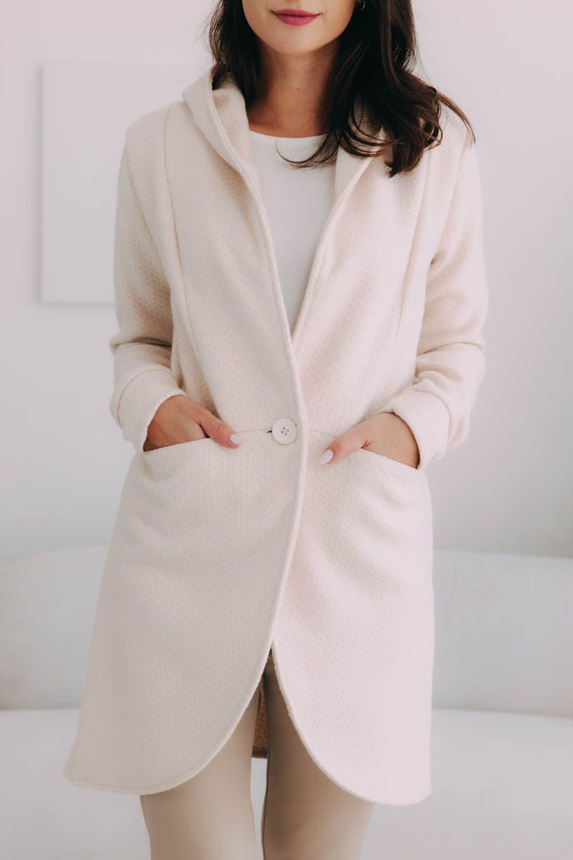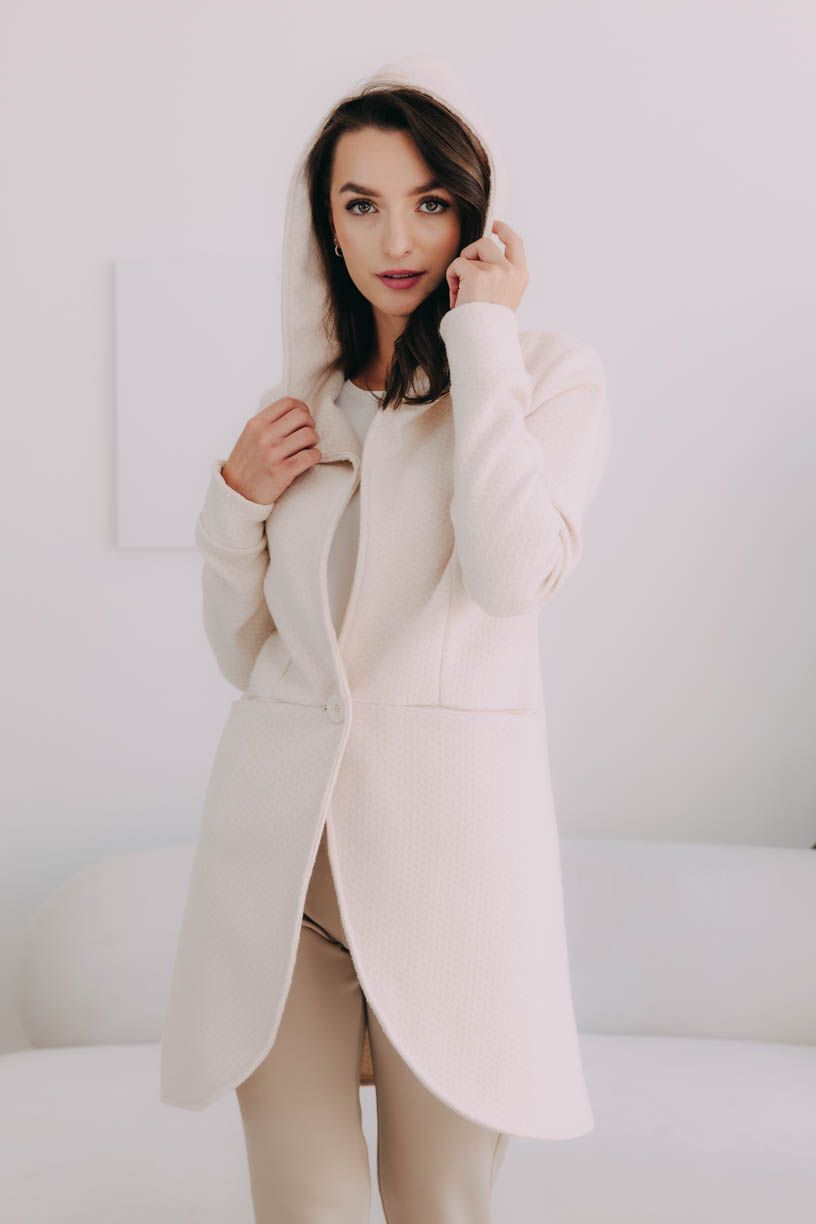 Hravú, ale decentnú kapucňu prehodíte cez vlasy, keď práve fúkne, ruky a pár drobností schováte do šikovne skrytých vreciek. Krásne ženský strih podčiarkne vašu siluetu a krémová farba je natoľko univerzálna, že kabátik vynosíte ako v štýle kapsulovom, tak s celým radom vašich obľúbených farieb.