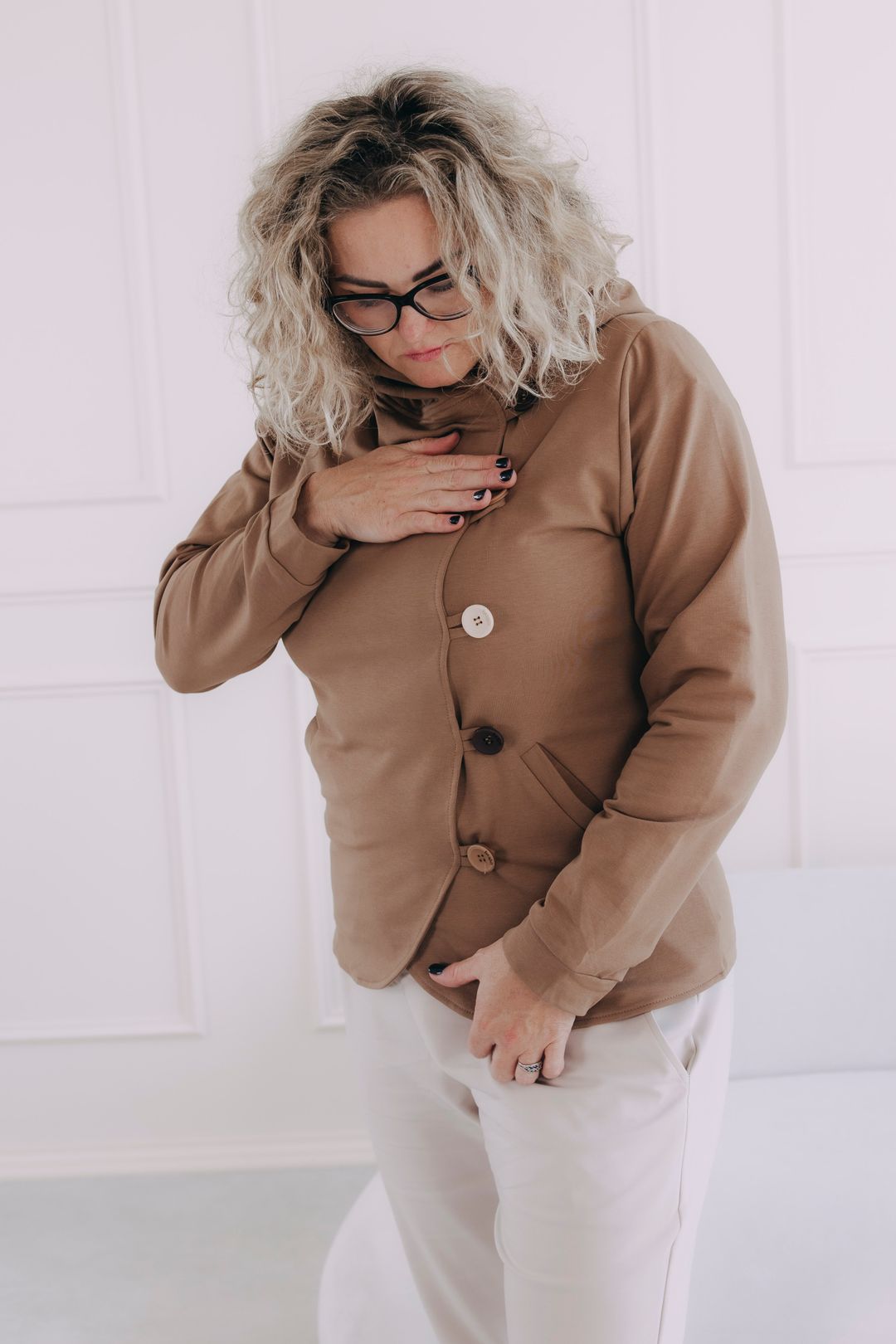 Ušili sme ho na vaše prianie z bavlny a elastanu, ktorá vás zahreje v chladných jarných dňoch a zároveň vám dodá elegantný štýl. Camel farba je nadčasová a dokonale zapadne do akéhokoľvek outfitu – skvele sa kombinuje s jemnými pastelovými tónmi, ale aj s kontrastnou čiernou alebo čiervenou.