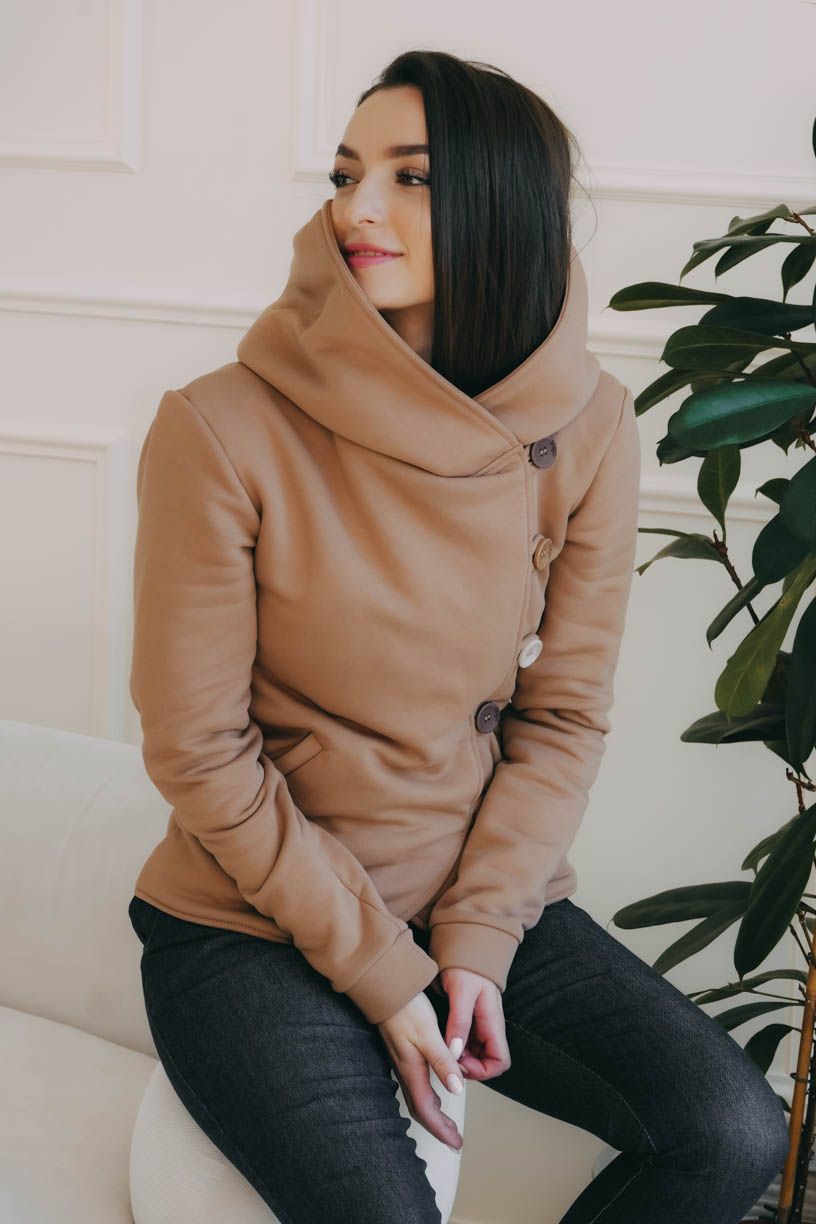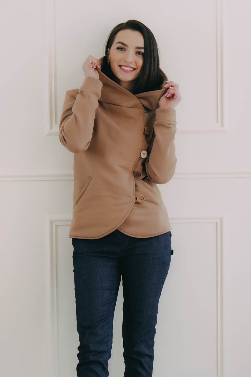 Kabátik Dream je všetko: pohodlný a šik. Pýši sa mohutnou kapucňou a hravými gombíkmi až ku krku.