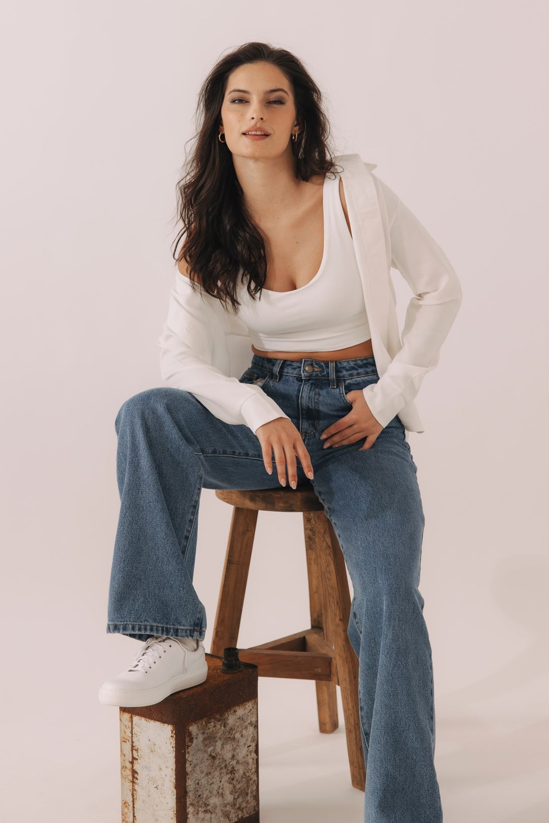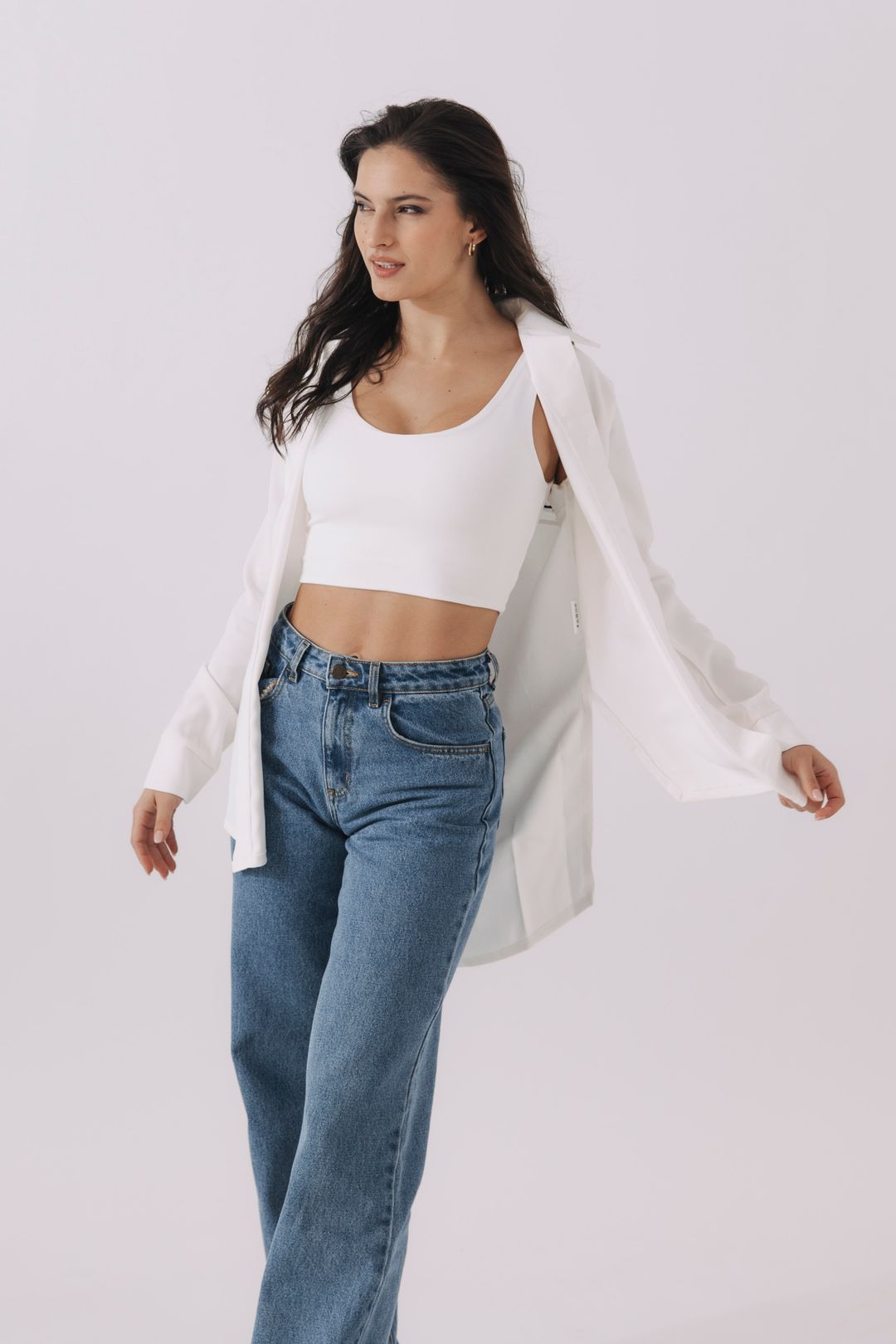 - Jednoduchá elegancia: Zastrčte ju do nohavíc s vysokým pásom a doplňte oversized sakom alebo jemným svetríkom, spod ktorého decentne vykúka golier. Pre doladený outfit pridajte úzky opasok a mokasíny.