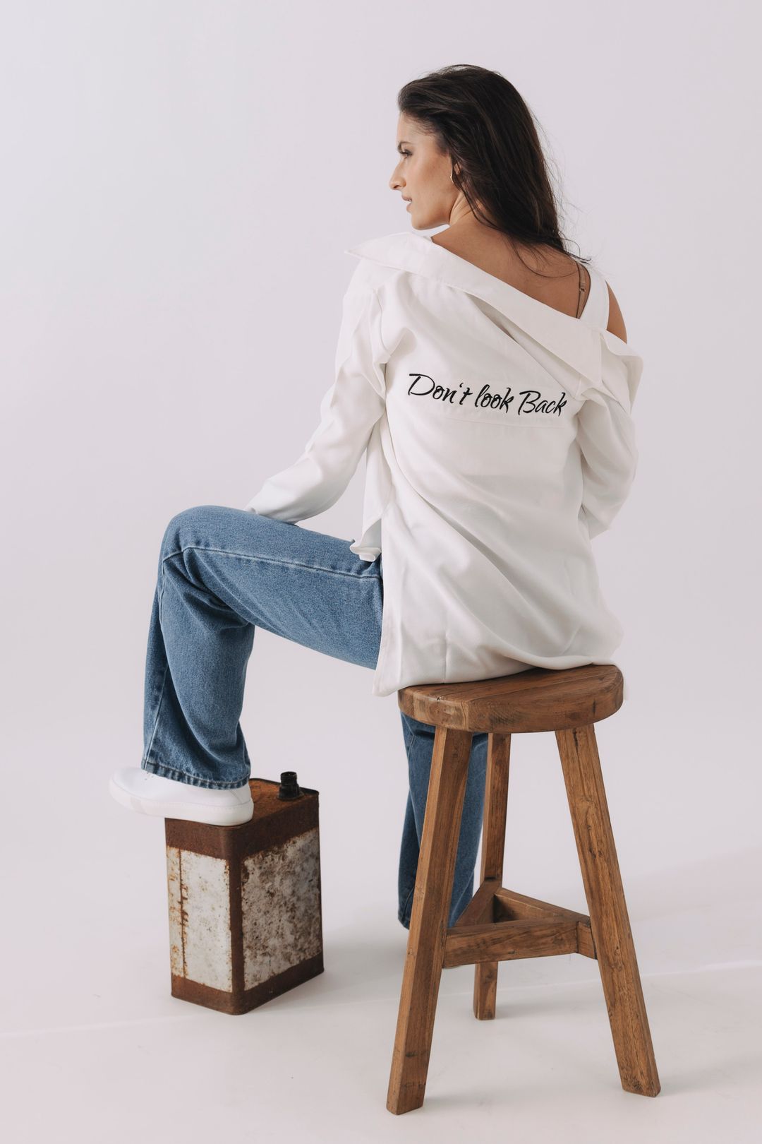 New Tawia „Don’t Look Back“: Biela košeľa s odkazom