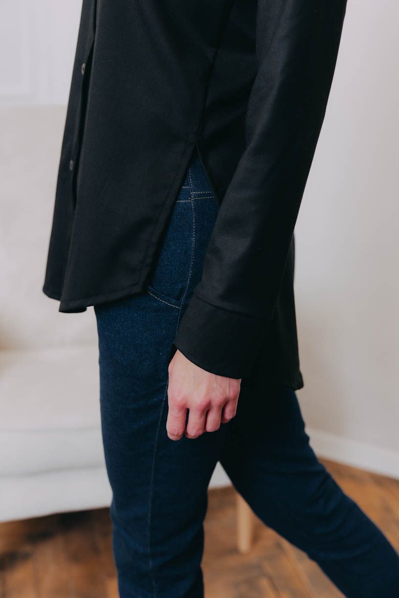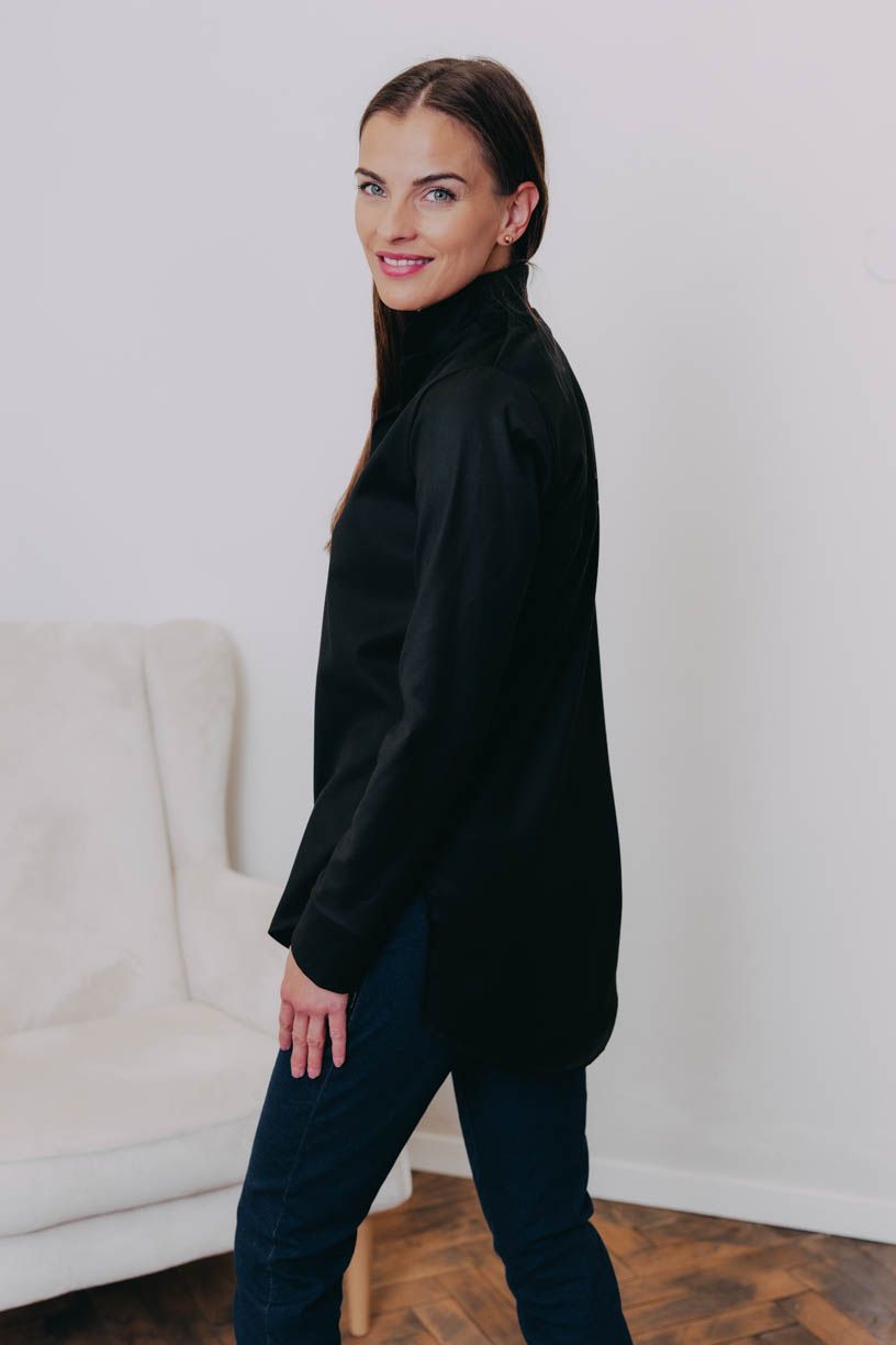Košeľa je pružná, v spodnej časti strihaná doguľata a jemne priliehavá, aby pekne kopírovala postavu. Bočné rozparky sme navrhli pre lepšie zastrčenie do nohavíc, ale ktovie, ako ich využijete vy, keď necháte voľnú ruku fantázii. Jedno je isté. Či budete v ležérnej košeli a mikine, alebo pôjdete za slušnú dámu v saku, ručíme za radosť z nosenia v každej situácii.