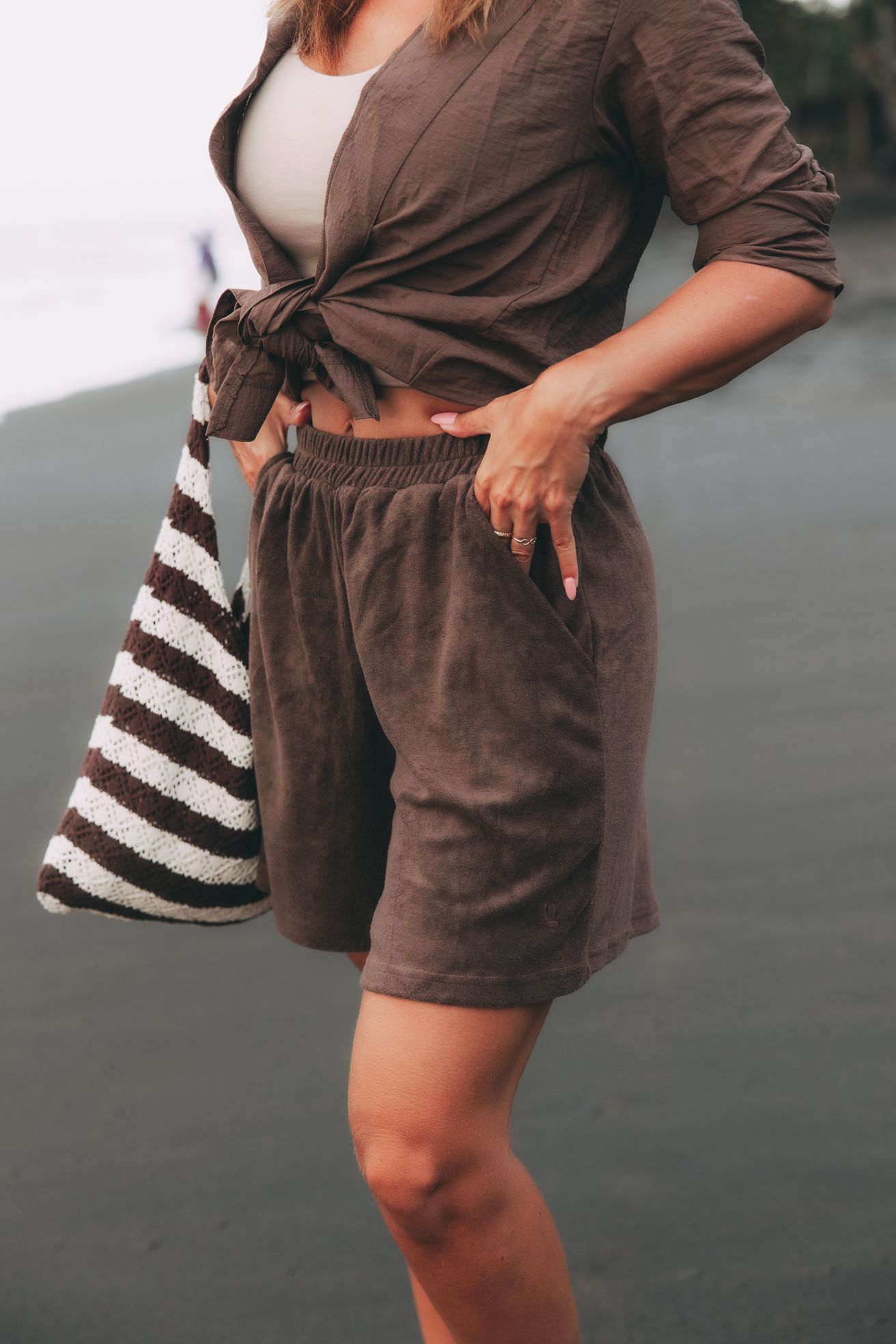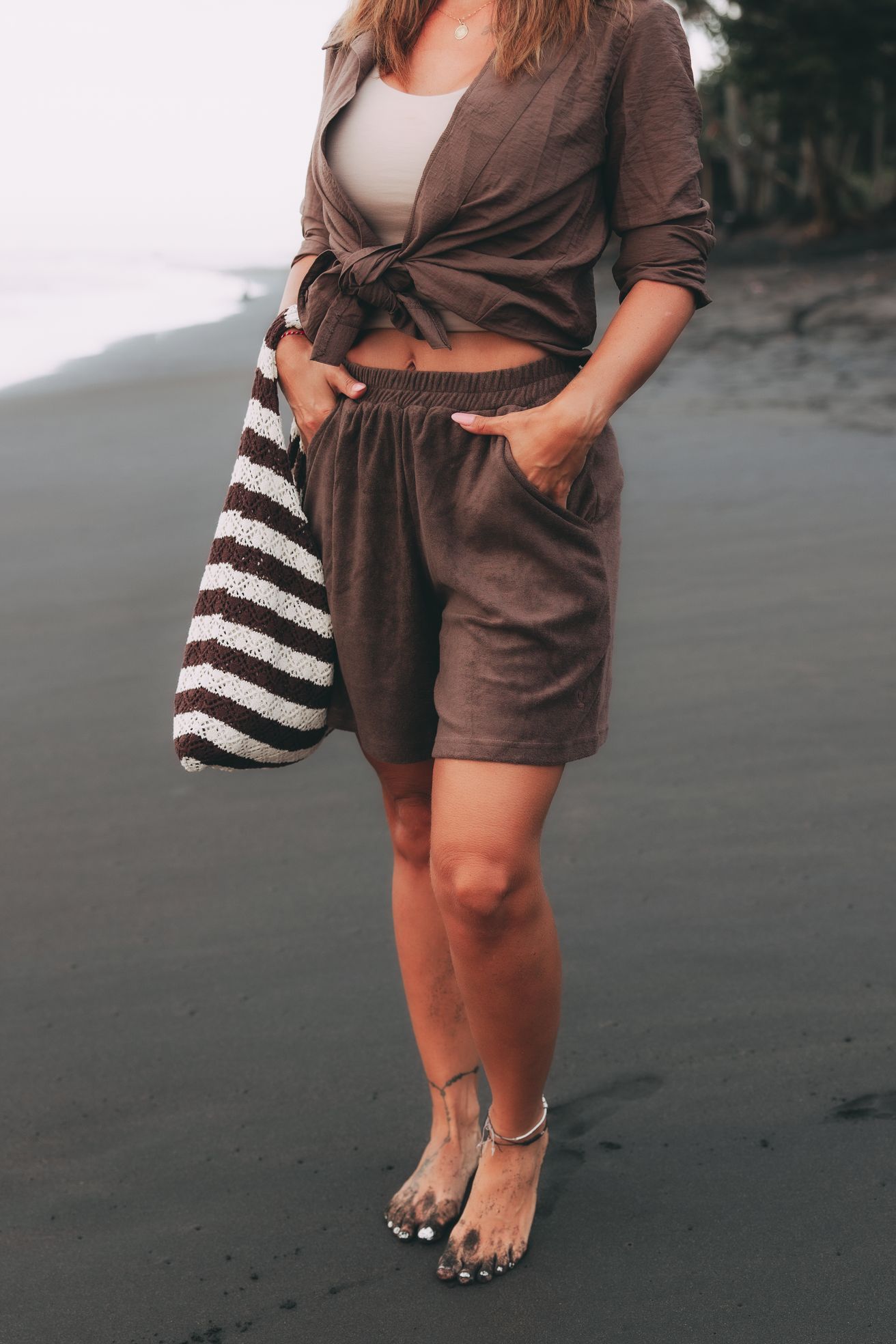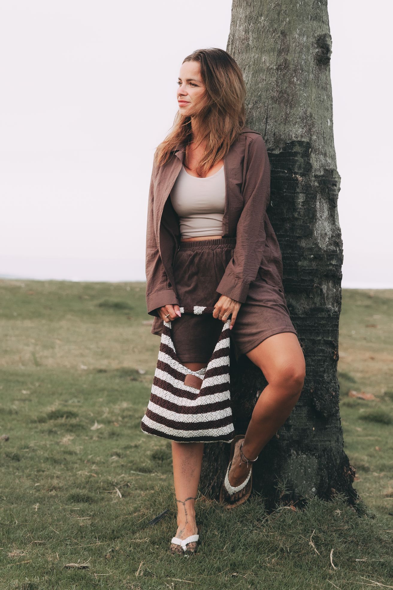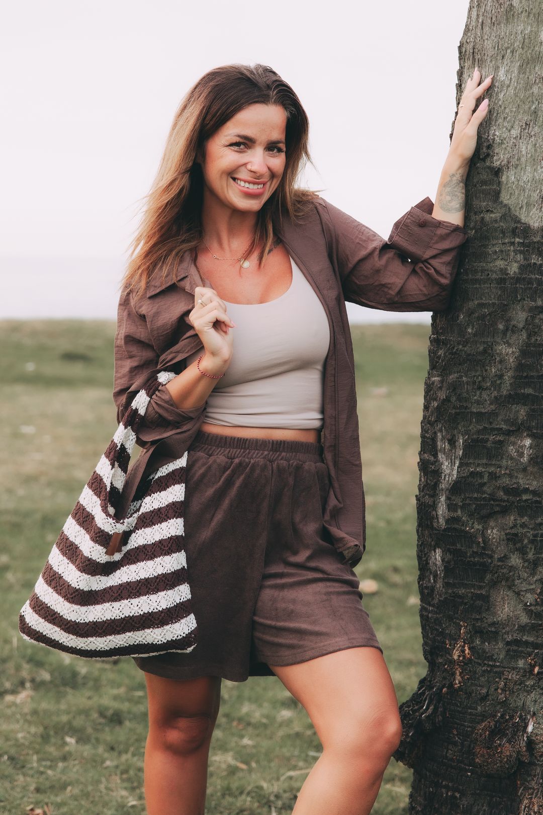 - K moru: Pre perfektný plážový vzhľad skombinujte kraťasy s ľahkým svetlým topom Hema a pre prípad chladnejšieho vánku pridajte hnedú košeľu Gauri. Nezabudnite na priestrannú plážovú tašku Leya na všetky vaše nevyhnutnosti, ako sú uteráky a opaľovacie krémy.