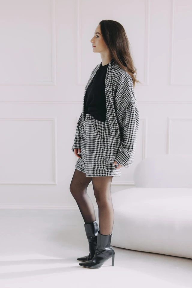 Jeseň v kraťasoch? Prečo nie! Odvážny, no úplne nositeľný look, ktorý dokazuje, že štýl sa chladného počasia nezľakne. Hrejivá recyklovaná zmes a štipka elegancie pre váš udržateľný šatník.