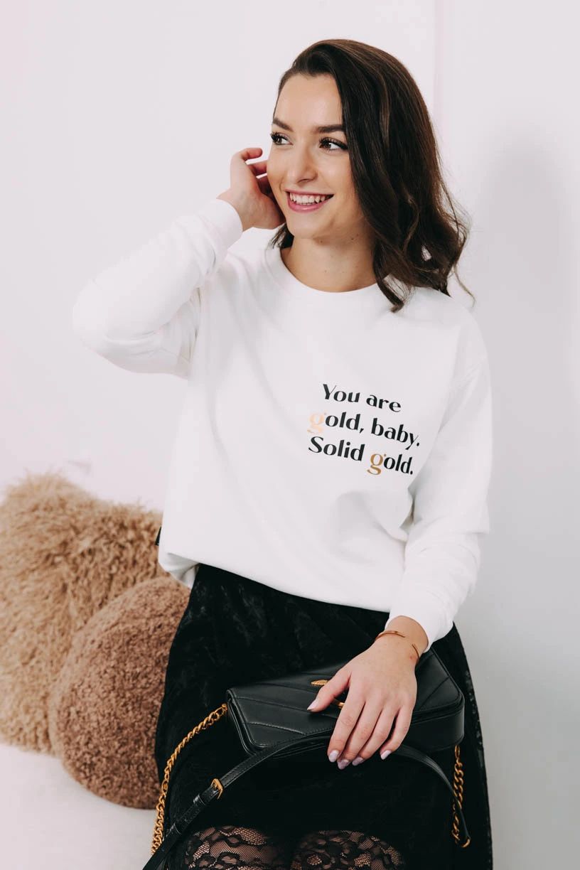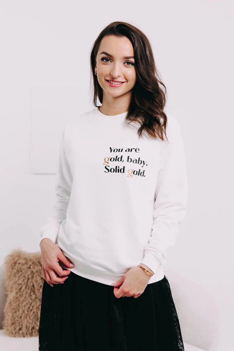 Mikina Asata z príjemnej bavlny a v trendy ecru farbe osloví každého, kto rád hovorí bez slov. Nápis „You are gold, baby. Solid gold.“ totiž hovorí za všetko.