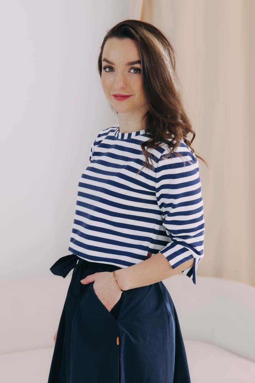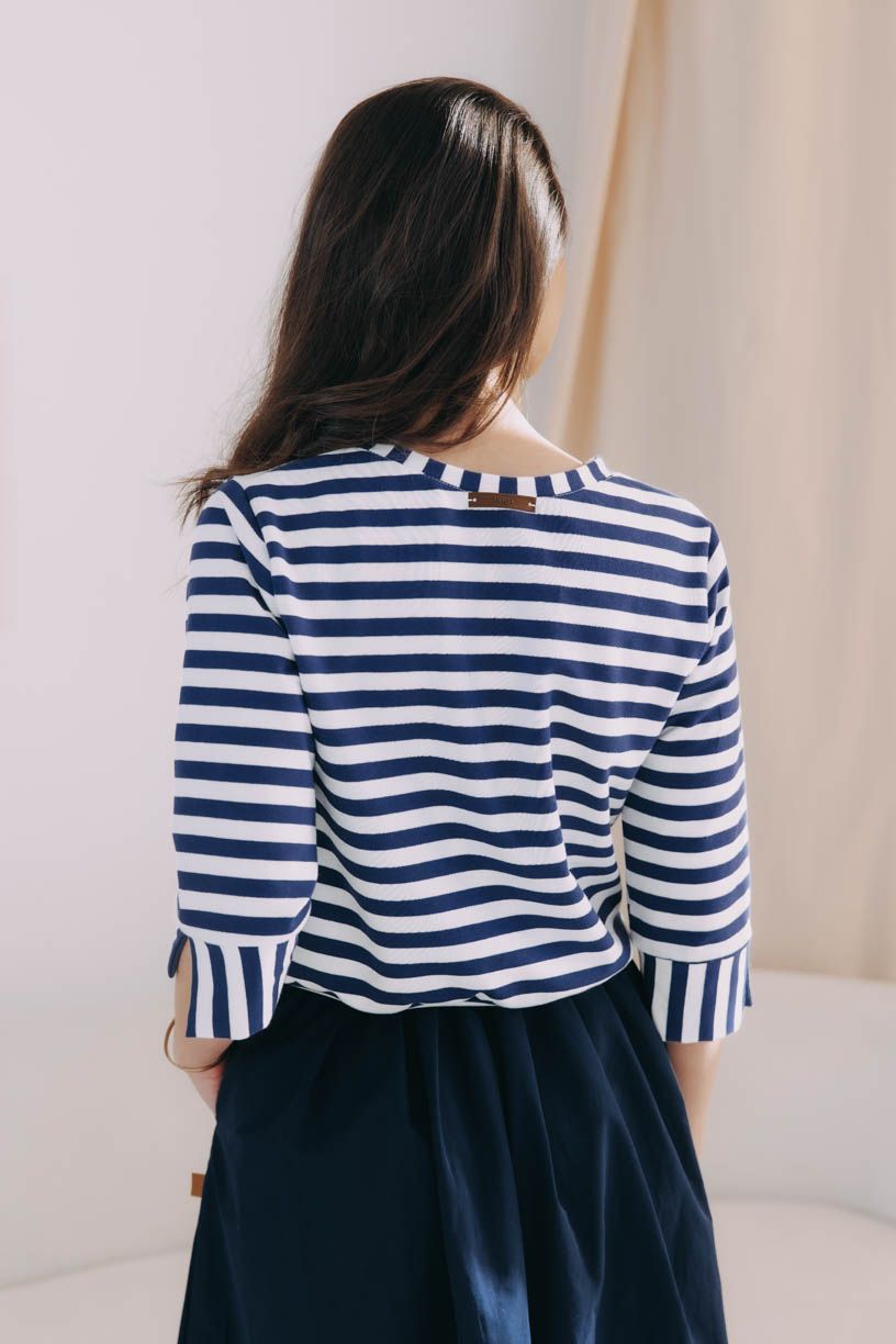 Námornícke prúžky sú jednoducho módnym must-have. Mikina Ejike s malinkým červeným srdiečkom je určite kandidát na víťaza v kategórii „Navy Stripe“.