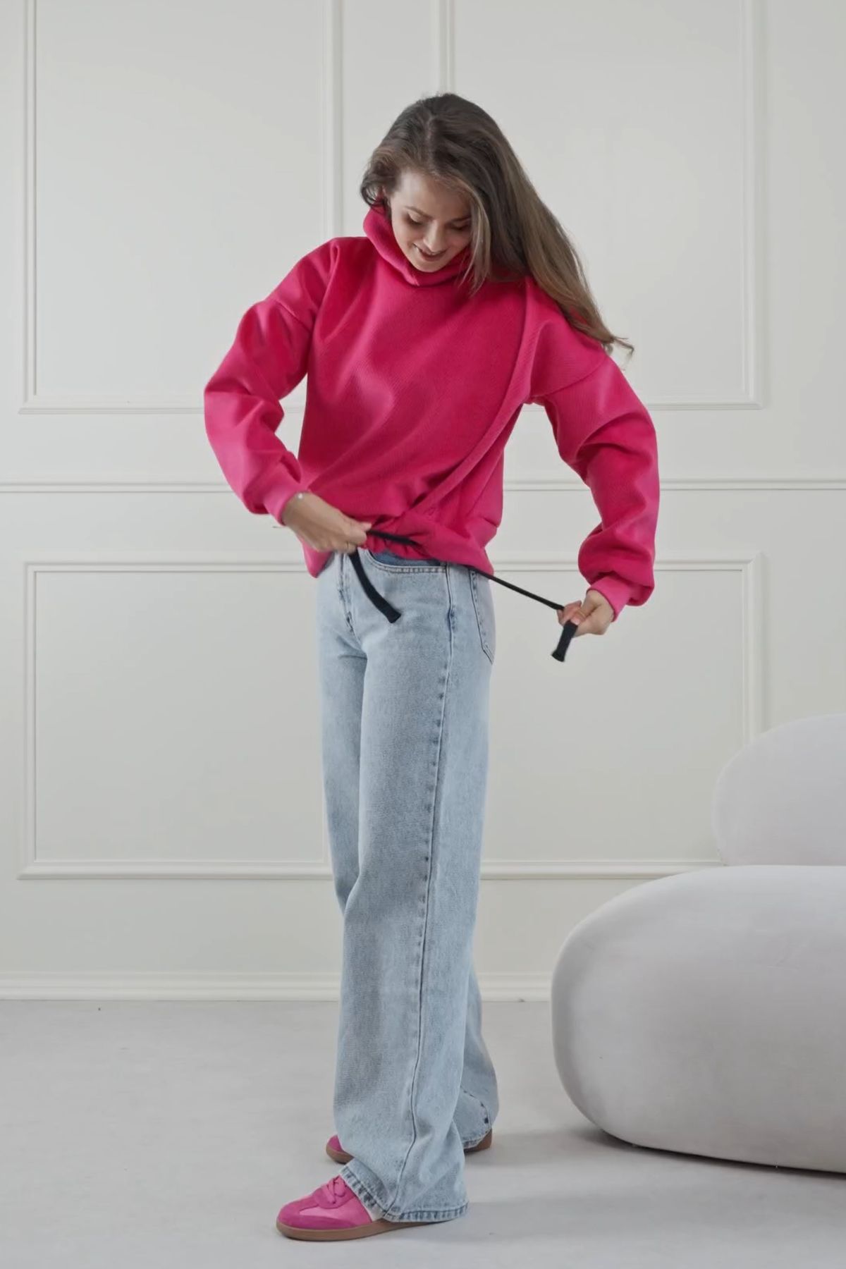 Pre voľný, ležérny look: Vyberte si svoju bežnú veľkosť. Mikina má mierne oversized strih, takže aj vaša štandardná veľkosť bude pôsobiť voľne a pohodlne. Skvele sa hodí k legínam alebo úzkym nohaviciam.
