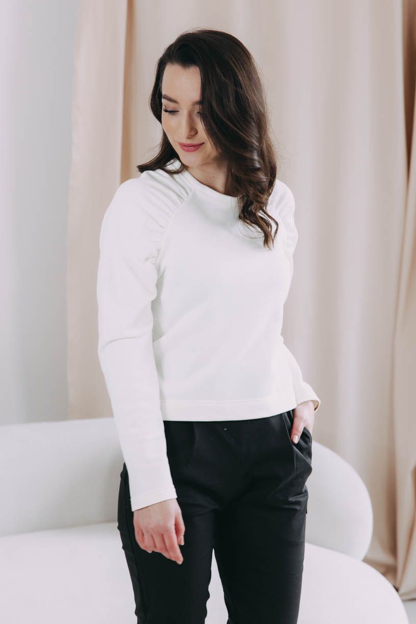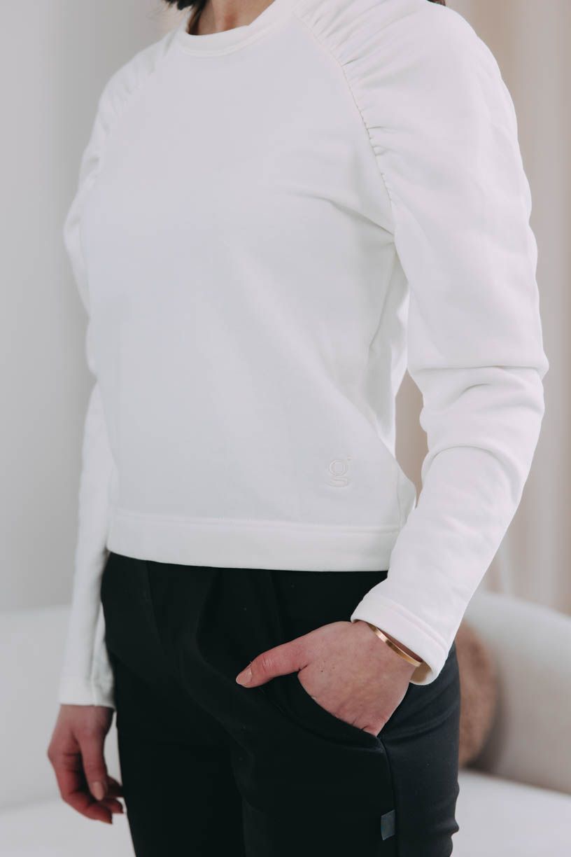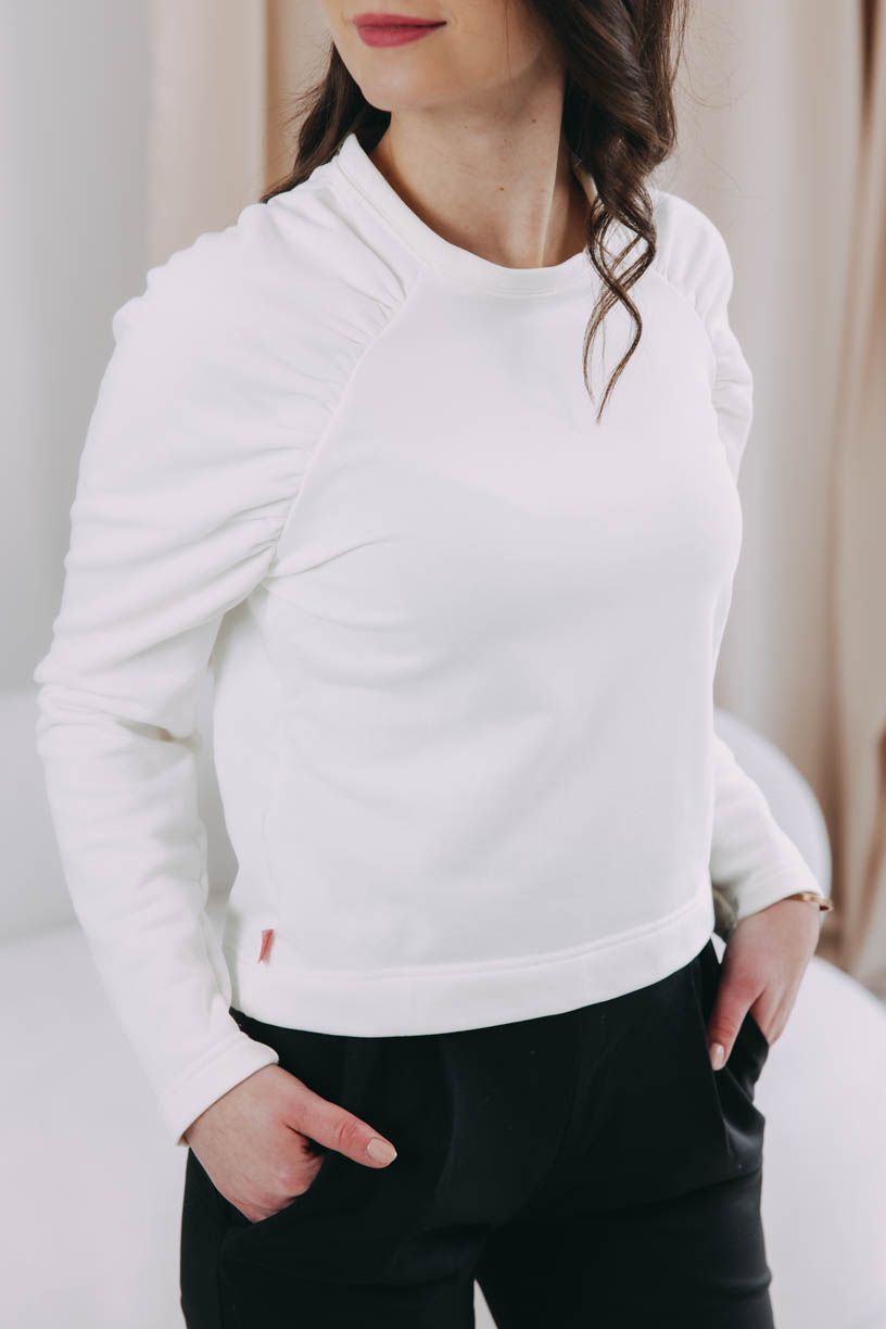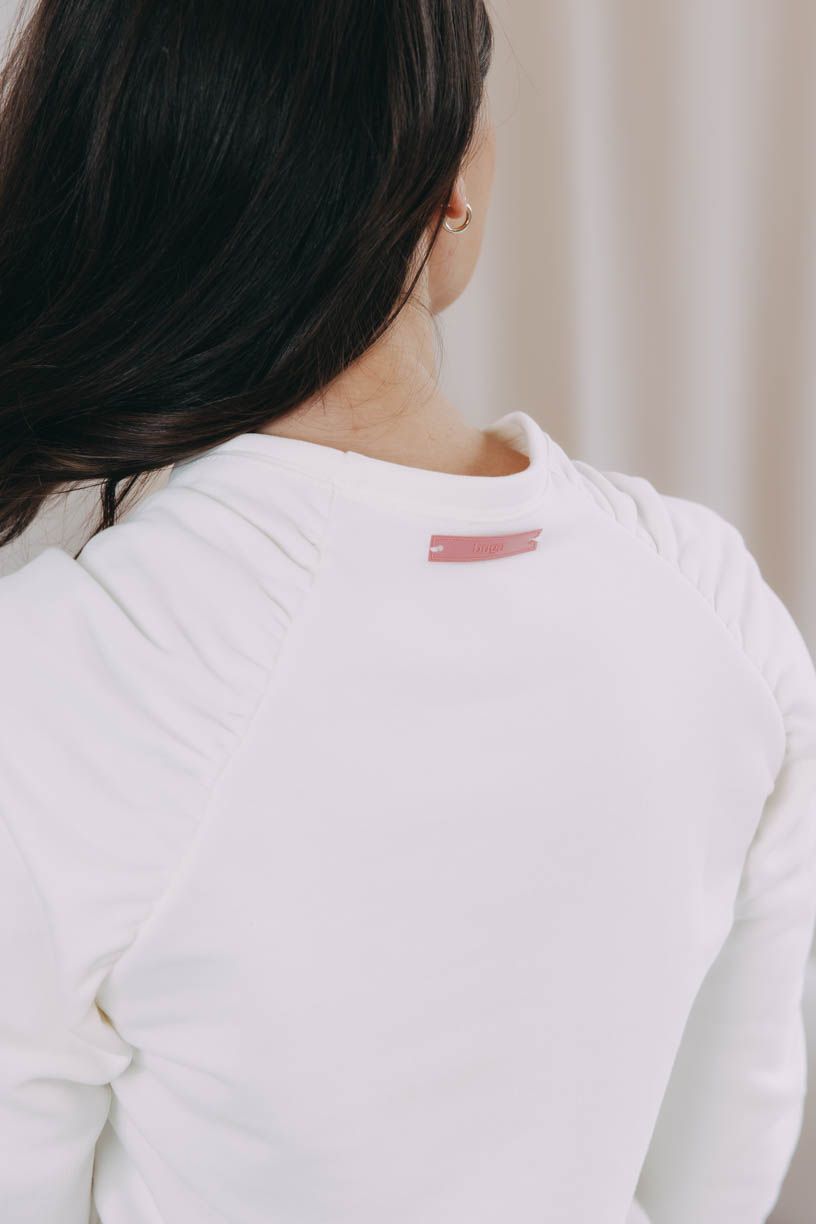 Mikina Zaila si zaslúži pozornosť pre svoje nariasené raglánové rukávy aj kratšiu dĺžku, vďaka ktorej krásne vynikne váš pás. Krémový odtieň rozžiari každý outfit.