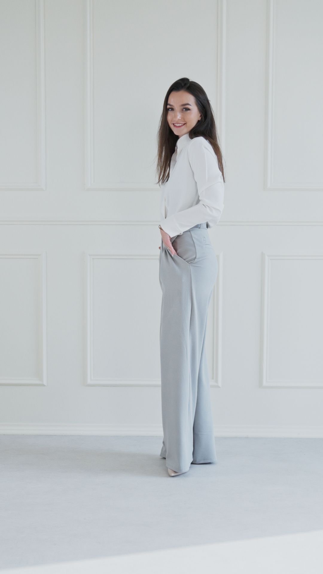 Nohavice Amadu sú univerzálne lichotivé. Vysoký pás opticky predlžuje nohy, zatiaľ čo široké nohavice a sklady vyrovnávajú siluetu, čo je skvelé najmä pre postavy typu hruška a presýpacie hodiny.