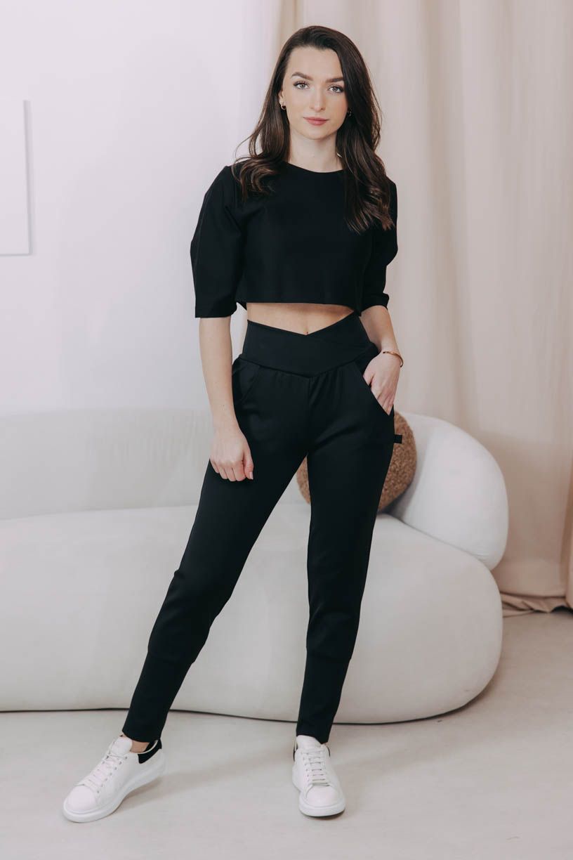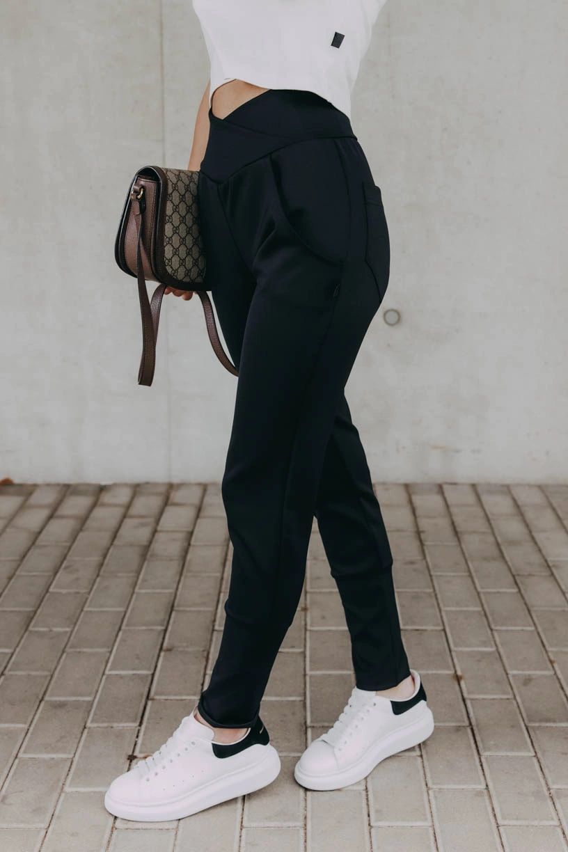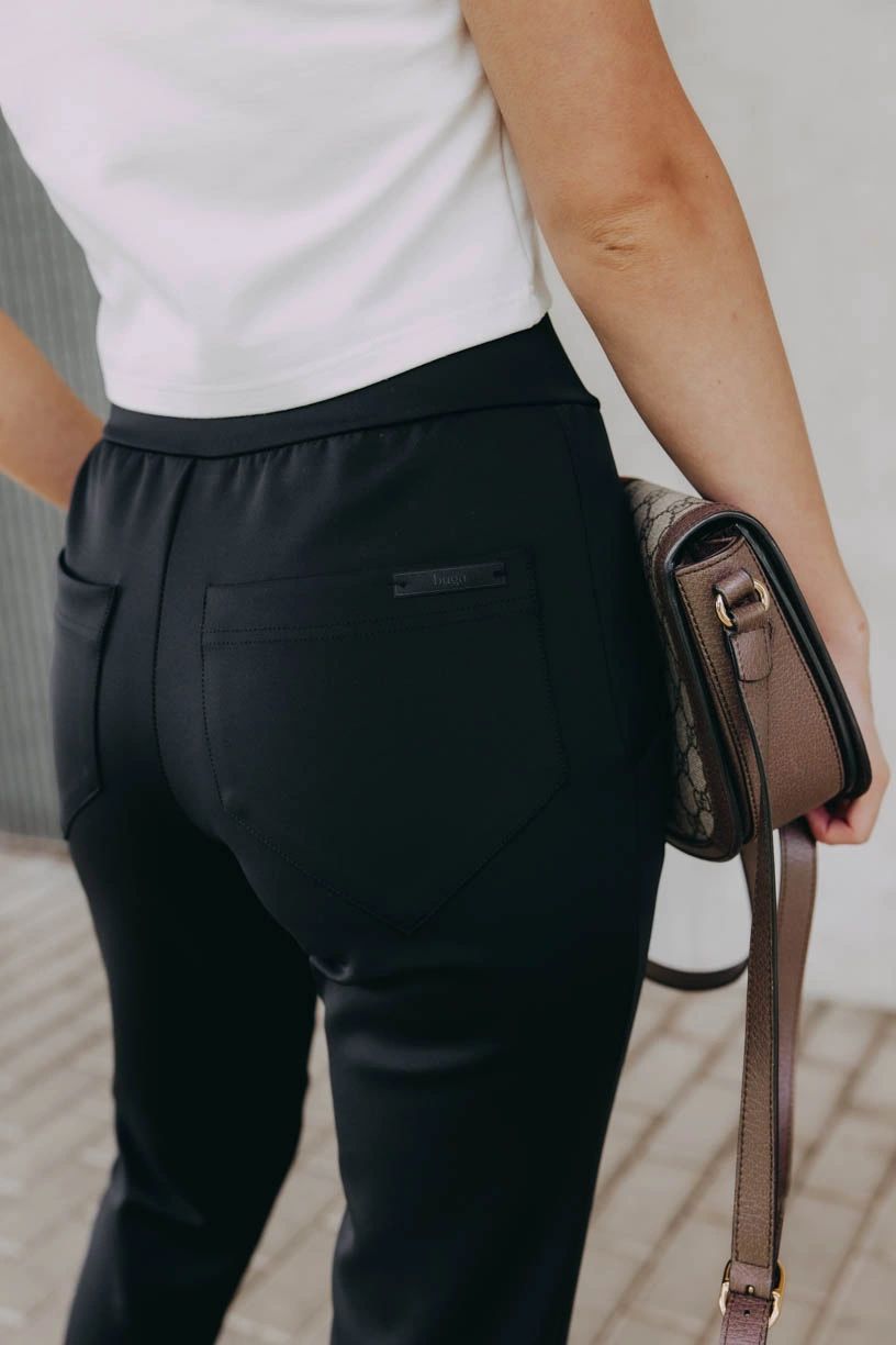 Čierne nohavice Kajumba s vysokým a efektne riešeným pásom krásne vykreslia vašu siluetu, nevyťahujú sa a vďaka vyššej gramáži látky sú skvelé aj na chladné dni.