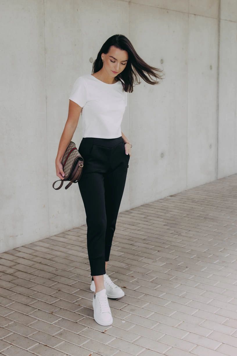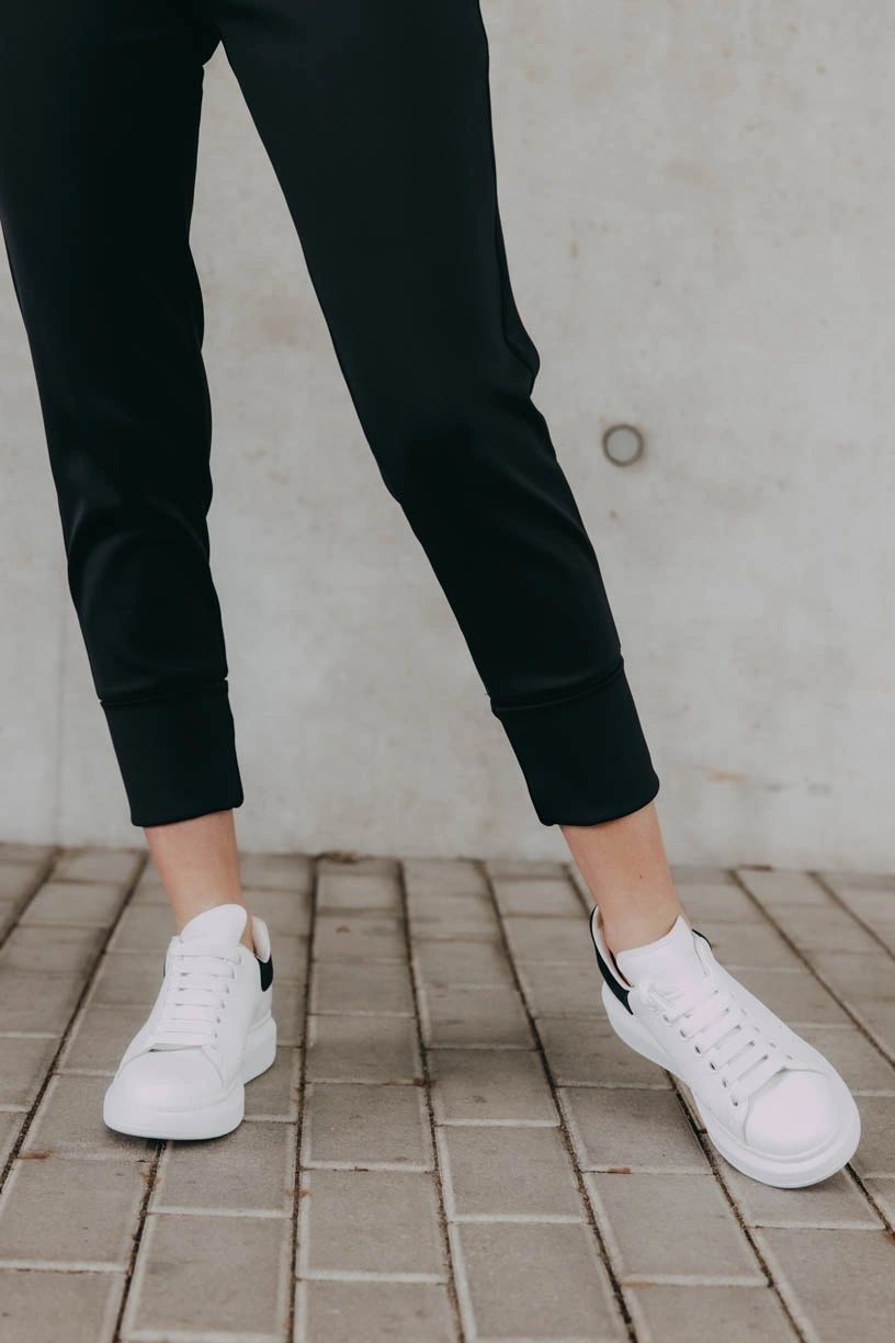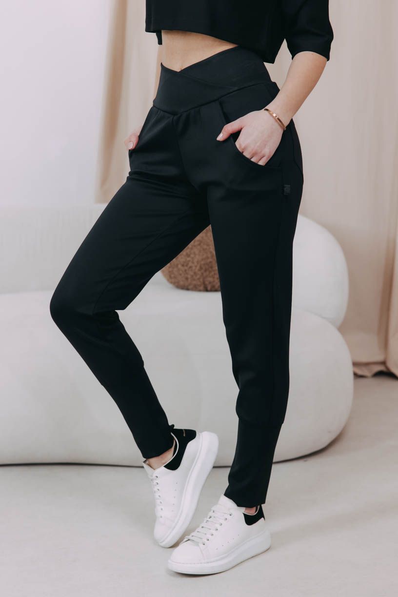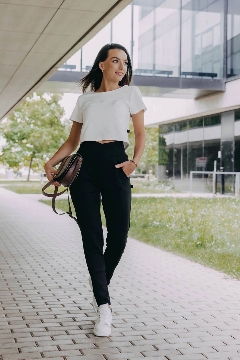 Čierne nohavice Kajumba s vysokým a efektne riešeným pásom krásne vykreslia vašu siluetu, nevyťahujú sa a vďaka vyššej gramáži látky sú skvelé aj na chladné dni.