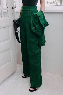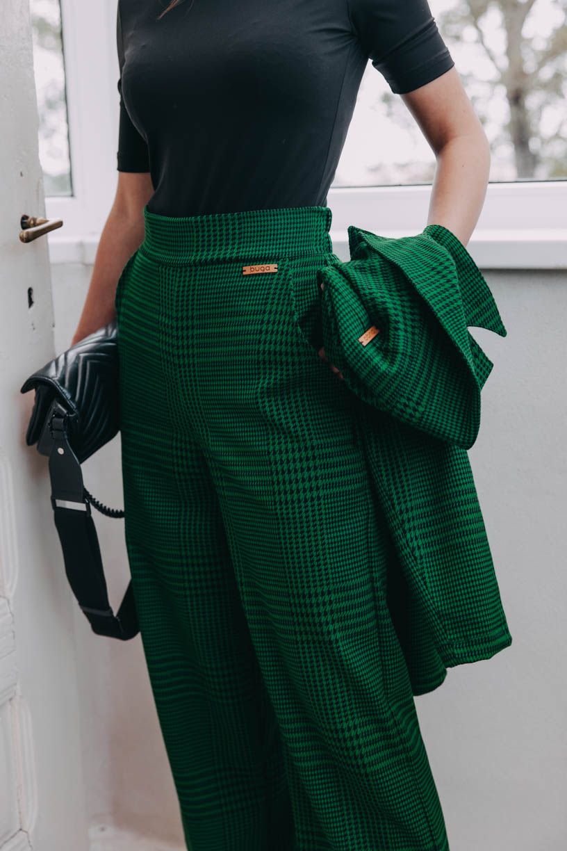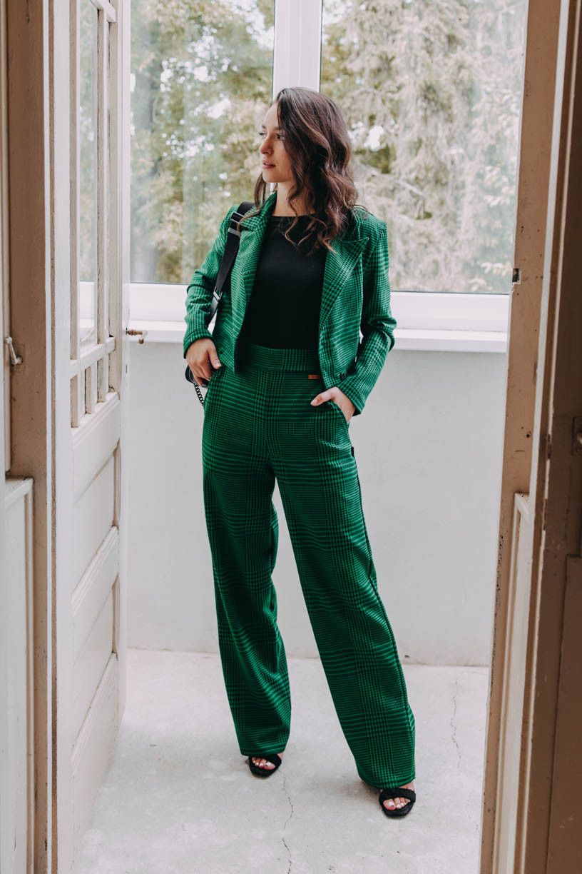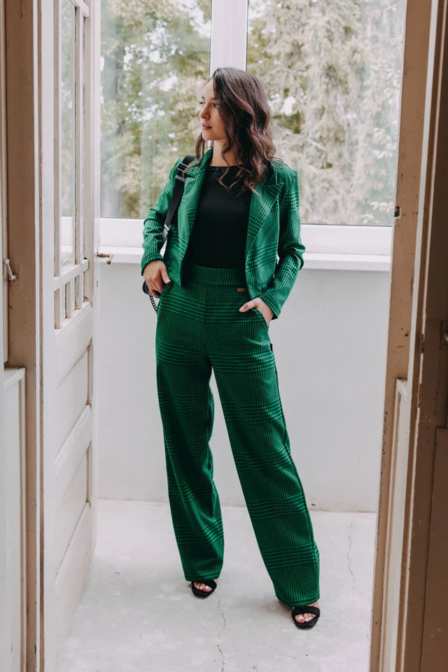 Ak sa vám zdajú Kiu Green známe, máte bod za pozorné oko. Vychádzajú zo strihu obľúbených nohavíc Malika, sú len trochu užšie. Ponechali sme im širokú gumu v páse, šikovné vrecká a obliekli ich do tejto krásnej zelenej látky so vzorom tohtoročnej jesene z teplejšej viskózy s prímesou polyesteru. Keď ju naša Peťa uvidela, neváhala a hneď ju kupovala.