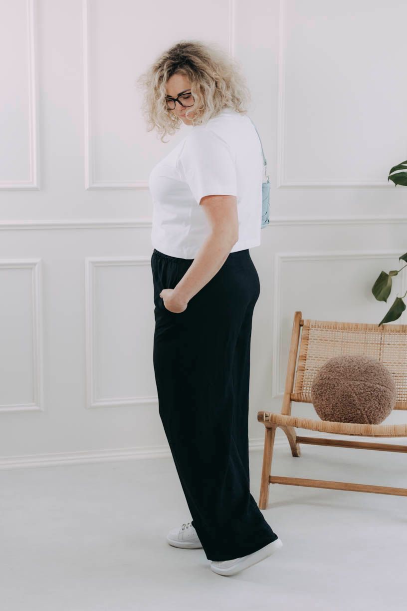 Kombinujte ich s kardigánom Made Gabija pre monochromatický čierny outfit alebo ich noste samostatne s obľúbeným topom. Ľahko ich zladíte s basic tričkom aj elegantnejšou blúzkou, čo z nich robí univerzálny kúsok pre každý deň. Nielen ten dovolenkový.