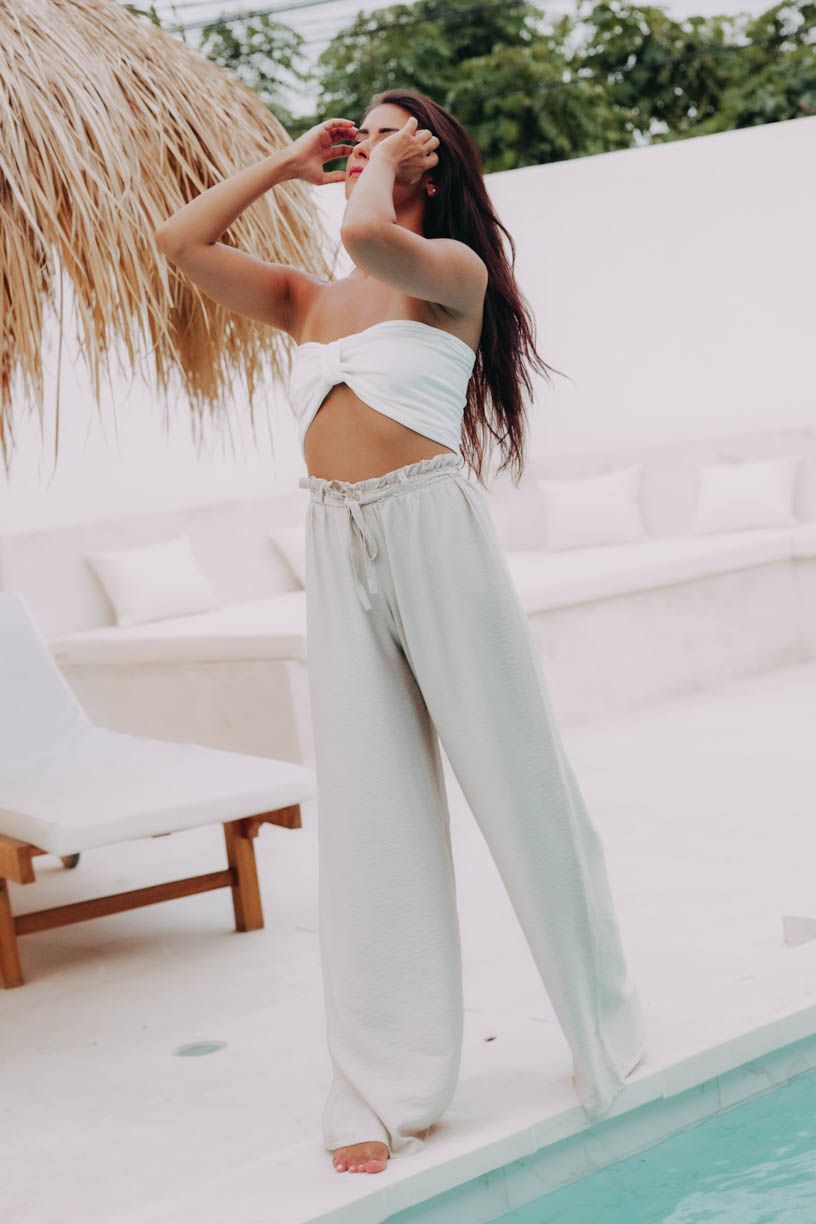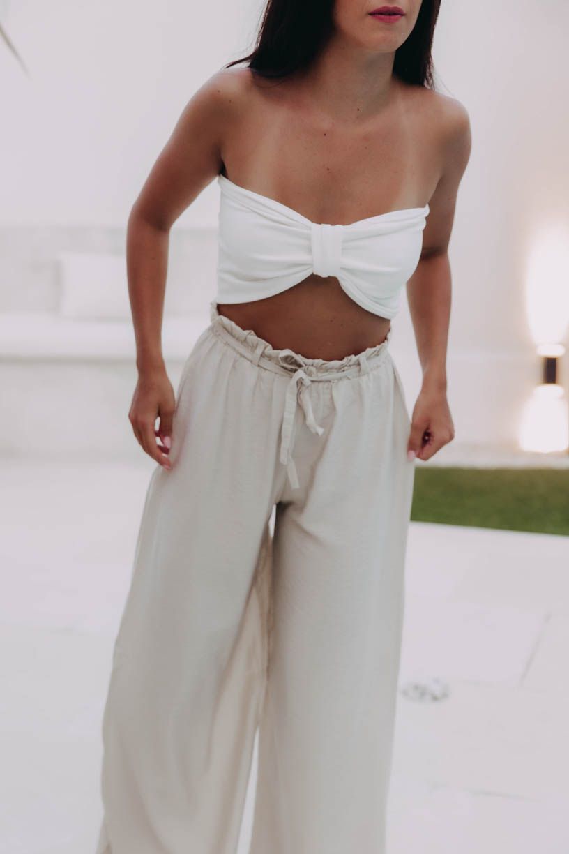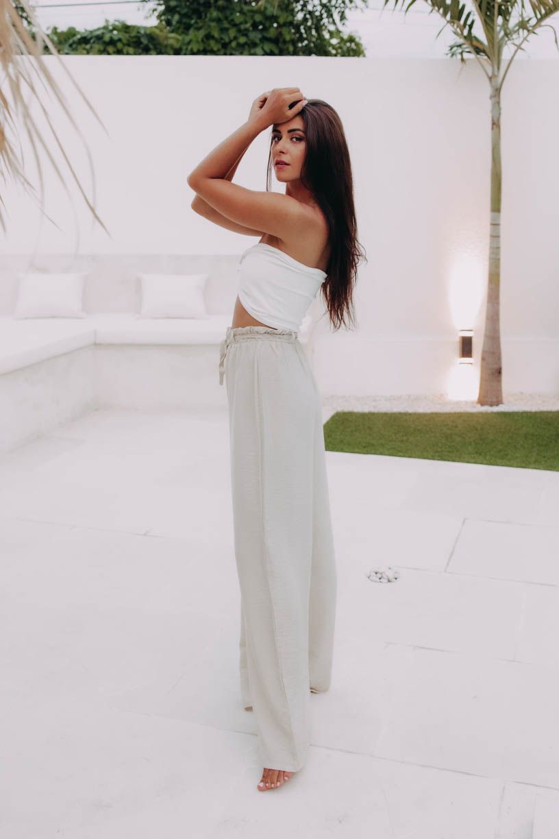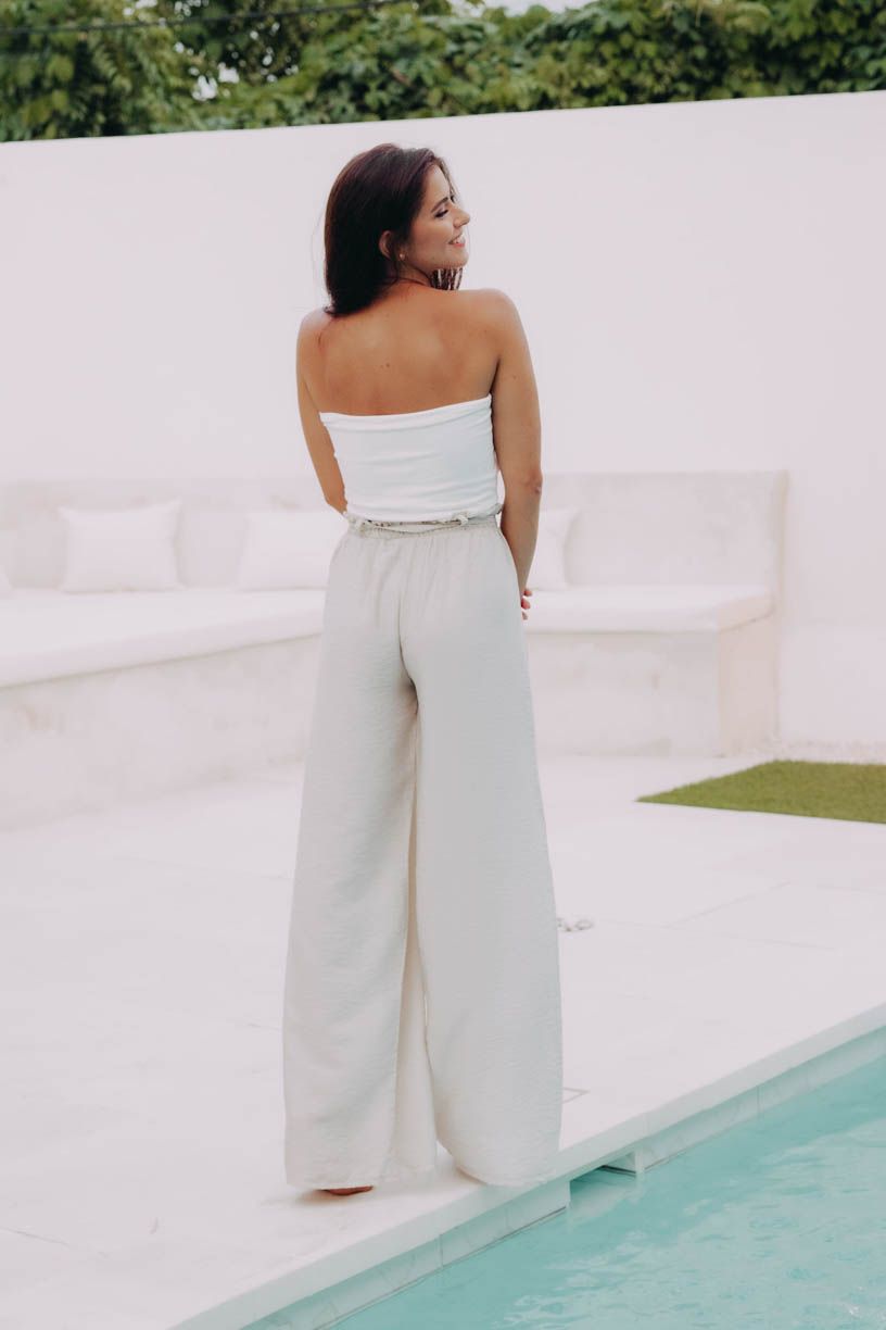 Široké nohavice Made Guru z Bali kolekcie – s elegantným riasením a pútkami na opasok. V minimalistickej farbe sú nevyhnutnosťou pre každú letnú dovolenku.