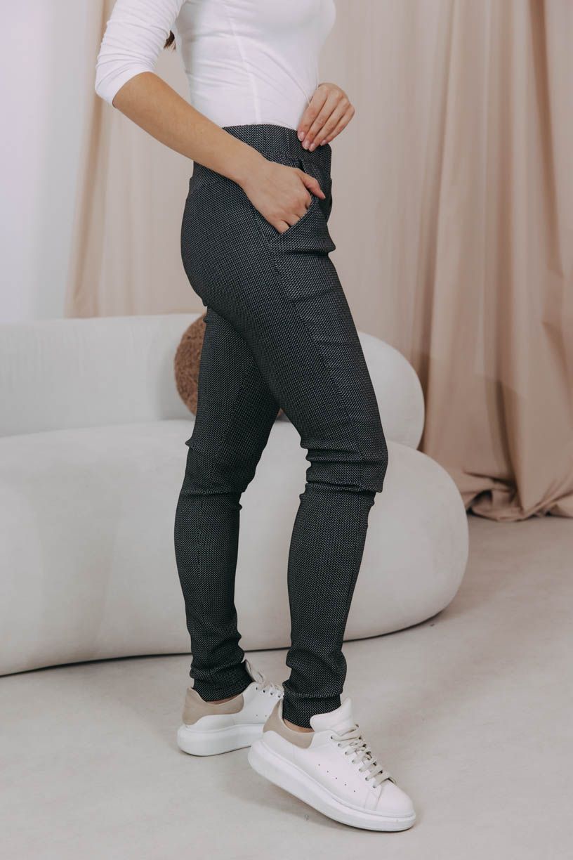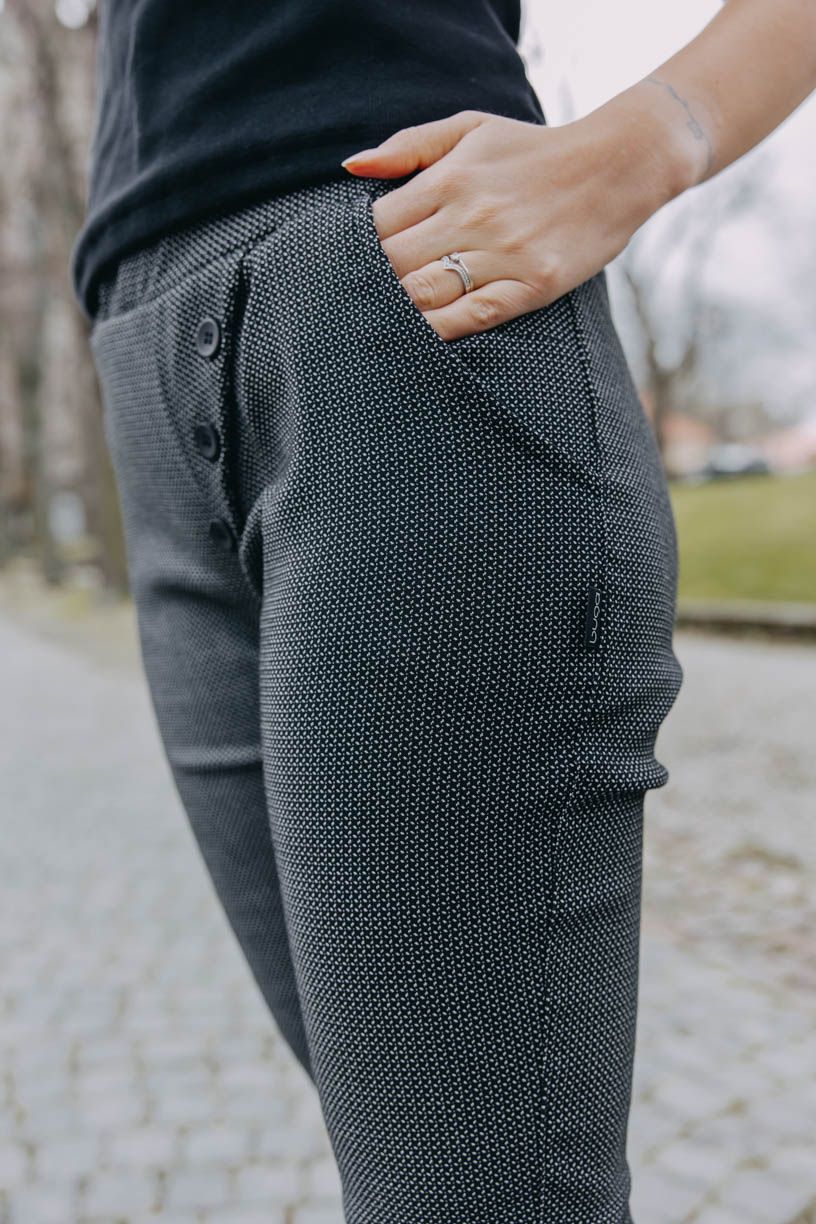 Našou najdôležitejšou podmienkou bolo pohodlie, ktorému sme prispôsobili celý návrh nohavíc - žiadny zips, ten najpohodlnejší pružný materiál, ktorý sa nekrčí a drží tvar, a rafinovane všitá široká guma v páse, aby vás nič netlačilo. Pár malých vreciek na drobnosti dopĺňajú ozdobné gombičky.