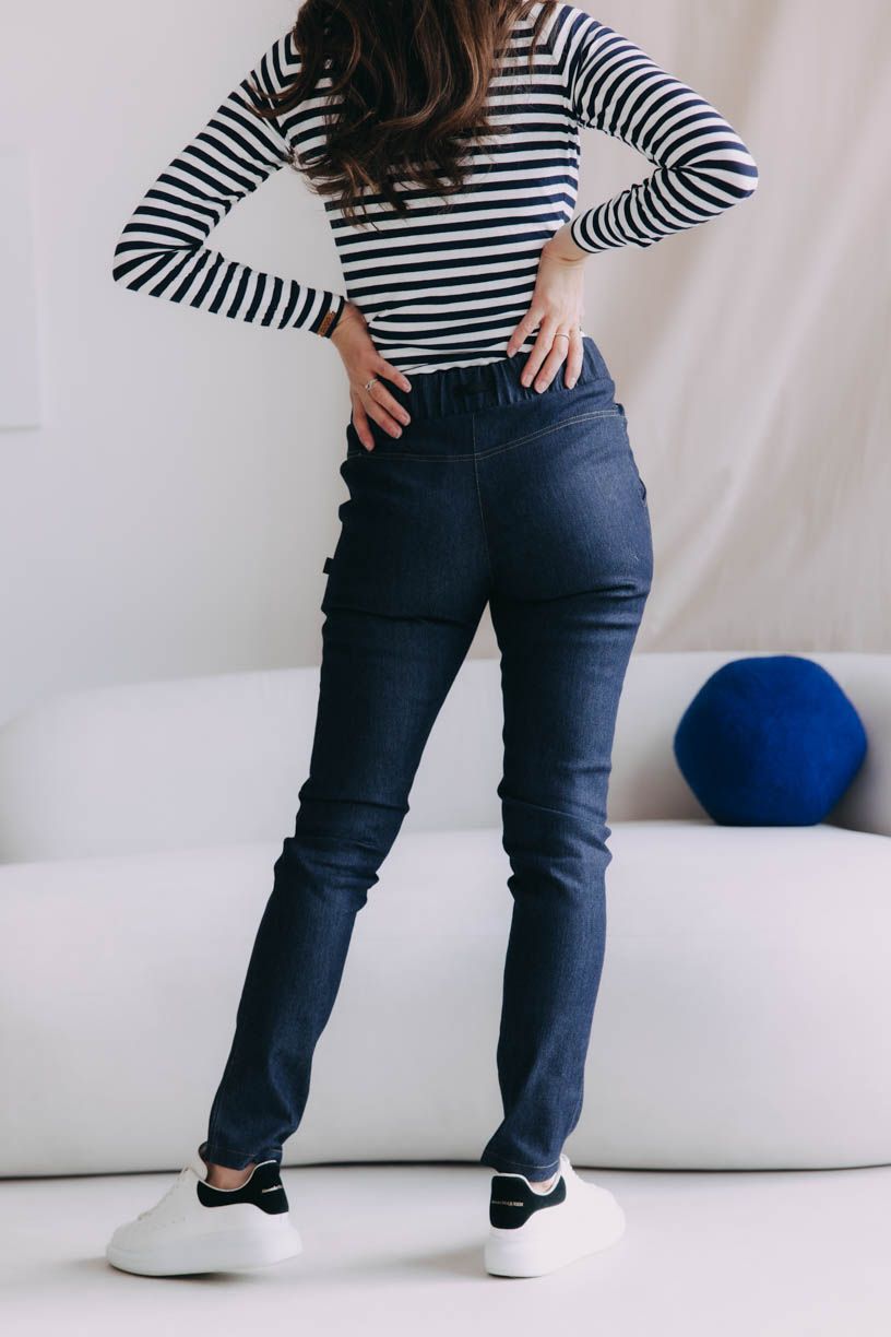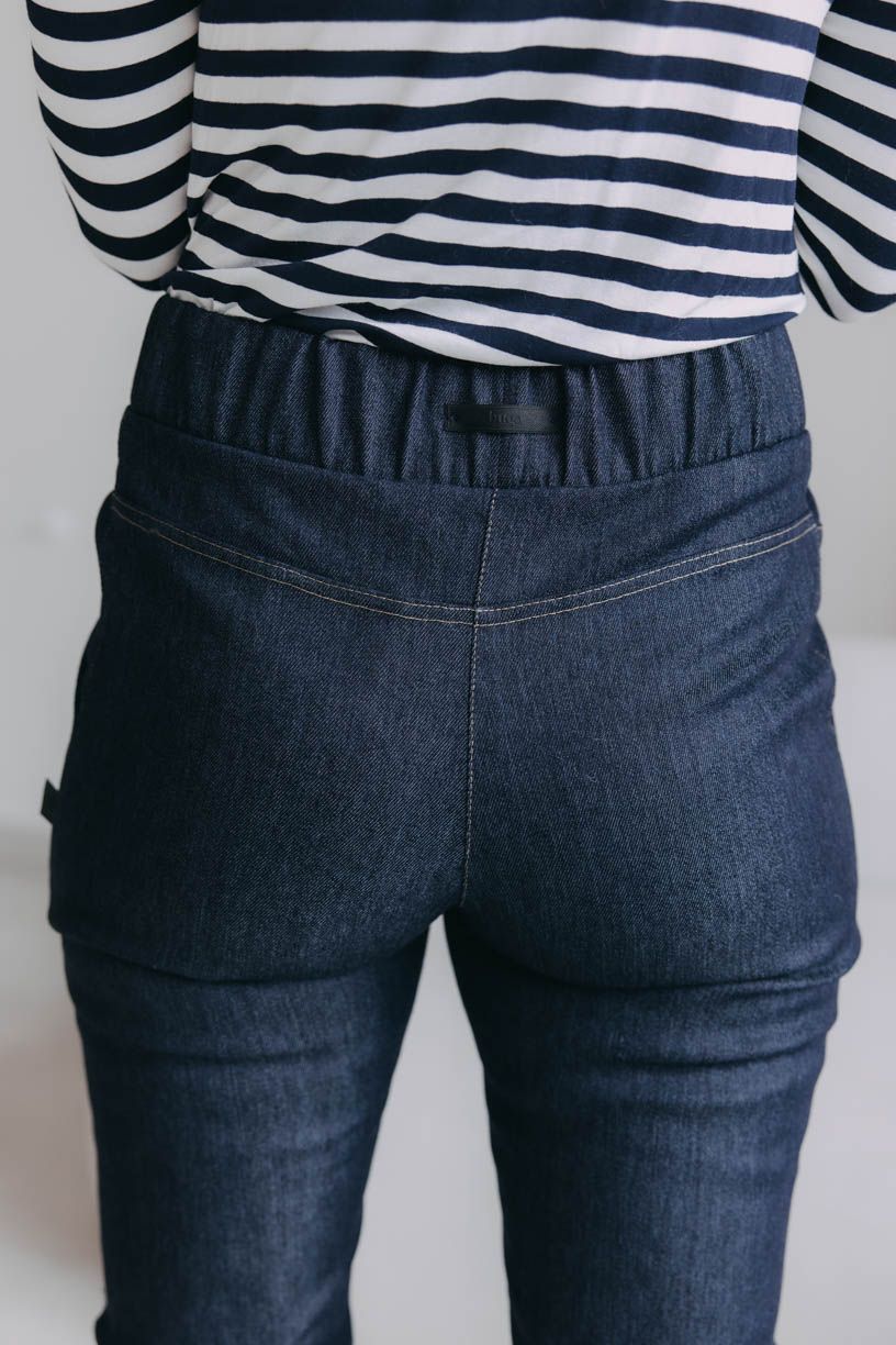 Materiál je jemne pružný, preto odporúčame venovať pozornosť uvedeným mieram. Látka je odolnejšia, nekrčí sa a nezráža a má nepatrne tmavší odtieň, než iné denimové kúsky z našich dielní.
