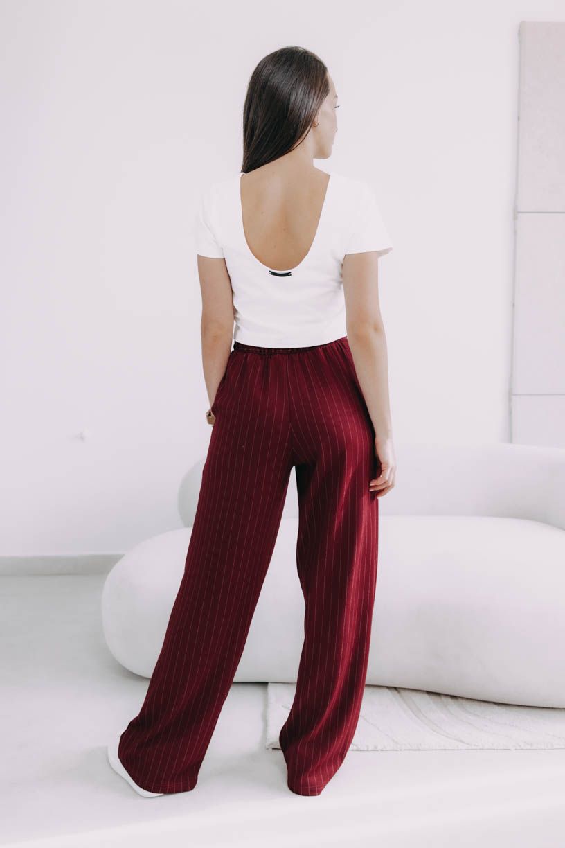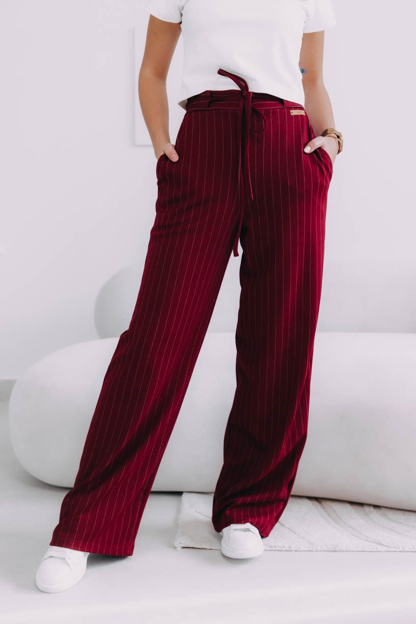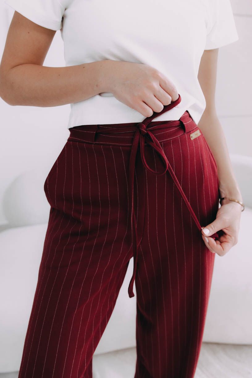 Vysoký pás a jemne nariasená zadná časť s pružnou gumou nielenže vytvárajú elegantnú siluetu, ktorú opticky predlžujú zvislé prúžky, ale zaručujú aj dokonalé pohodlie počas celého dňa. Vrecká po stranách, kam si môžete pohodlne schovať ruky alebo drobnosti, a šnúrka vpredu, ktorou si pás utiahnete, im dodáva šmrnc, akoby vám boli ušité na mieru.