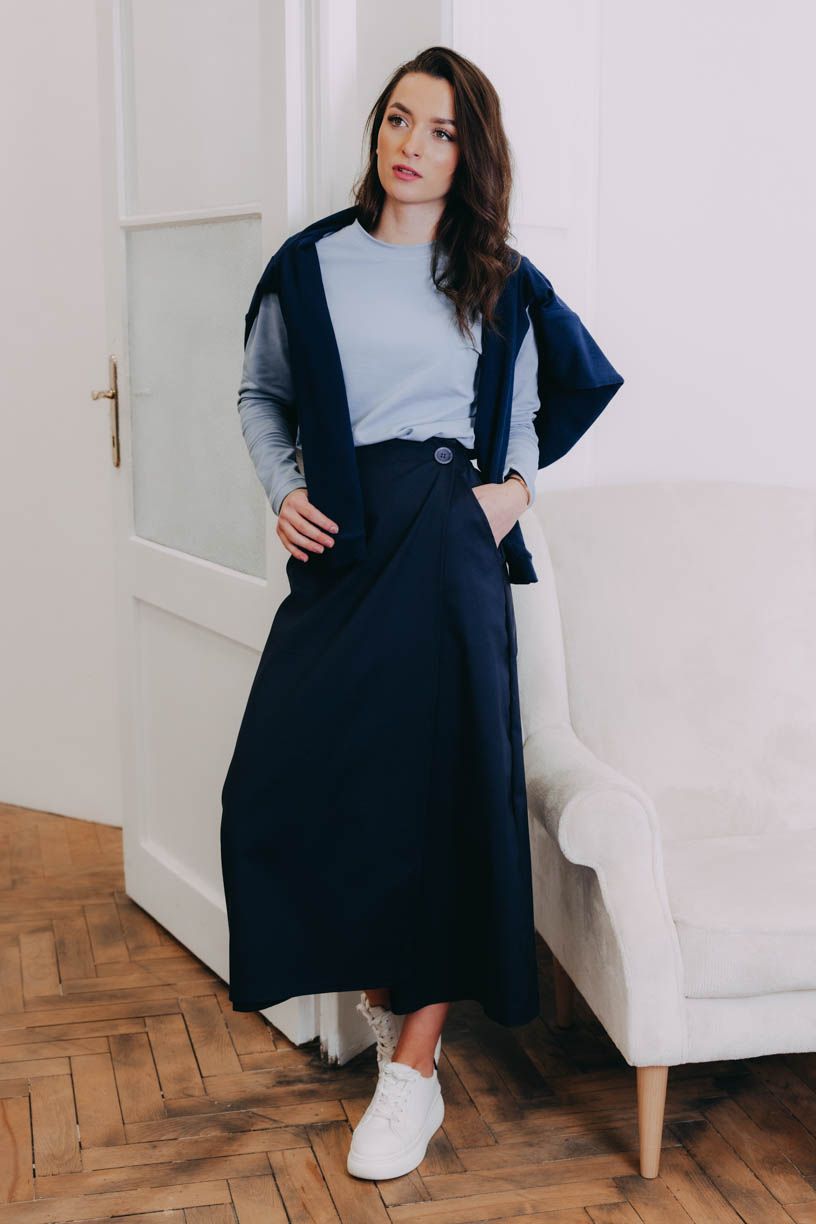Tento originálny český dizajnový kúsok je majstrovské dielo, ktoré si počas milisekundy získa pozornosť. Na prvý pohľad vyzerá Nakisai ako tmavomodrá zavinovačka, len čo však vykročíte v ústrety novým zážitkom, rozohráte okolo svojich nôh nohavicovú symfóniu. Za predným dielom sa totiž (áno, dôvtipne) ukrývajú široké nohavice.