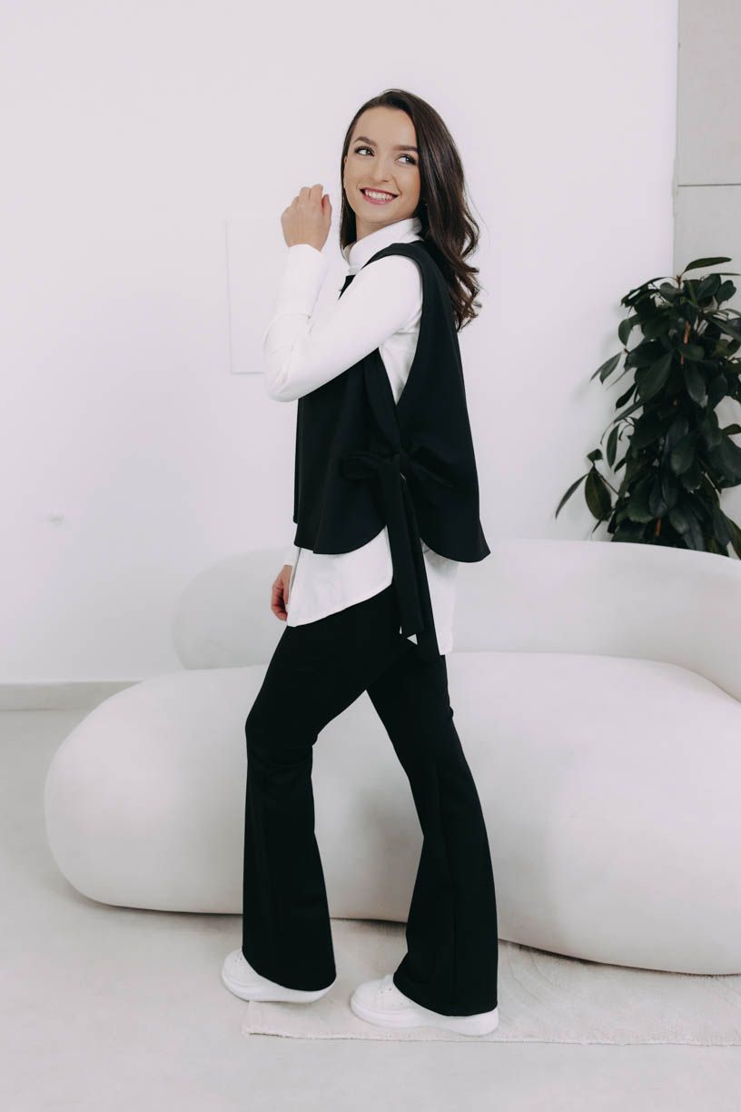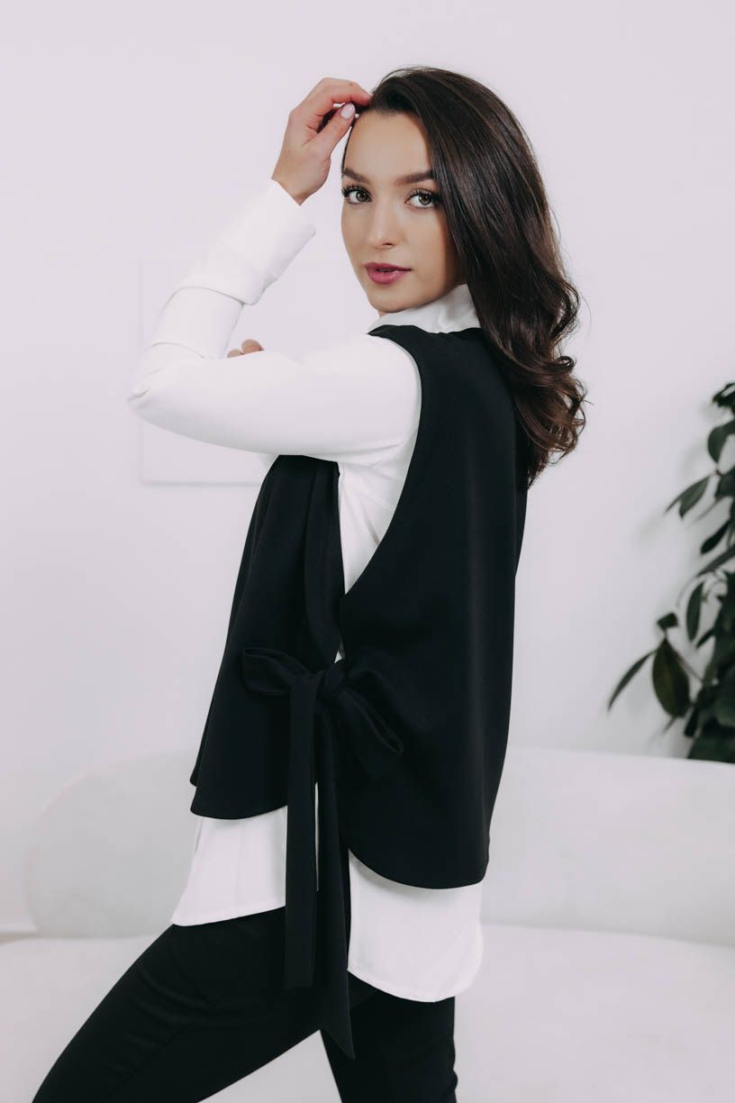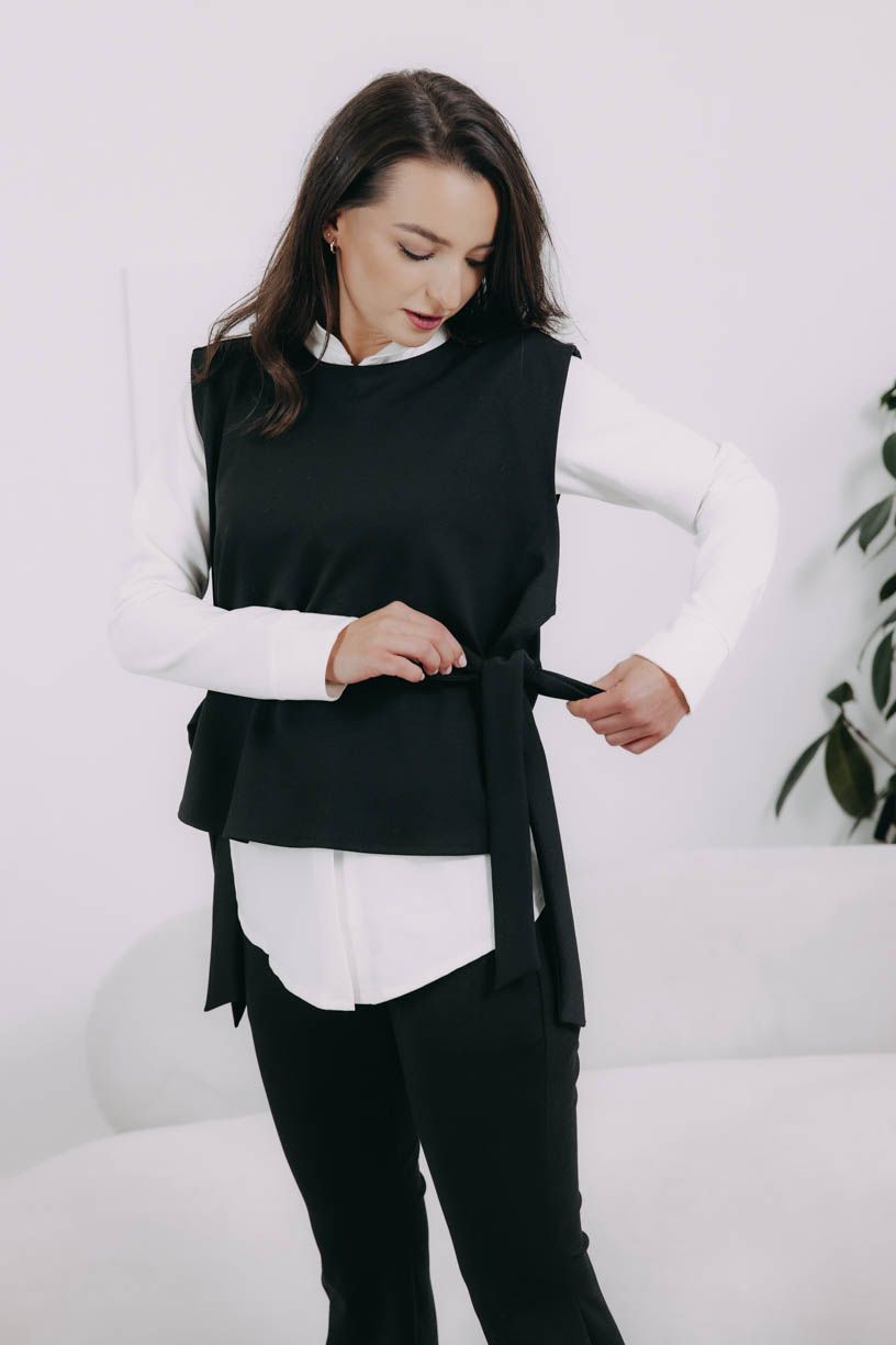 Ako spestriť klasický čiernobiely outfit? Úplne originálne s našou (ne)vestou Shaida. Je voľnejšia, ale vďaka zaväzovaniu na bokoch hravá a zároveň ženská. Je kratšia, ale práve vďaka tomu pod ňou skvele vynikne napríklad biela košeľa Tawia. A pretože zvonáče opäť frčia naprieč svetom, nezostaňte ani vy pozadu a kúpte si k tomuto dokonalému outfitu nohavice Zen Bell. Spojiť príjemné a trendy, na to my sme experti. A vy teraz budete za módnu expertku ako v kancli, tak medzi kamoškami, až sa stretnete na pravidelný pokec pri poháriku.