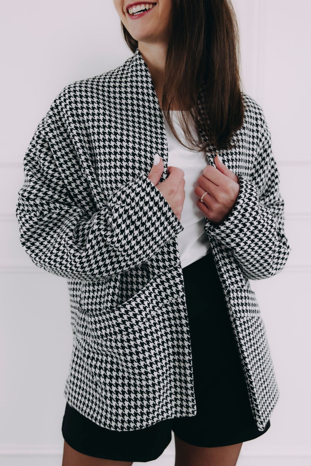 Niekedy stačia tri kúsky, aby vznikol outfit, ktorý pôsobí ako premyslený plán. A inokedy je to jednoducho intuícia. Bielé tričko z kolekcie White Tee ako čistý začiatok, blejzer Kirabo s čierno-bielym vzorom kohútej stopy ako manifest vkusu a čierne kraťasy – minimalistické, no s dokonalým strihom, ktorý drží celý look pokope.