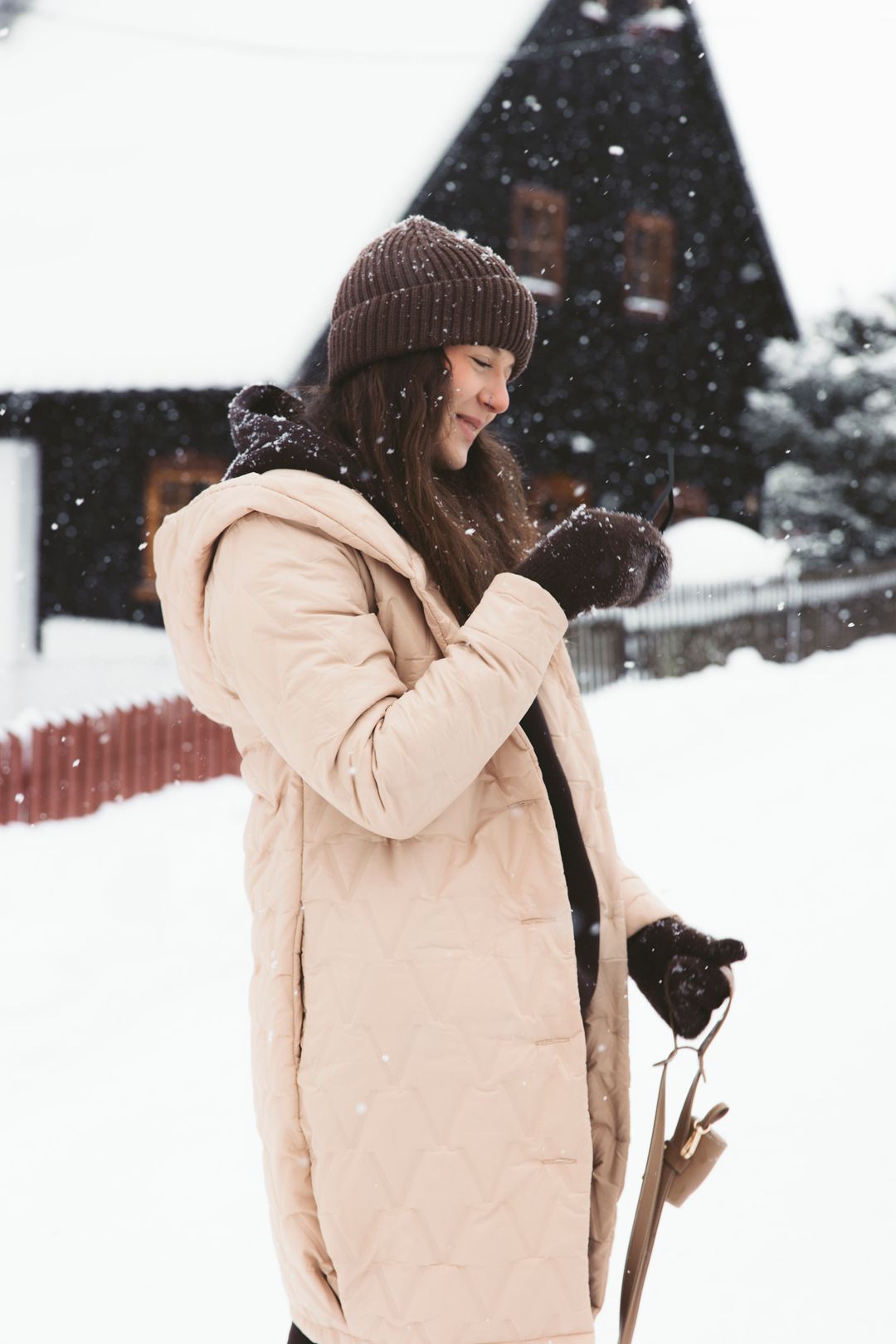 Svetlé farby v zime pôsobia neuveriteľne sviežo. Základom je naša ikonická tepláková súprava Hawa, ktorú sme povýšili na elegantnú úroveň vďaka kabátu Lawali. Tento look dopĺňa hnedá merino čiapka, ktorá narúša svetlý monolit. Je to ideálny outfit na víkendový brunch na horách alebo štýlovú prechádzku mestom, keď vločky začnú tancovať okolo.