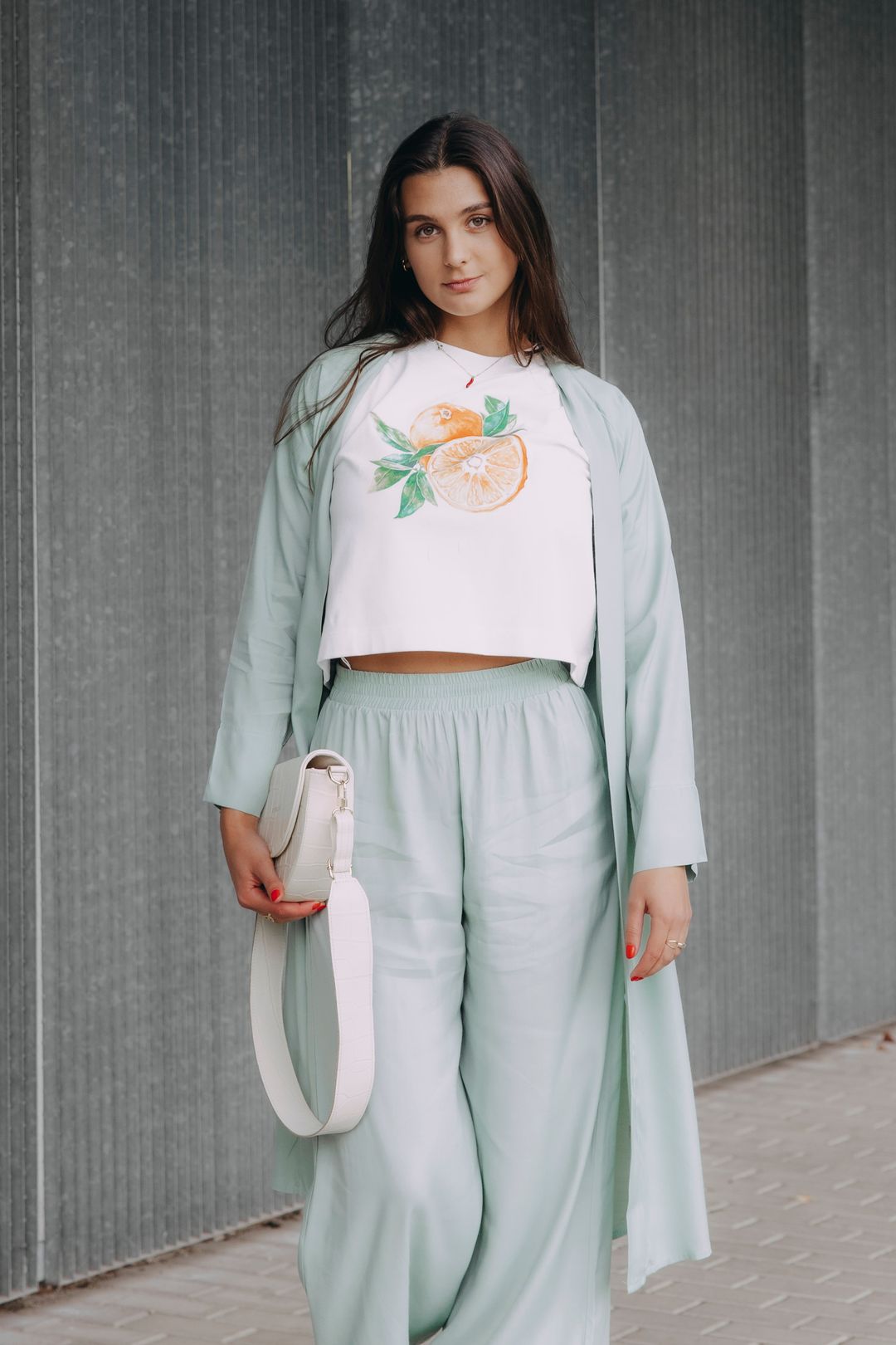 Ako sa obliecť, keď je leto v meste, no vy máte náladu na more? Zvoľte sviežu kombináciu kardigánu Made Gabija a nohavíc Ejila. Ľahký materiál príjemne splýva a dýcha, akoby ste sa práve prešli promenádou v prímorskom letovisku.