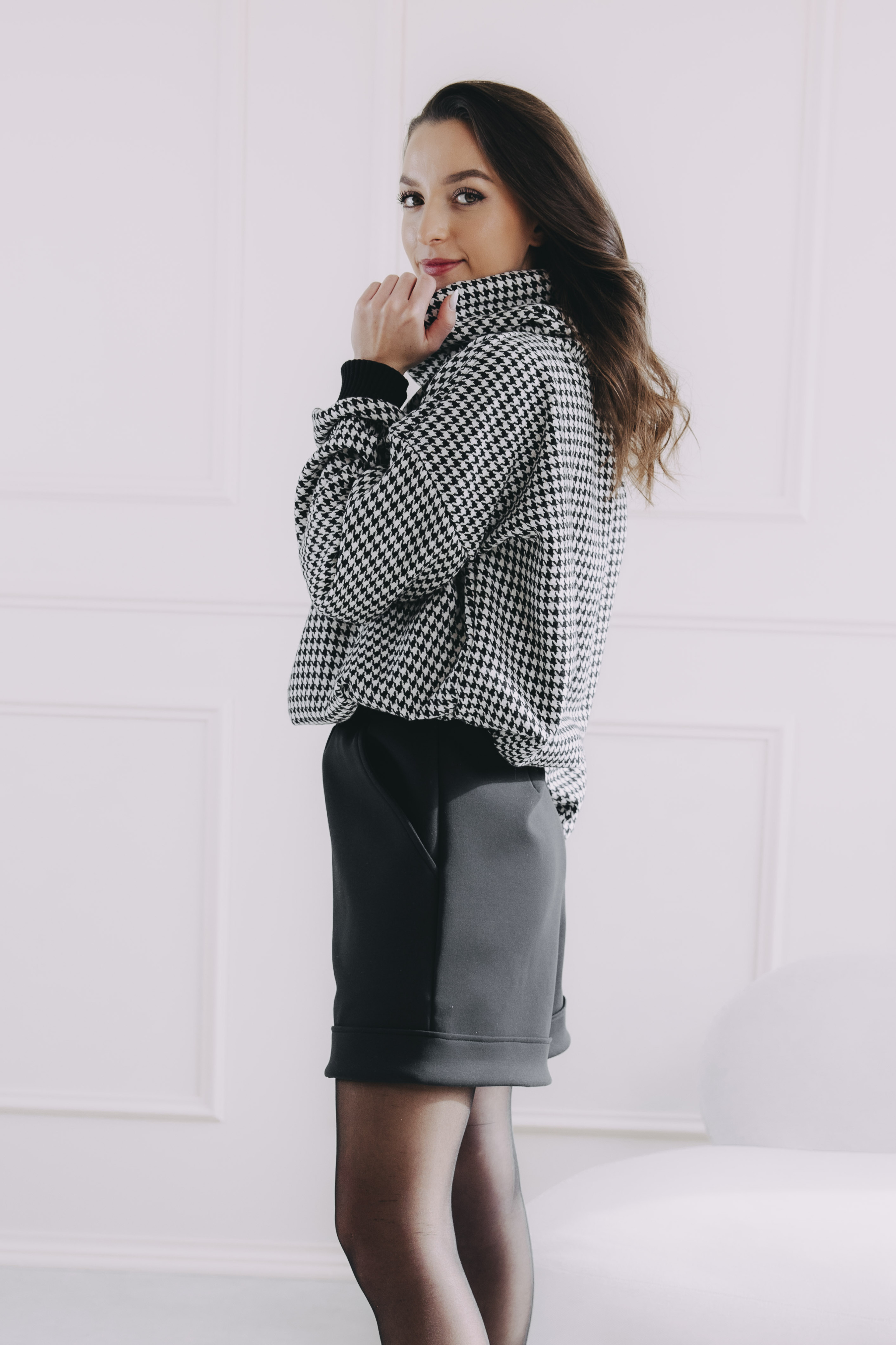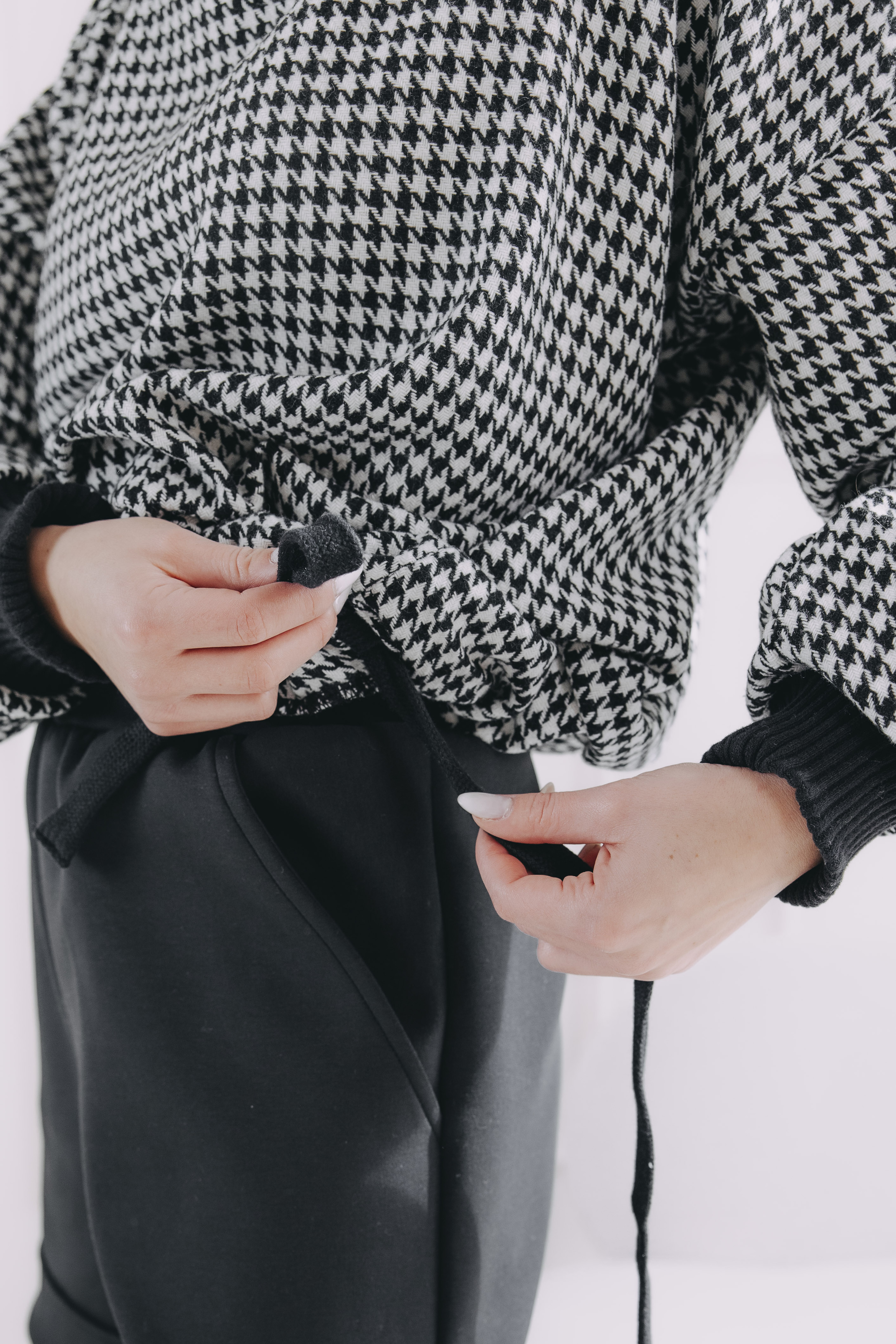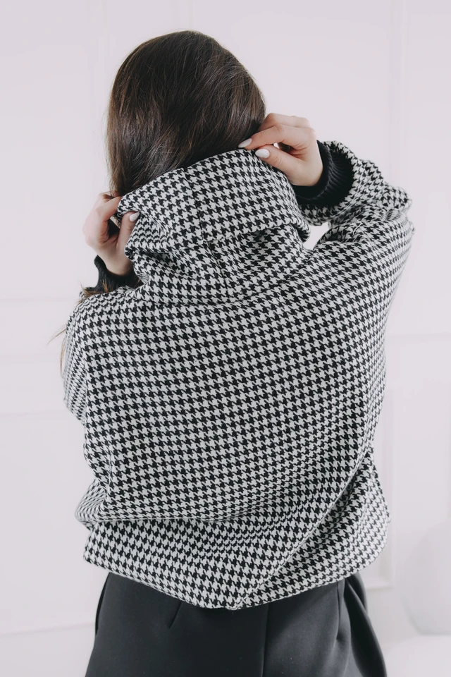Outfit, ktorý dokazuje, že čierno-biela kombinácia je nekonečne variabilná. Mikina Modou Black zaujme vzorom kohútej stopy – klasika s rebelským prístupom. Z diaľky pôsobí uhladene, no zblízka odhalí svoj charakter. Ľahko oversized strih, stojačik, ktorý nahrádza kapucňu, a hrejivý materiál oceníte aj vo chvíľach, keď zima už ukazuje svoju silu.