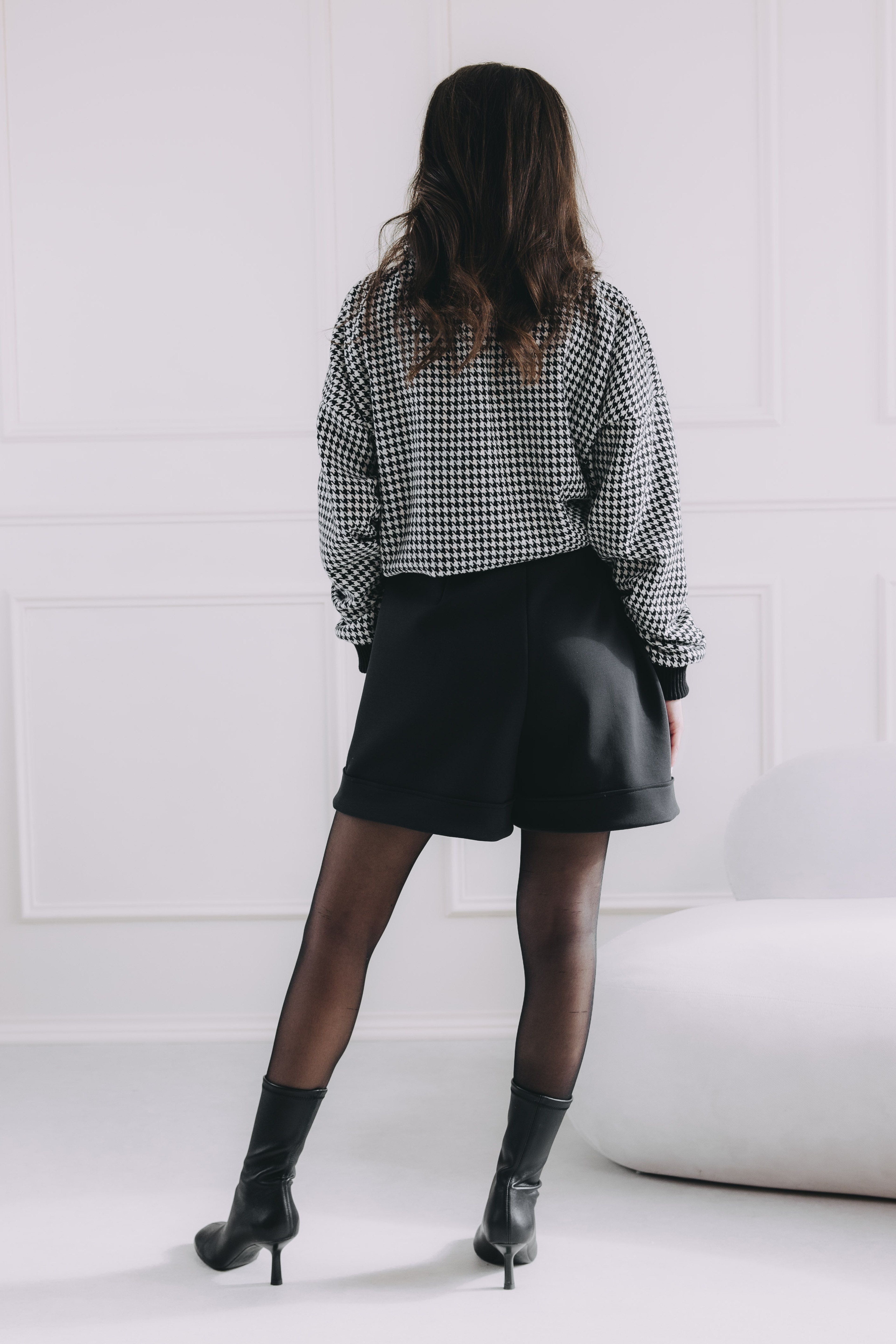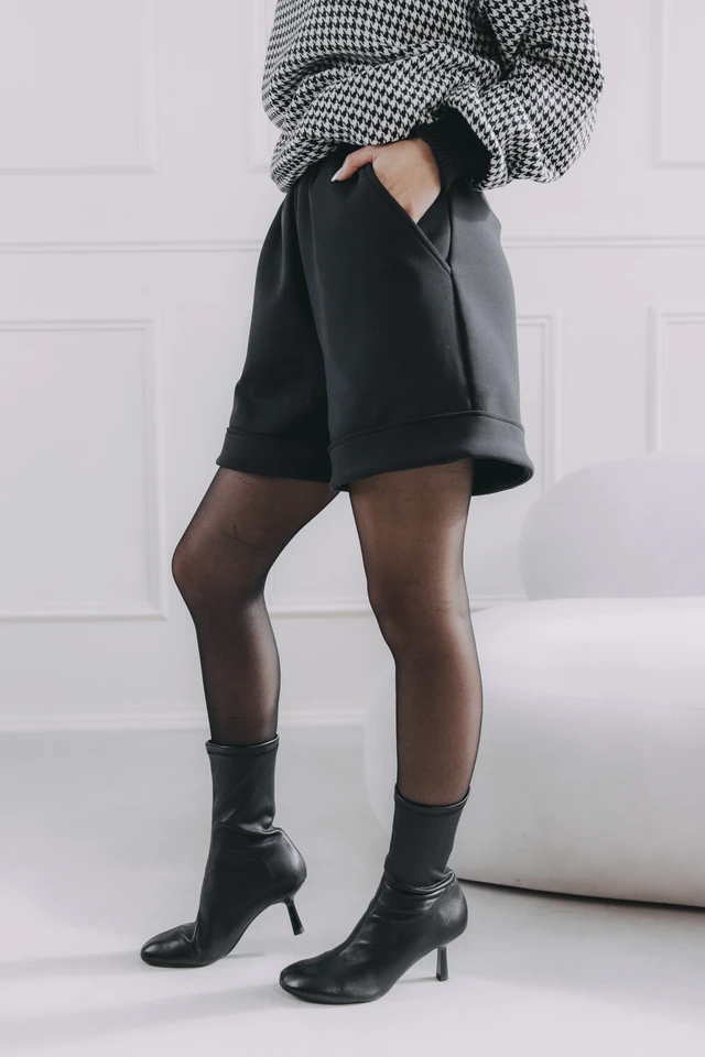 Mikinu dopĺňajú minimalistické kraťasy Zahe – čisté línie, mäkký, no pevnejší materiál a strih, ktorý skvele ladí s hladkými pančuchami. Stačí pridať čižmy alebo biker boots, prehodiť cez seba kabát (napríklad hrejivý Sumu alebo Tazara) a môžete vyraziť.