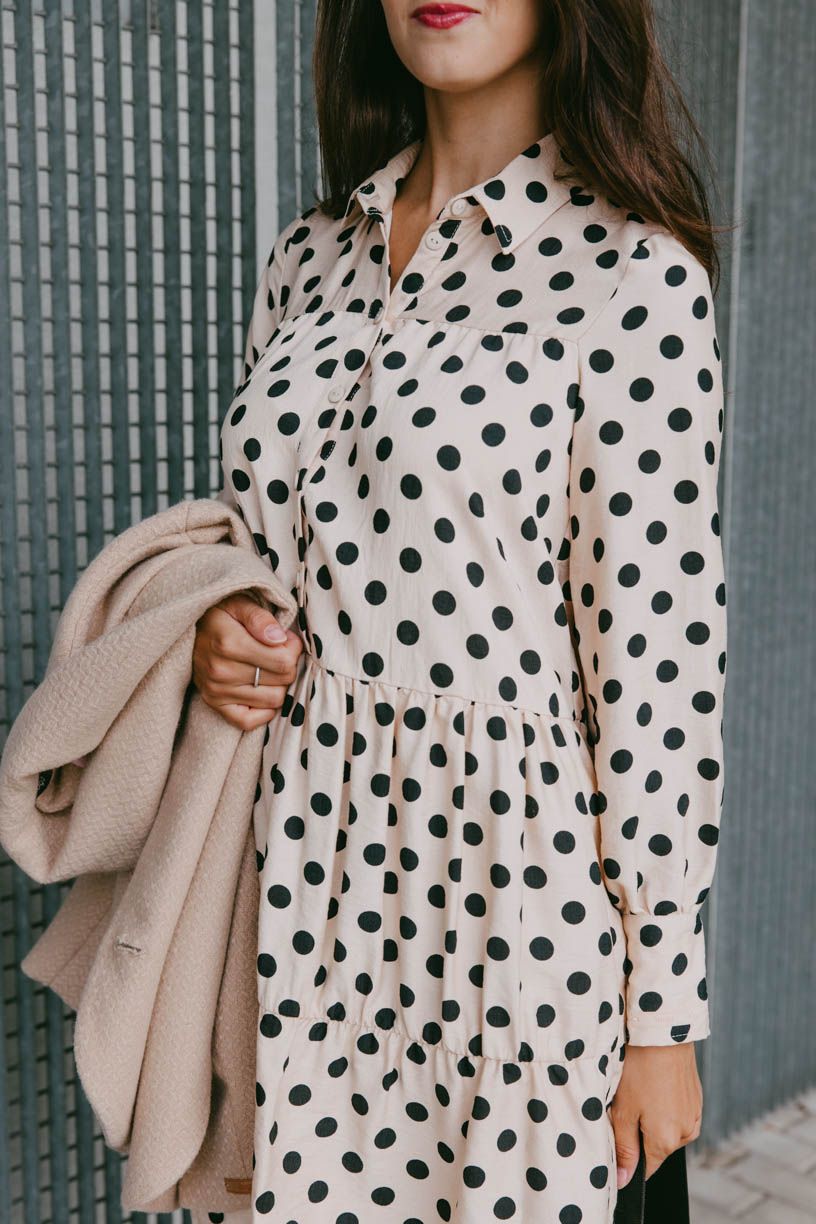 Elegantný, praktický a pritom veľmi hravý outfit, za ktorým sa otočí kdekto? Tu je! Šaty Tumai posiate pre Bugu toľko charakteristickými bodkami v sebe nesú tak trochu retro štýl, umocnený svojim sofistikovaným vzdušným strihom. Veľmi ženské, až dievčenské šaty skvele vyniknú na prvý pohľad s hrubším, ale v detaile prudko ženským kabátom Tawil v strihu tzv. „shacket“, teda kombinácii košele a saka. Oversized kúsok, ktorý exceluje práve v kombinácii s krehkými kúskami. S čiernymi bodkami zlaďte členkové topánky aj kabelku a užite si chladnejšie dni v nápaditom, minimalisticky hravom outfite.