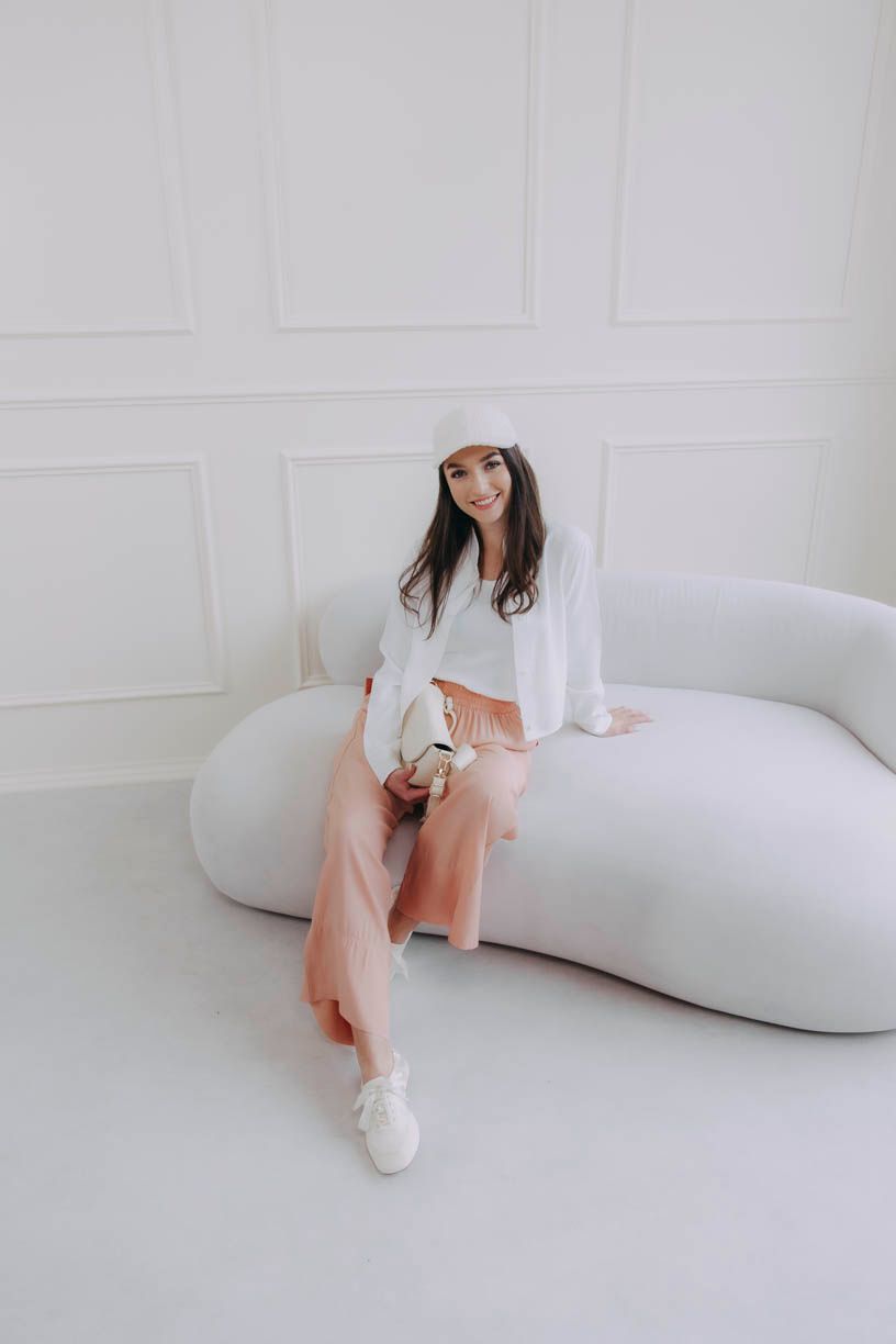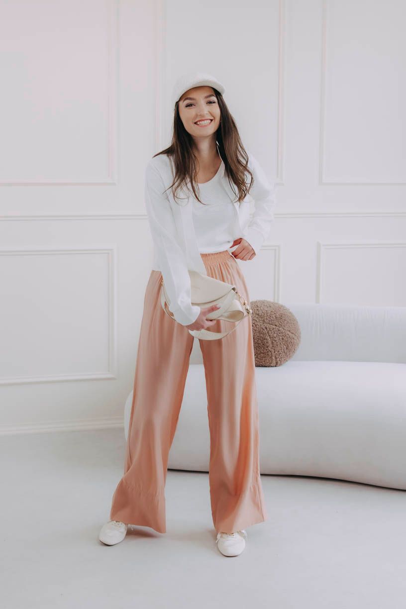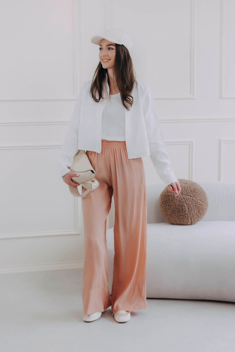 Krátka biela košeľa Tawia robí svoju prácu. Môžete ju nechať rozopnutú, previazať v páse, alebo len prevesiť cez plecia. Funguje na všetky spôsoby a zakaždým inak. Pod ňou jednoduché tielko Muru ideálne pre vrstvenie, ale v pohode obstojí aj samostatne. A keď sa to celé spojí s nohavicami Made Ejila Peach, vznikne kombinácia, ktorá je rovnako pohodlná ako tepláky, len s výrazne lepším efektom. Nohavice sú vzdušné, padajú, neobopínajú, skôr sa prispôsobia, nech si deň vymyslí čokoľvek. Ich broskyňový odtieň dodá outfitu farbu, ktorá práve v tejto kombinácii vynikne ešte viac.