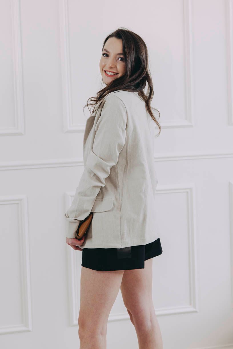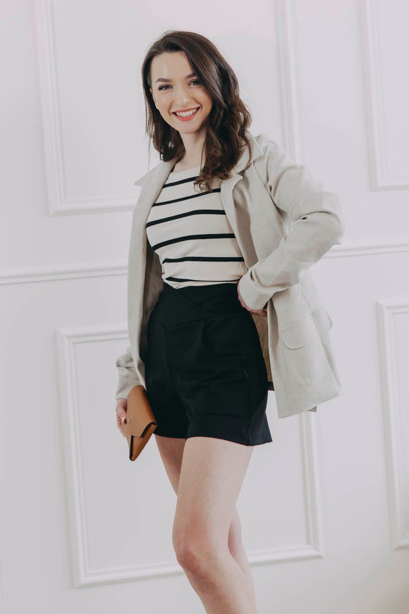 Nenútená elegancia so zdravou dávkou drzosti. Tento outfit je presne pre tie dni, keď chcete byť pripravená na všetko, no zároveň si nechať priestor na spontánnosť. Krátke čierne kraťasy Selas vám dajú pocit slobody bez toho, aby ste museli obetovať štýl. Sedia ako uliate, nech idete kamkoľvek – na víkendový brunch aj spontánne mestské dobrodružstvá. Tričko Gogo v jemnom béžovom odtieni s prúžkami rozohrá celý look. Mäkké na dotyk, univerzálne v kombináciách, skrátka, ráno ušetrí rozhodovanie pred skriňou. Ešte viac charakteru outfitu pridá sako Ikenna Beige, ktoré hovorí, že ste žena, ktorá má veci pod kontrolou a v hlave stále priestor na spontánne nápady.