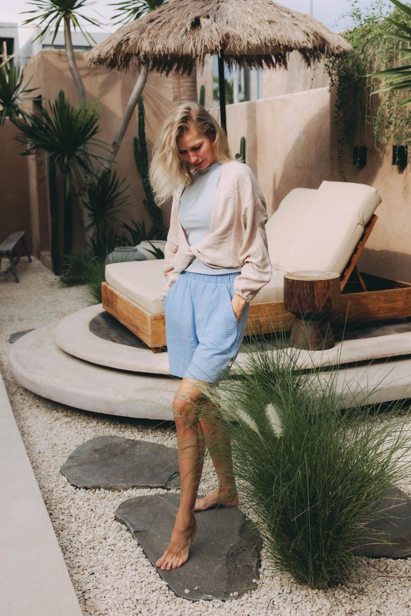 Nie všetko musí dávať zmysel, aby vám to spravilo deň. Niekedy stačí mäkký materiál, dobrá nálada a farby, ktoré si idú svoju cestu. Kraťasy Akosua v odtieni sky pôsobia ako modrá obloha v ten najlepší letný deň. Ľahké, vzdušné, no stále s formou. Top Laima Baby Blue k nim ladí tónom aj náladou, ako keď sa nič netlačí, len všetko prirodzene zapadne. A keď si cez ramená hodíte top Atai Creeme, celý outfit získa mäkký filter, akoby ste sa práve vrátili z miesta, kde sa všetko berie o trochu ľahšie. Outfit na momenty smiechu, ktorý prichádza nečakane, a na chvíle, keď vám niekto povie: „Vyzeráš tak nejako… spokojne.“