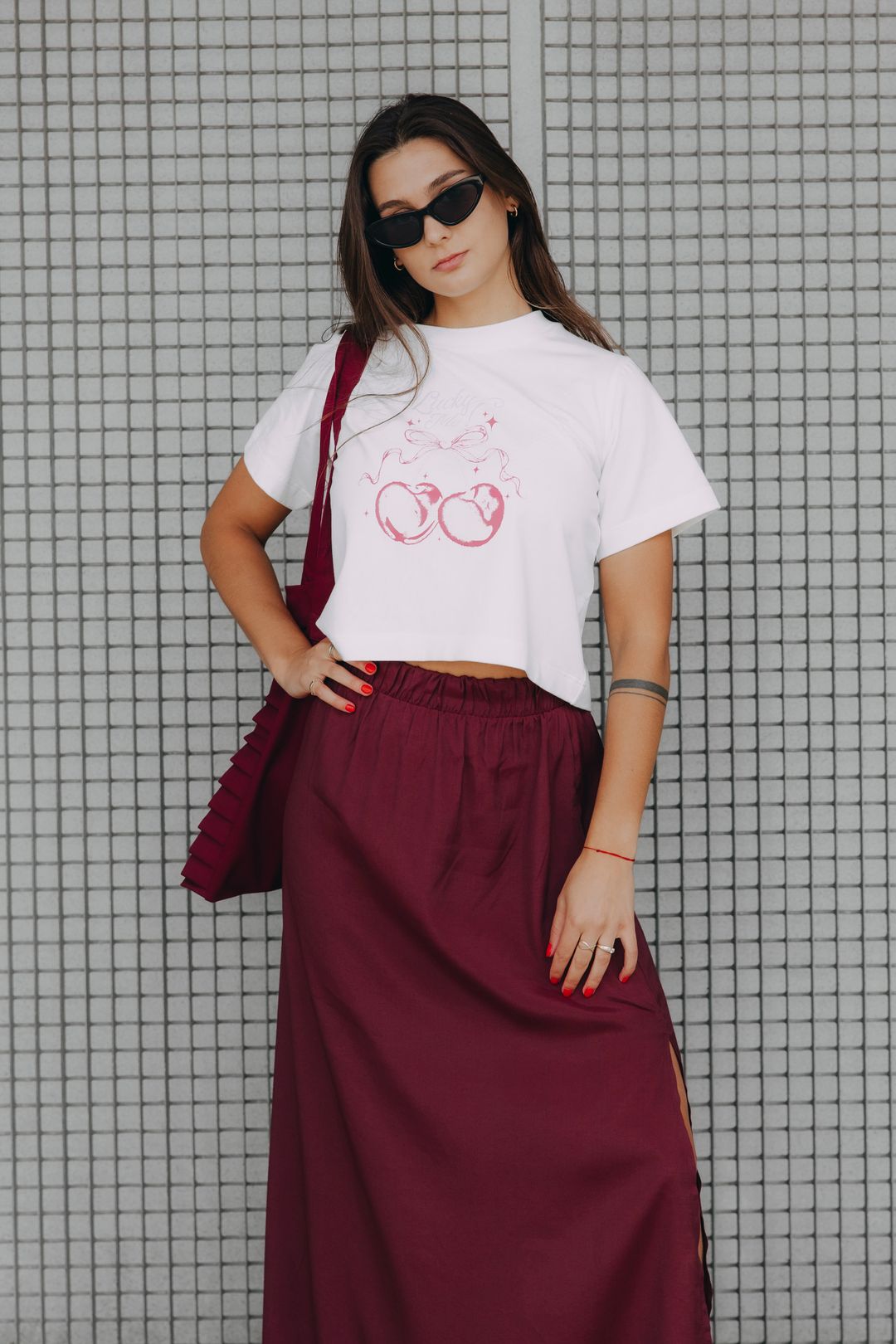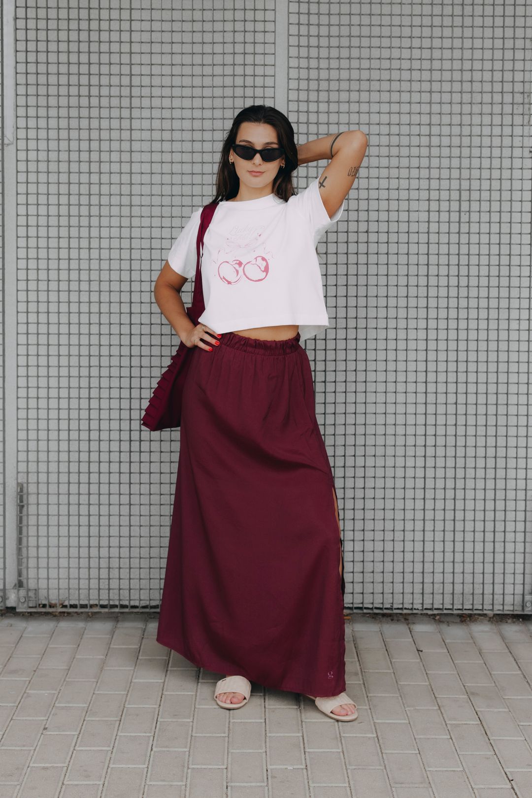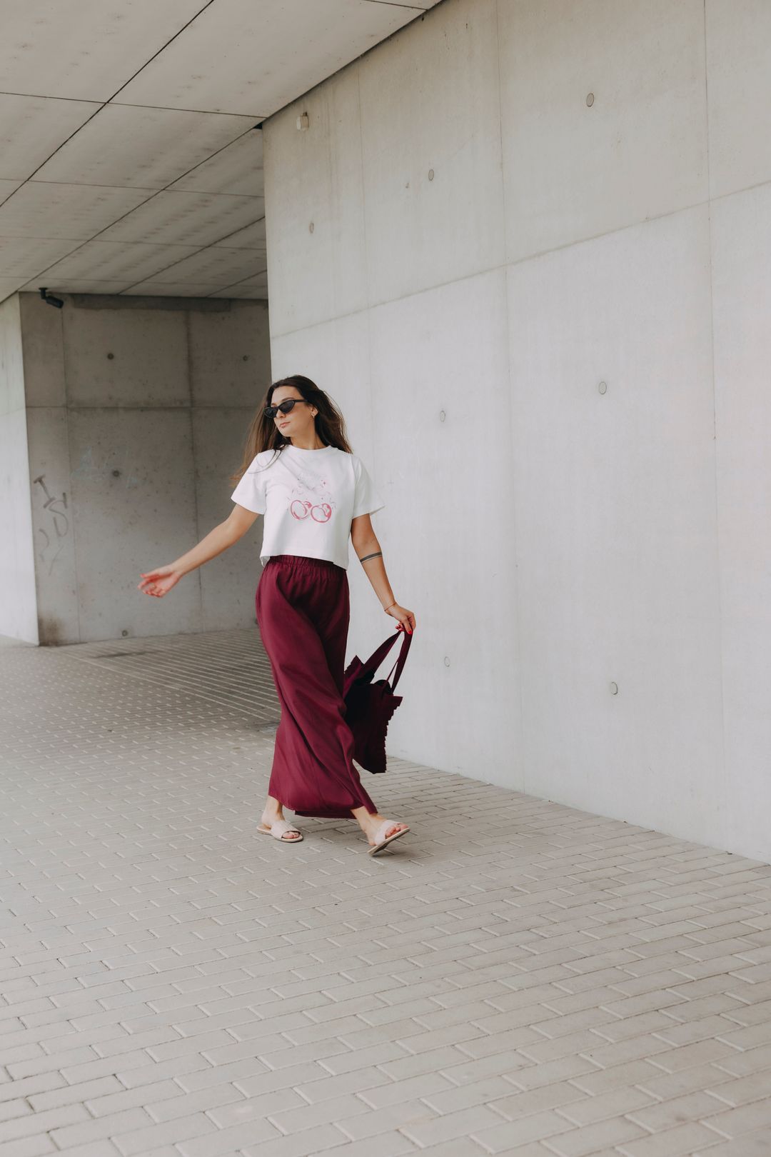 Predatavte si deň bez úloh, v tempe, ktoré neurčuje kalendár, ale nohavice alebo sukňa – a v tomto outfite to vyhrala sukňa Kimaya. Dlhá, výrazná, splývavá… presne taká, v akej sa chcete vybrať na príjemnú prechádzku s kamoškou, zastaviť sa na zmrzline alebo si len tak sadnúť na schody pred galériou. K tomu tričko Lucky Me z kolekcie Mood, ktoré sa netvári, že ste vyhrali v lotérii, ale pripomína, že máte dobrý deň. Možno preto, že máte túto sukňu, možno preto, že sa vám dnes nič nechce a nemusí. Taška Amma Bordo ladí so zvyškom a unesie aj knihu, ktorú už tretíkrát nosíte so sebou v nádeji, že prečítate viac ako jednu stránku.