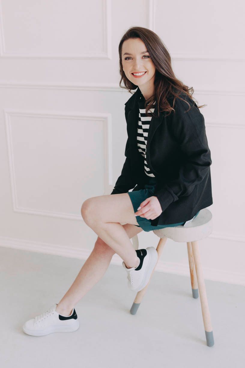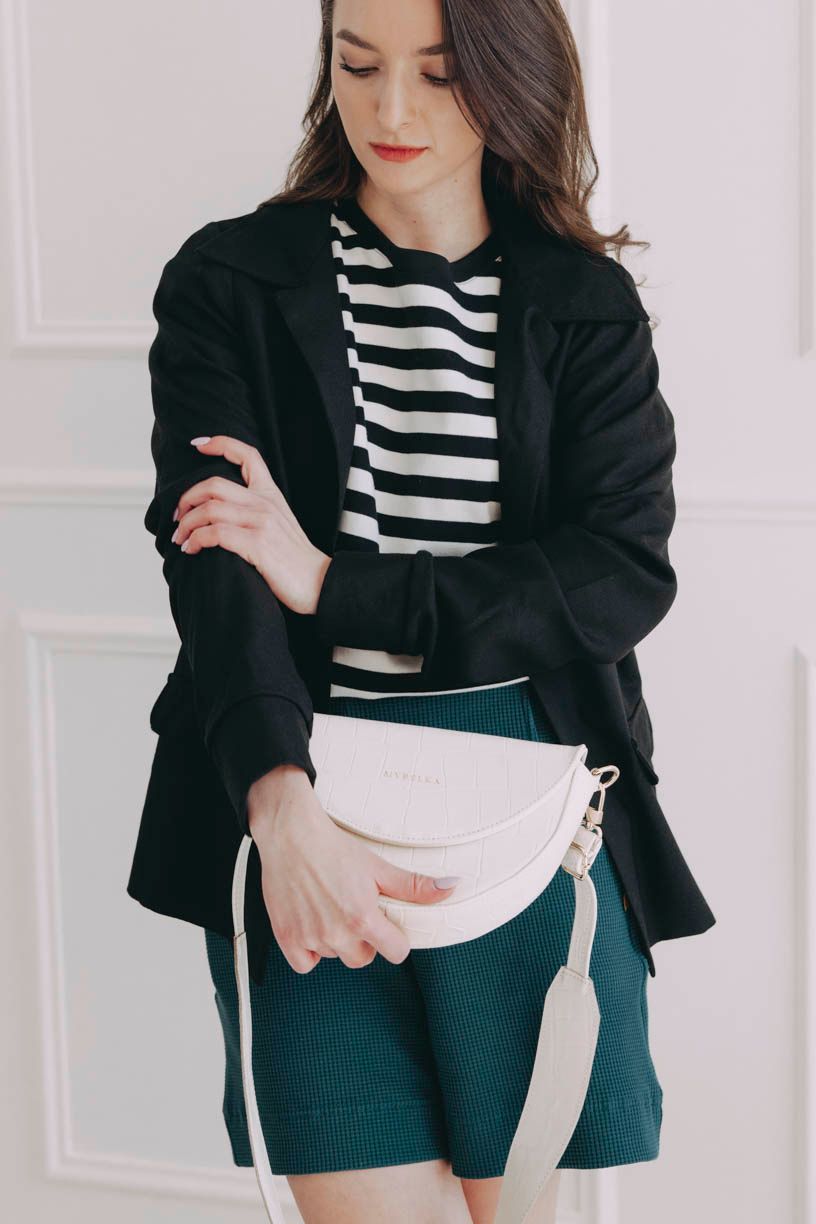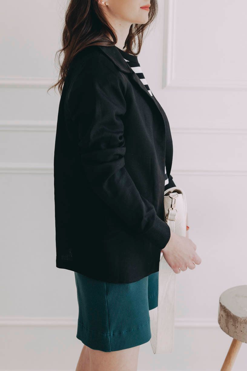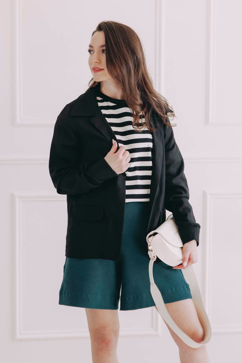 Nepotrebujete robiť hluk, aby ste boli počuť. V tomto outfite vás okolie bude vnímať skôr, než prehovoríte. Kraťasy Amondi v odtieni petrol sú ako pokoj pred búrkou. Na pohľad nenápadné, no keď sa v nich pohnete, zrazu viete, že práve v tejto jednoduchosti je ich sila. Tričko Nuru Pure je ich dokonalý sparring partner. Pruhy na ňom i objemné rukávy si idú svoje, neberú ohľad na konvencie. A keď sa pridá čierne sako Ikenna, outfit dostáva rám, ktorý zvýrazní všetko dôležité a zbytočnosti nechá mimo obrazu. Textúrovaný materiál, klasický strih a farba, čo dáva outfitu váhu bez toho, aby ho zaťažovala. Toto je look, ktorý má vlastné tempo, vlastný názor a rozhodne nemá v pláne splynúť s davom.