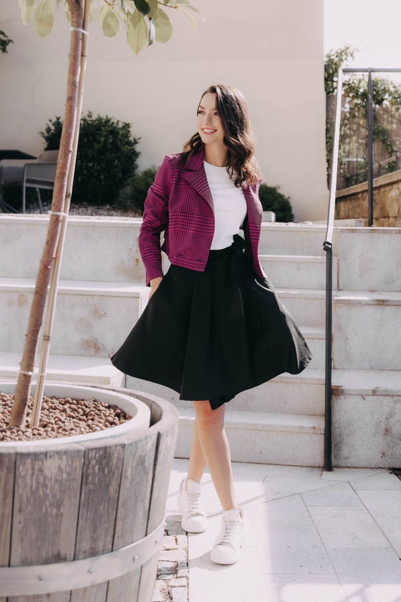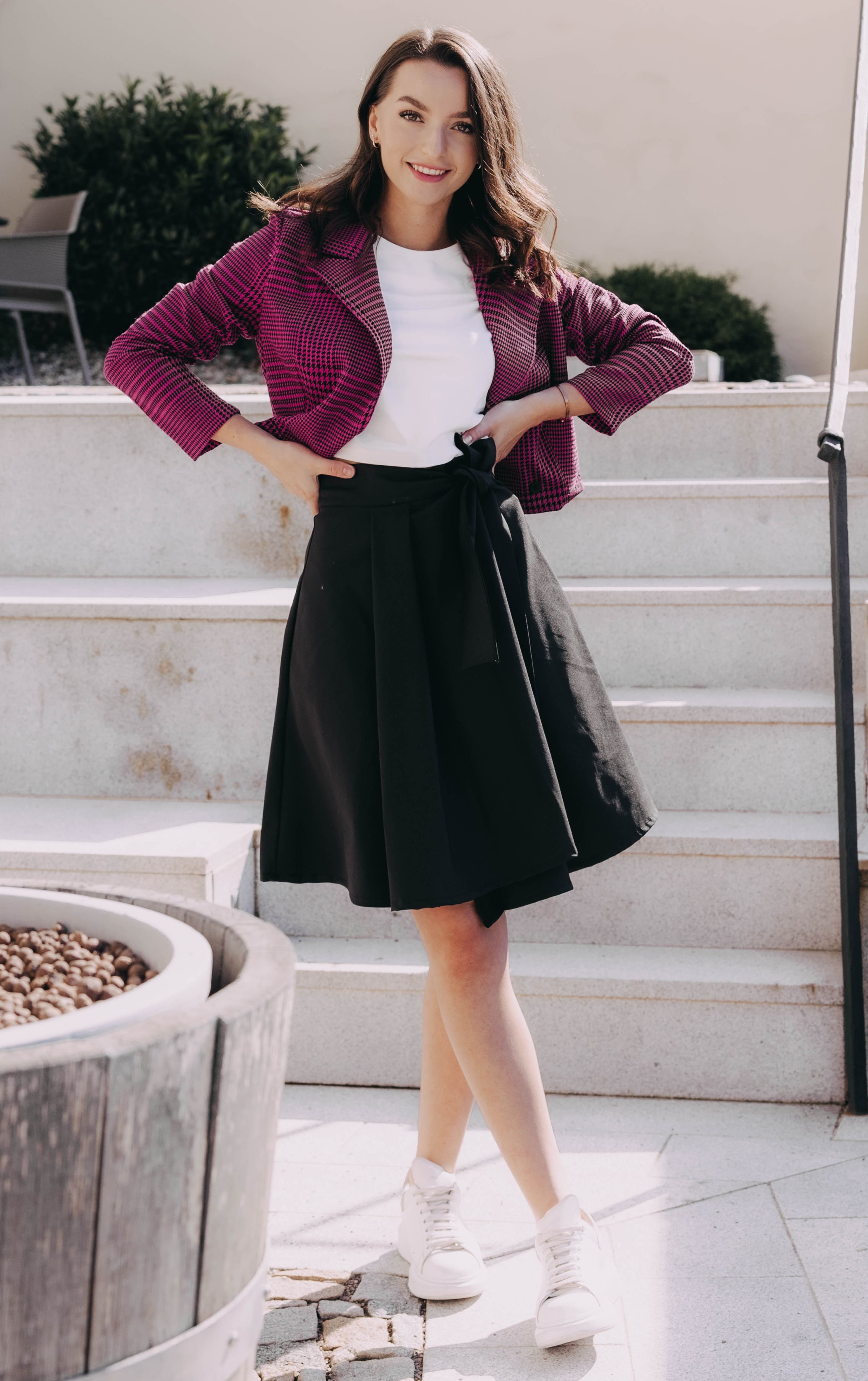 Výhodou saka Aris je, že sa aj napriek výraznému dojmu, ktorý vo vás zanechá, dá kombinovať s kdečím. Pri vzoroch však viac než inokedy platí pravidlo troch farieb. A preto, aby ste vykúzlili elegantný, a pritom nespochybniteľne ležérny outfit, stačí už len klasická čierna sukňa a biely top, čo sú kúsky, ktoré má v šatníku bez výnimky každá žena. A ak by vám nejaký šmrncovný basic v tomto smere chýbal, máte nás, Bugu. Ono totiž pýšiť so sukňou Mawe, to nie je len tak. Tiež ju kombinujete so všetkým možným a vedzte, že tá toho znesie veľa! Biely top si zvoľte podľa vlastných preferencií - každopádne všetky sú u nás výnimočne pohodlné. Zvoľte biele tenisky, chytite obľúbenú kabelku alebo batôžtek a utekajte robiť parádu do ulíc aj kaviarničiek.