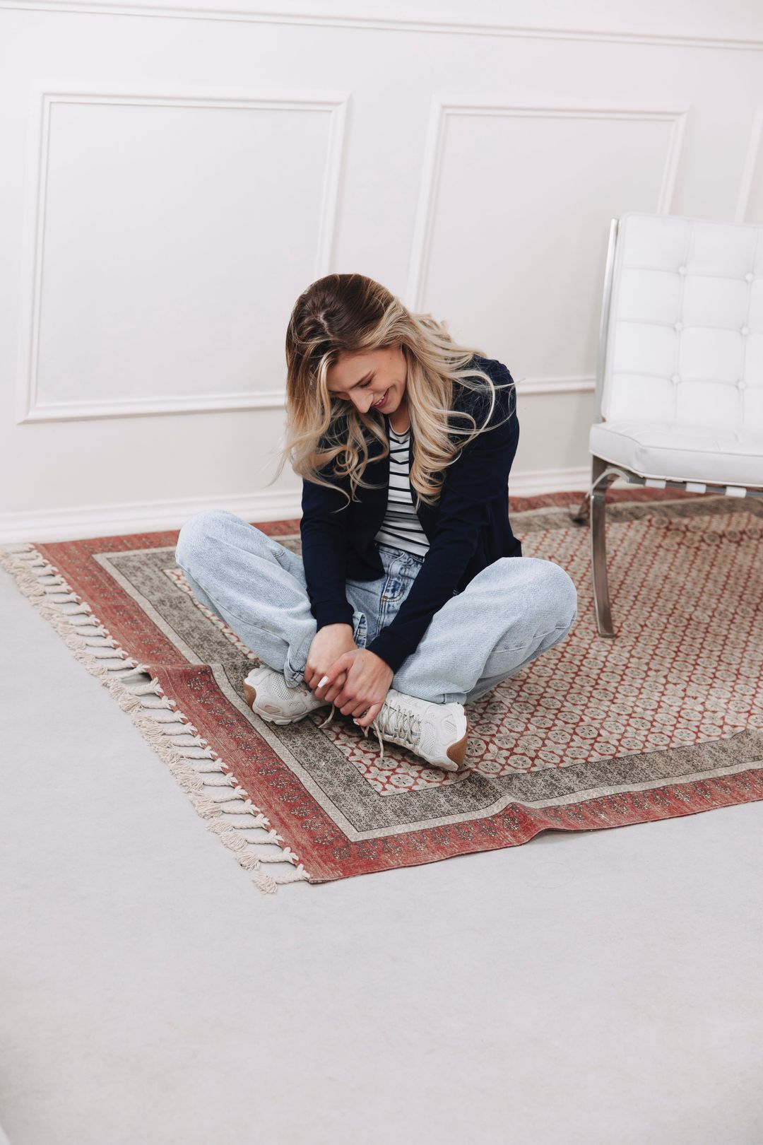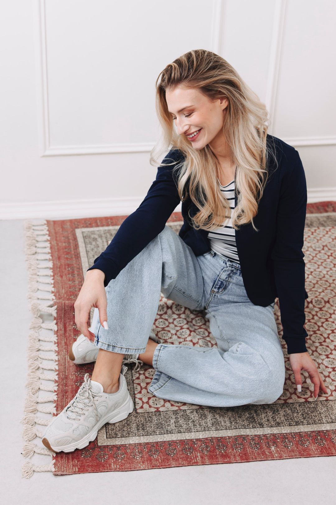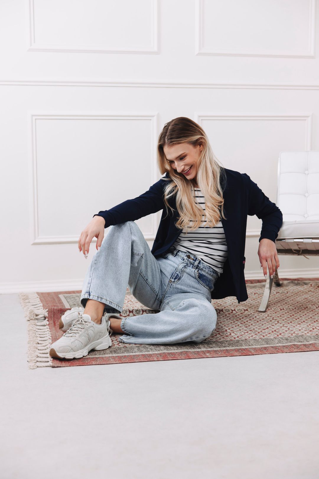 Pruhy, denim a perfektne strihané sako. To nie je len outfit, to je módny manifest, ktorý nikdy nestratí na sile.