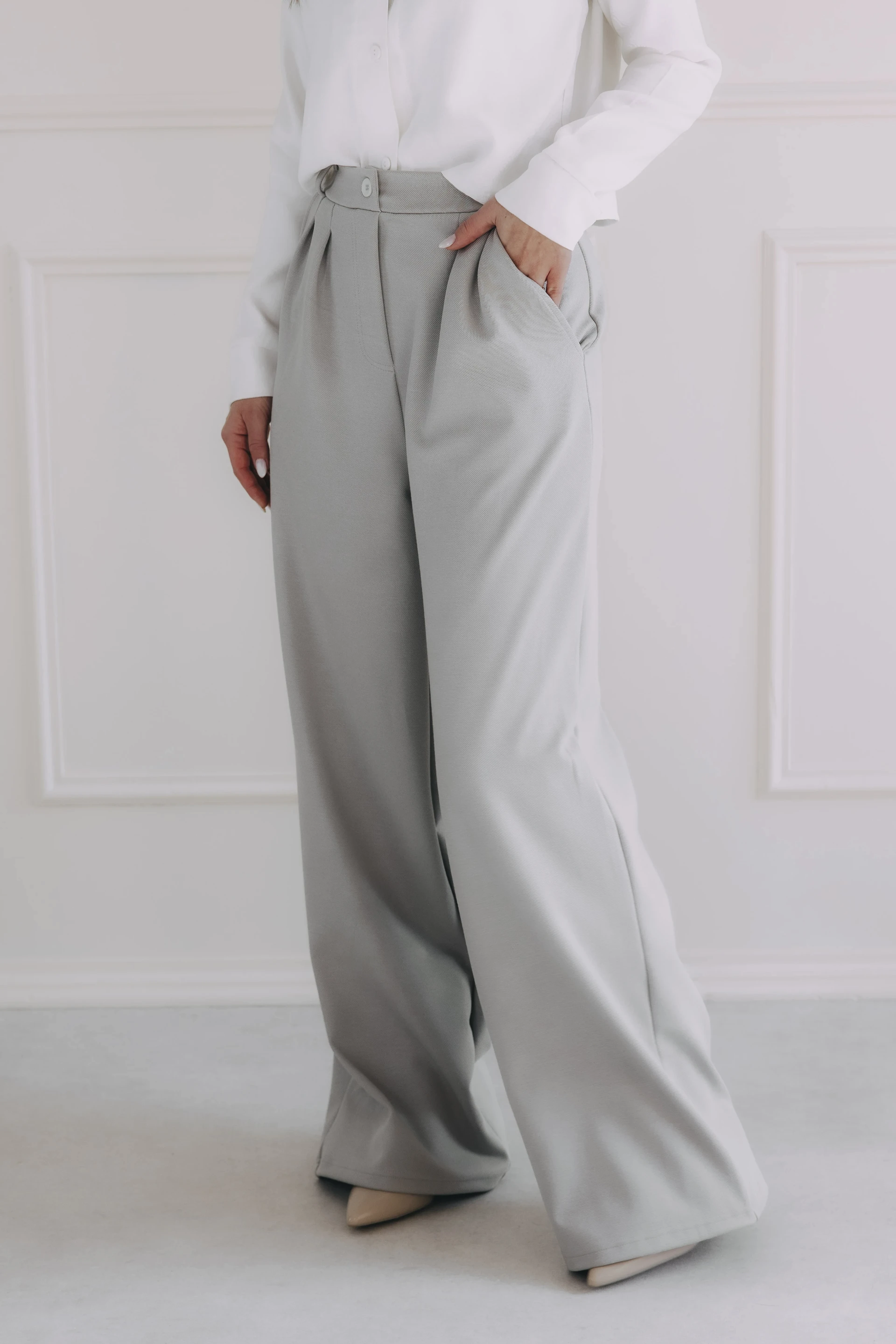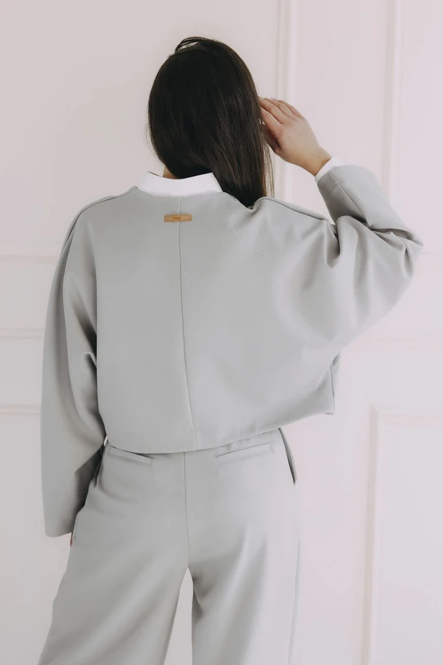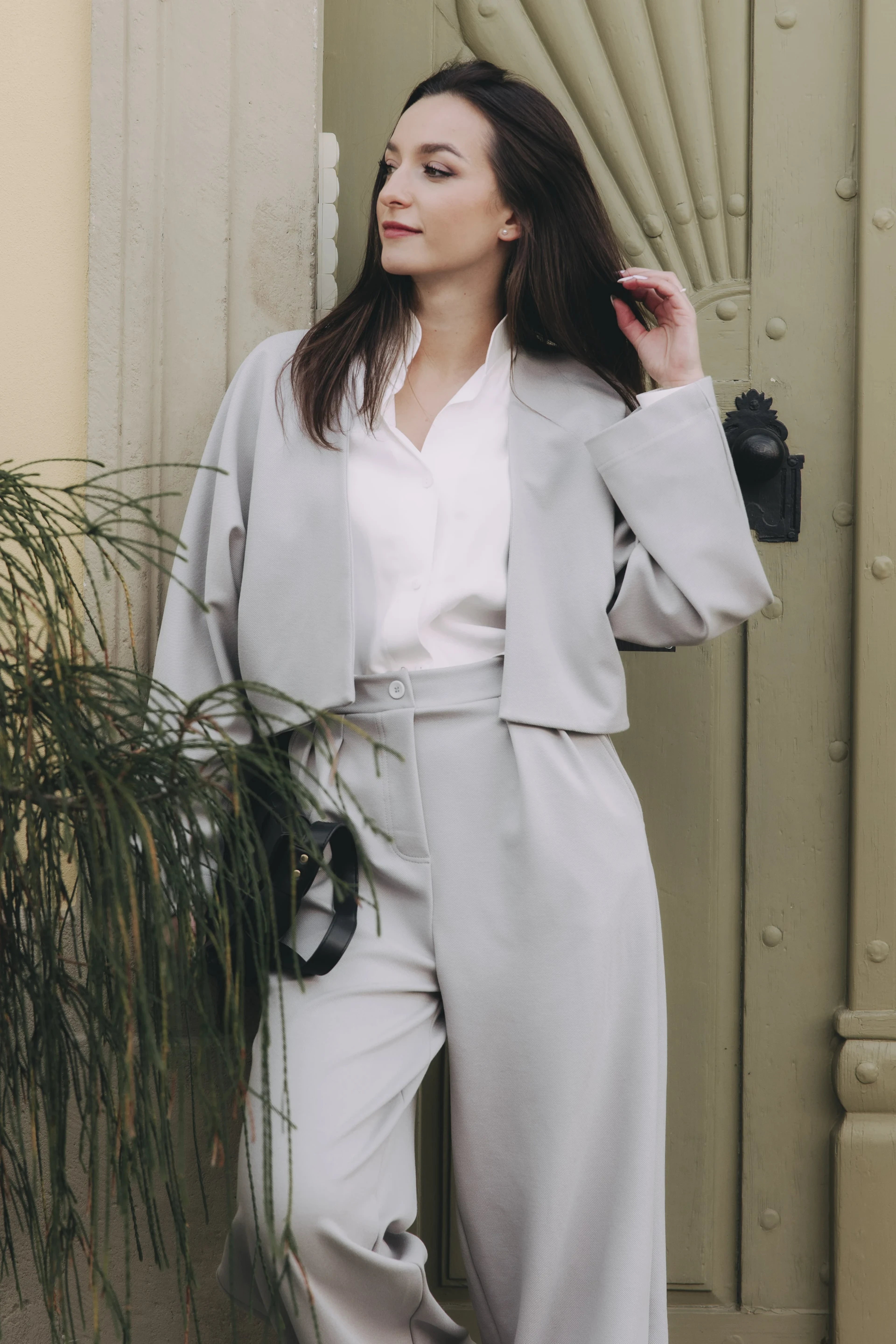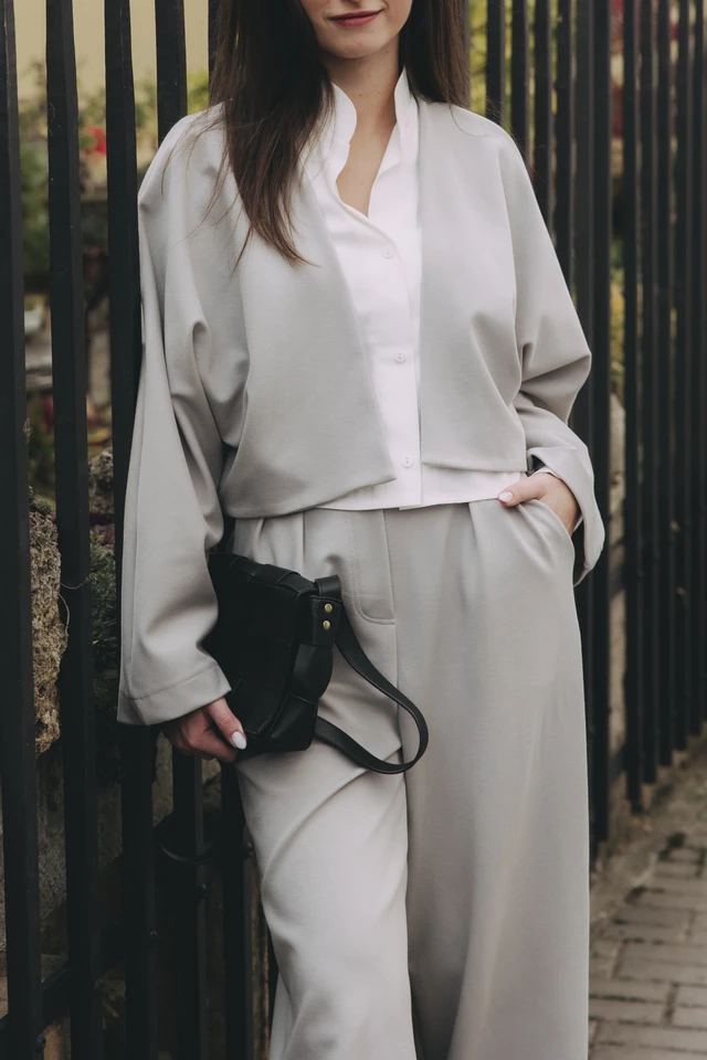 Komplet Amadu v ľadovo sivej je ako pokojné ráno v meste, keď sa svet ešte len prebúdza. Pôsobí čisto, sofistikovane a s každým pohybom dokazuje, že jednoduchosť môže byť v tento deň ten najväčší luxus.