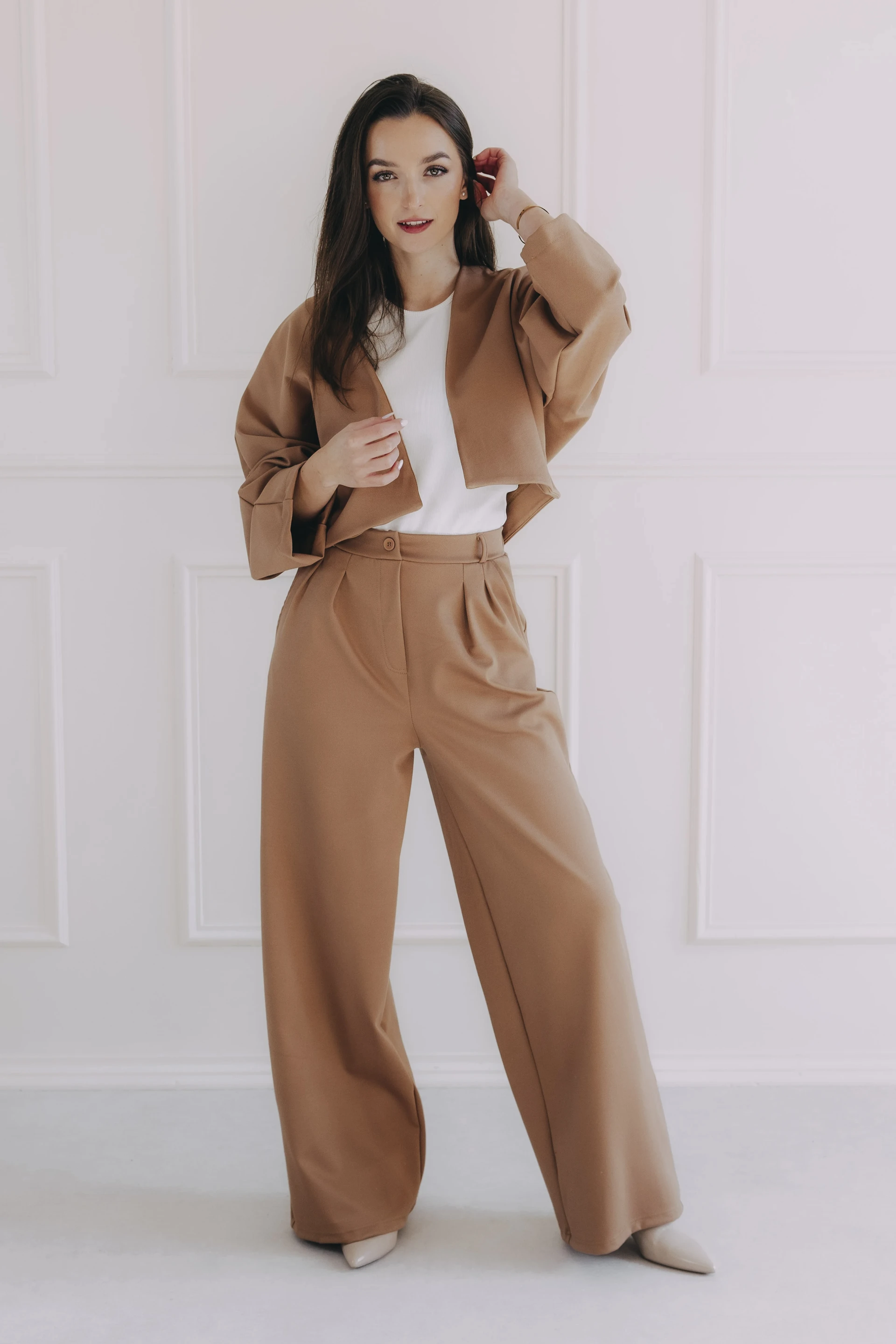 Široké nohavice plynule nadväzujú na blejzer, ktorý sa ladne nesie okolo tela – celok, ktorý nič nepredstiera, len dokonale funguje. Stačí pridať biely top, tričko alebo košeľu z kolekcie White Tee a celý outfit sa ešte viac rozžiari.