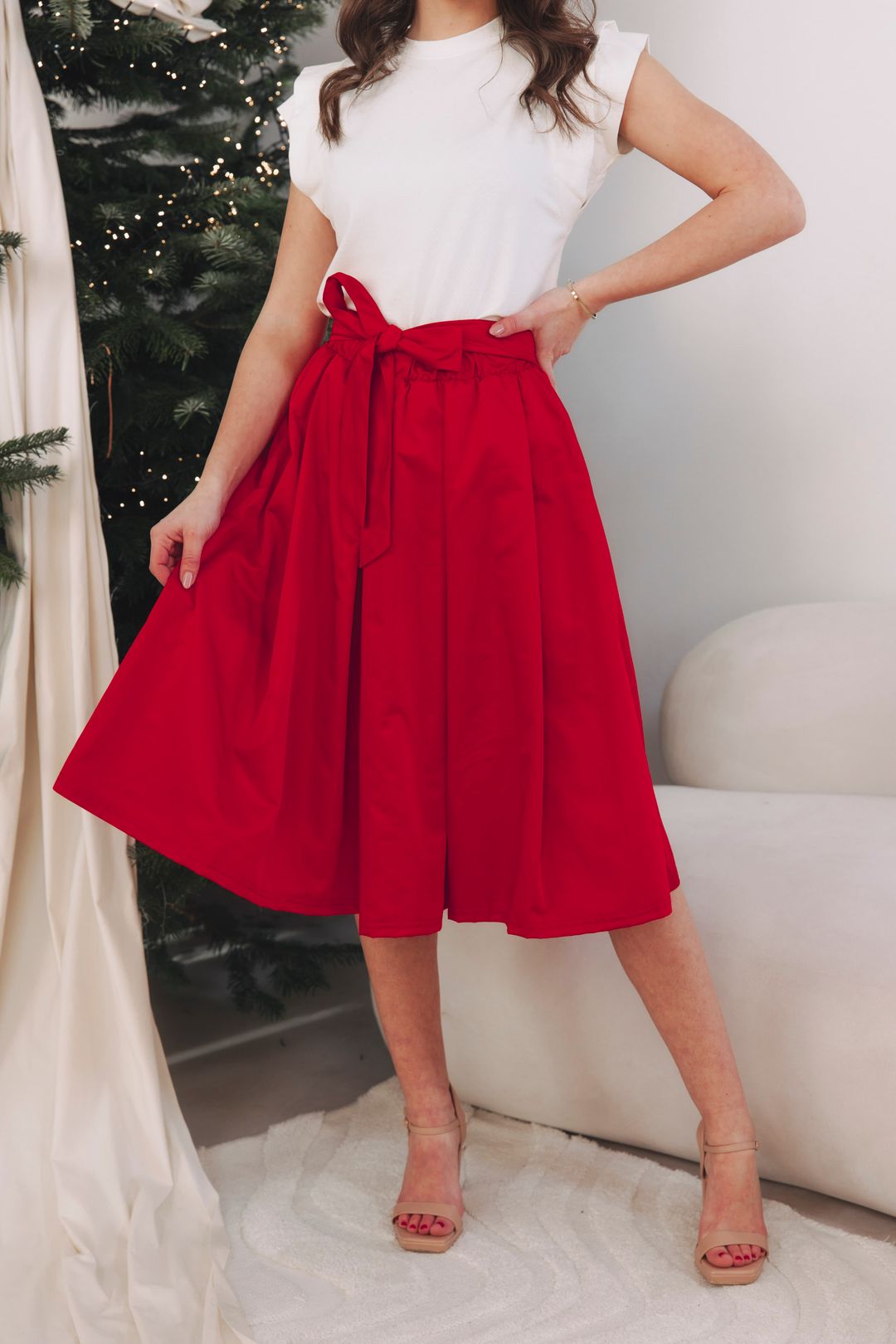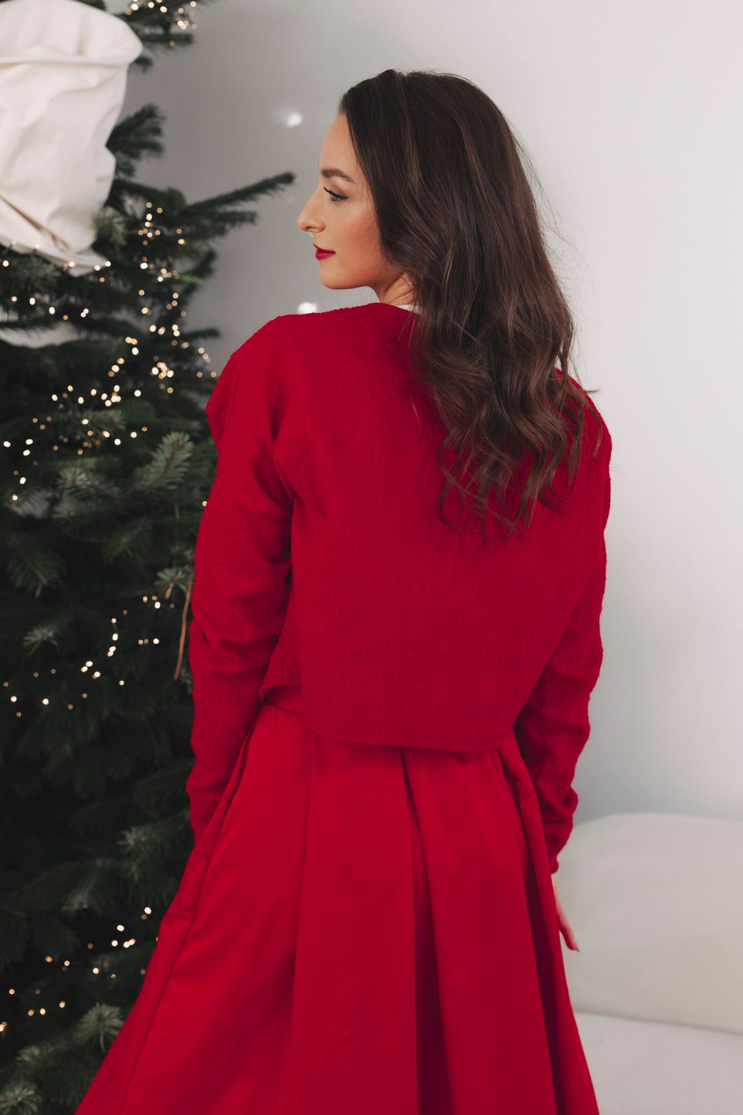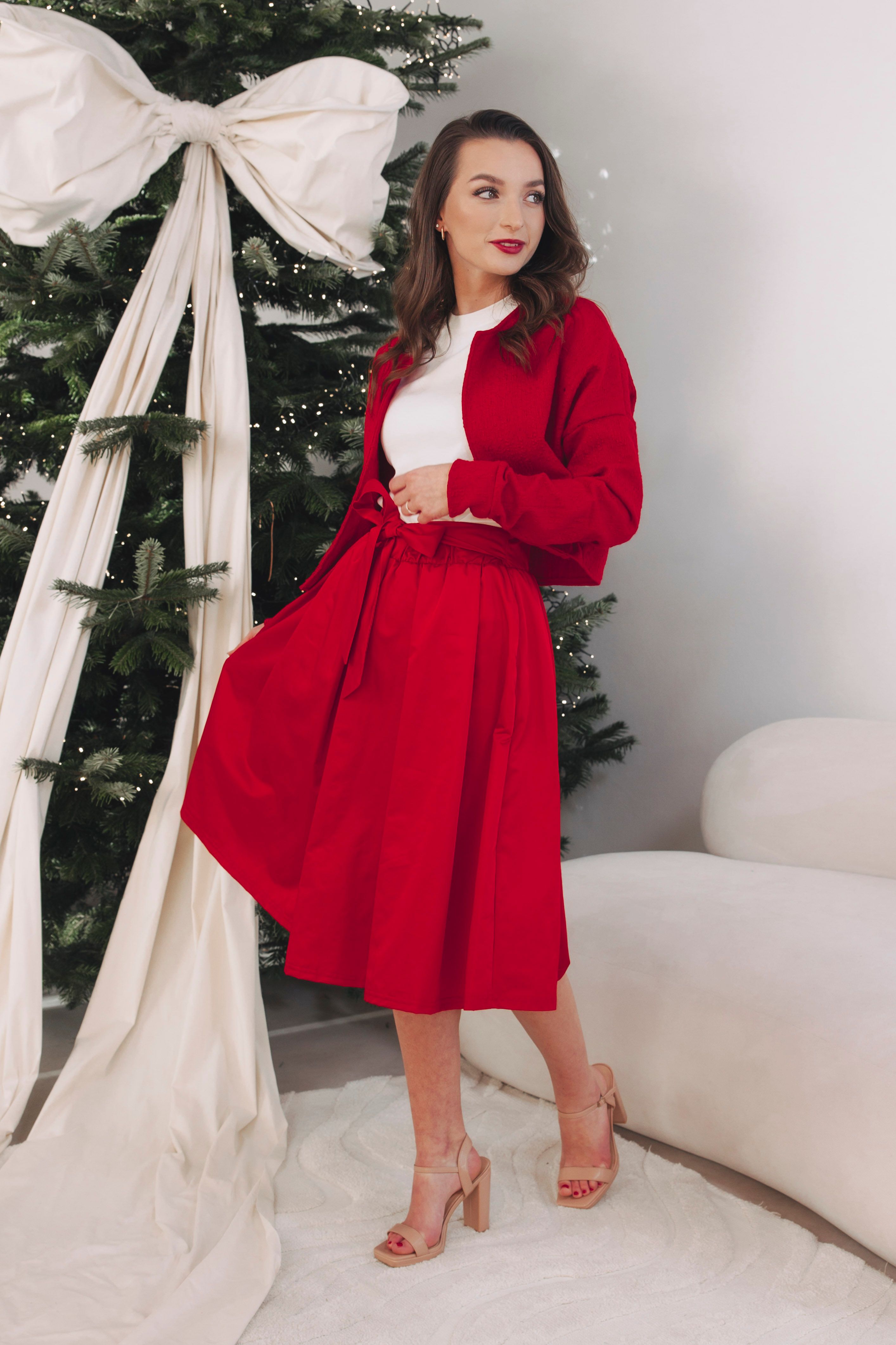 Nie je to len o tom, čo si oblečiete, ale ako sa v tom zmení celý večer. Sukňa Zuri Red sa pri chôdzi jemne vlní, akoby hrala svoju vlastnú vianočnú melódiu. Tričko Kimani White jej dáva čistý základ, no práve blejzer Leila Redrobí z outfitu výnimočný celok. Elegantný, výrazný a pripravený na chvíle, keď sa servíruje šampanské, tlieska sa po koncerte alebo vchádza do miestnosti plnej svetiel a rozhovorov. Červená nie je len farbou Vianoc, ale aj sebavedomia a radosti, ktorá patrí do každého slávnostného večera. Je to vaša odpoveď na pozvánku s dress code „festive chic“.